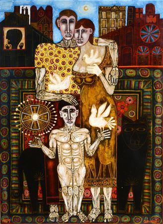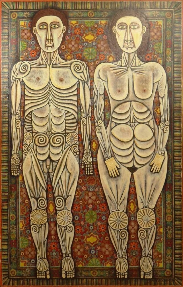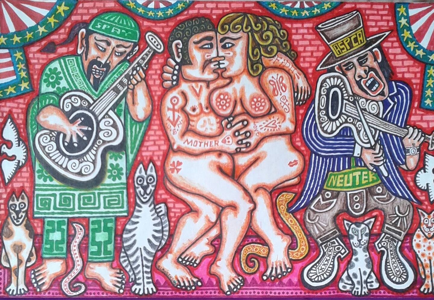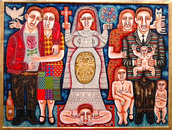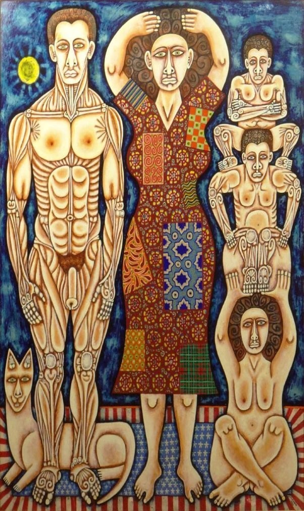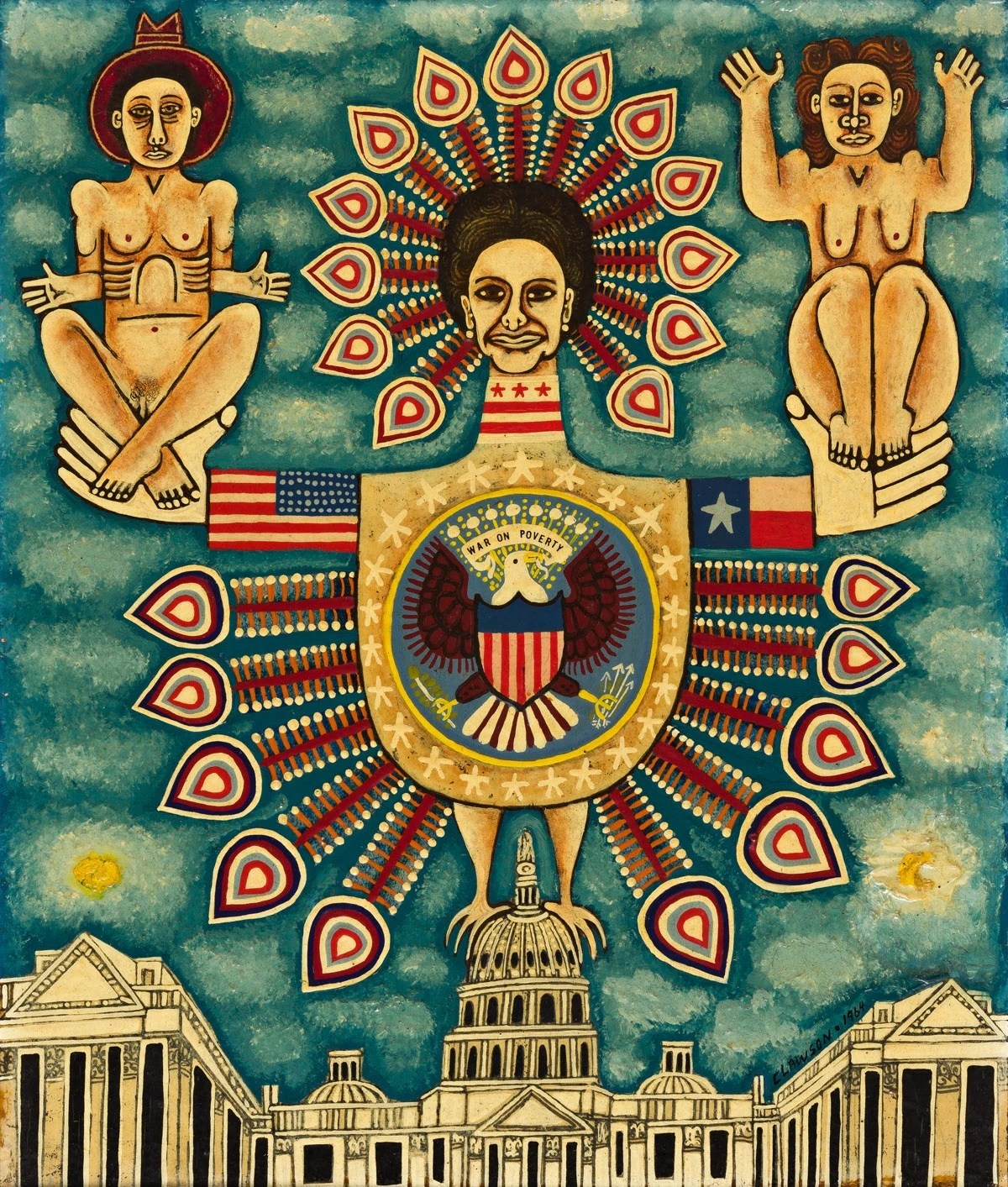 La obra de Rex Clawson (Dallas, Texas, USA, 1929-2007) está influenciada formalmente por el post impresionismo de Gauguin y Van Gogh, que conoció en un viaje juvenil a París, y por el arte tradicional de México, país en el que trabajó y vivió varios años. También deja su impronta en su pintura la obra cubista de Picasso y Braque. Su particular dibujo me recuerda los iconos medievales europeos. Su obra referencia fundamentalmente a temas sociales y políticos, con un aire irónico o satírico.