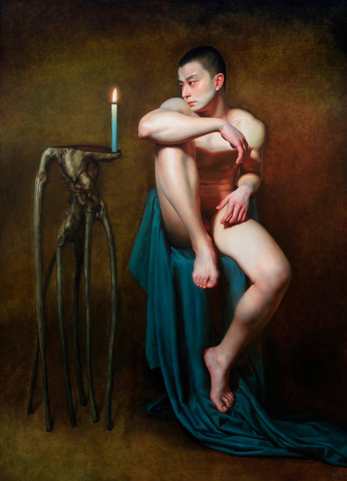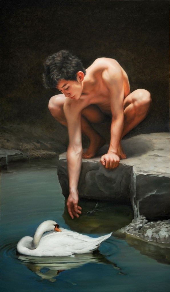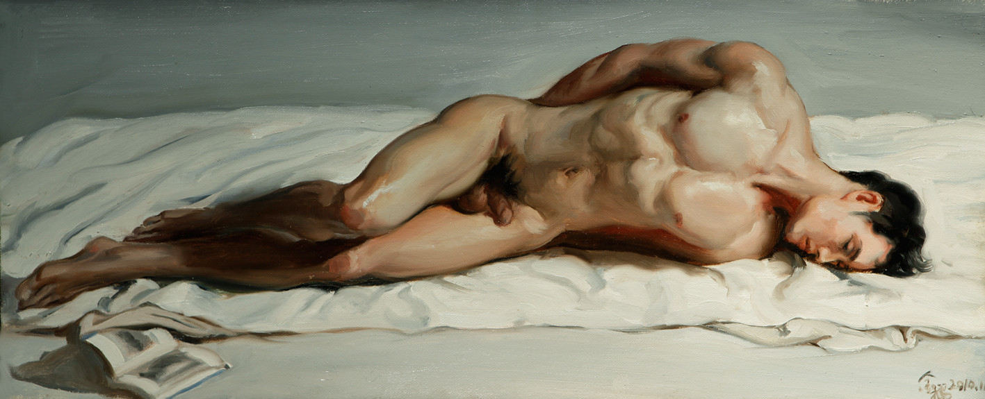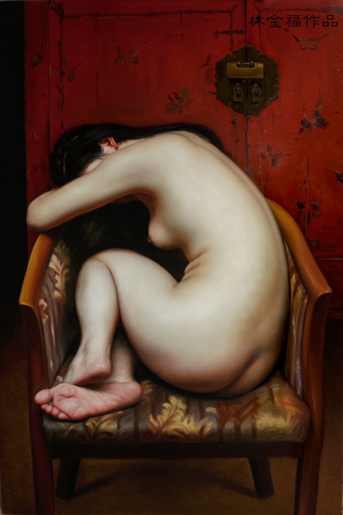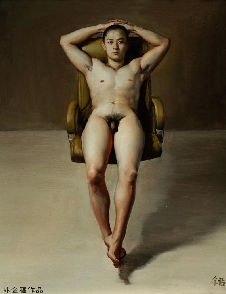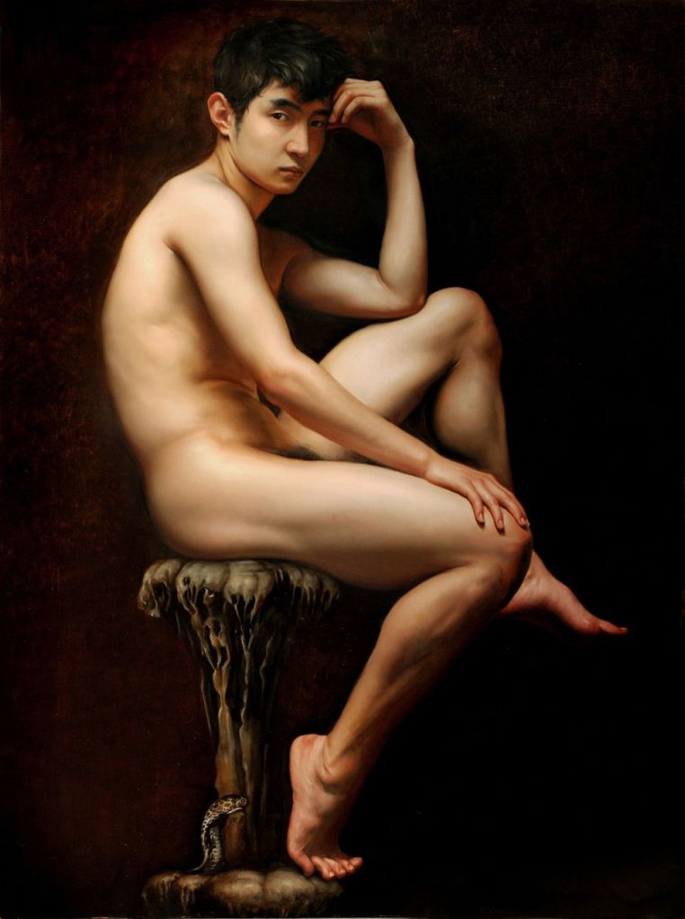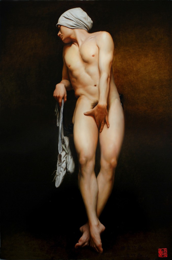 Lin Jinfu (Fujian, China, 1978) es un caso excepcional dentro del arte chino, al presentar una obra dominada por el desnudo masculino. Sus óleos, extraordinariamente realistas, parecen inspirarse en el barroco italiano y, al observarlos, nos viene a la cabeza la obra de Caravaggio. Las luces y colores de este artista y, en muchos casos, esos elementos de ambigüedad que confieren a las figuras un toque homoerótico, parecen traspasar la barrera del lugar y tiempo, para definir un nuevo hombre chino. Por mantener un poco esa idea neobarroca, les sugiero una comparativa con la obra – más dramática – de Roberto Ferri.