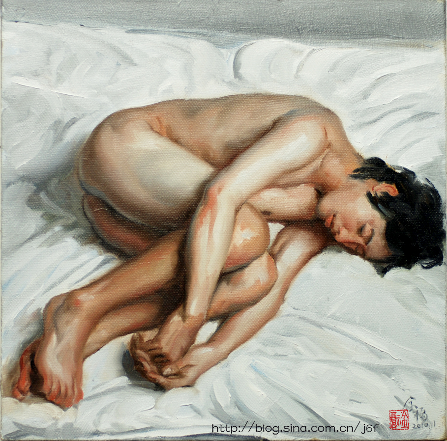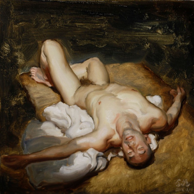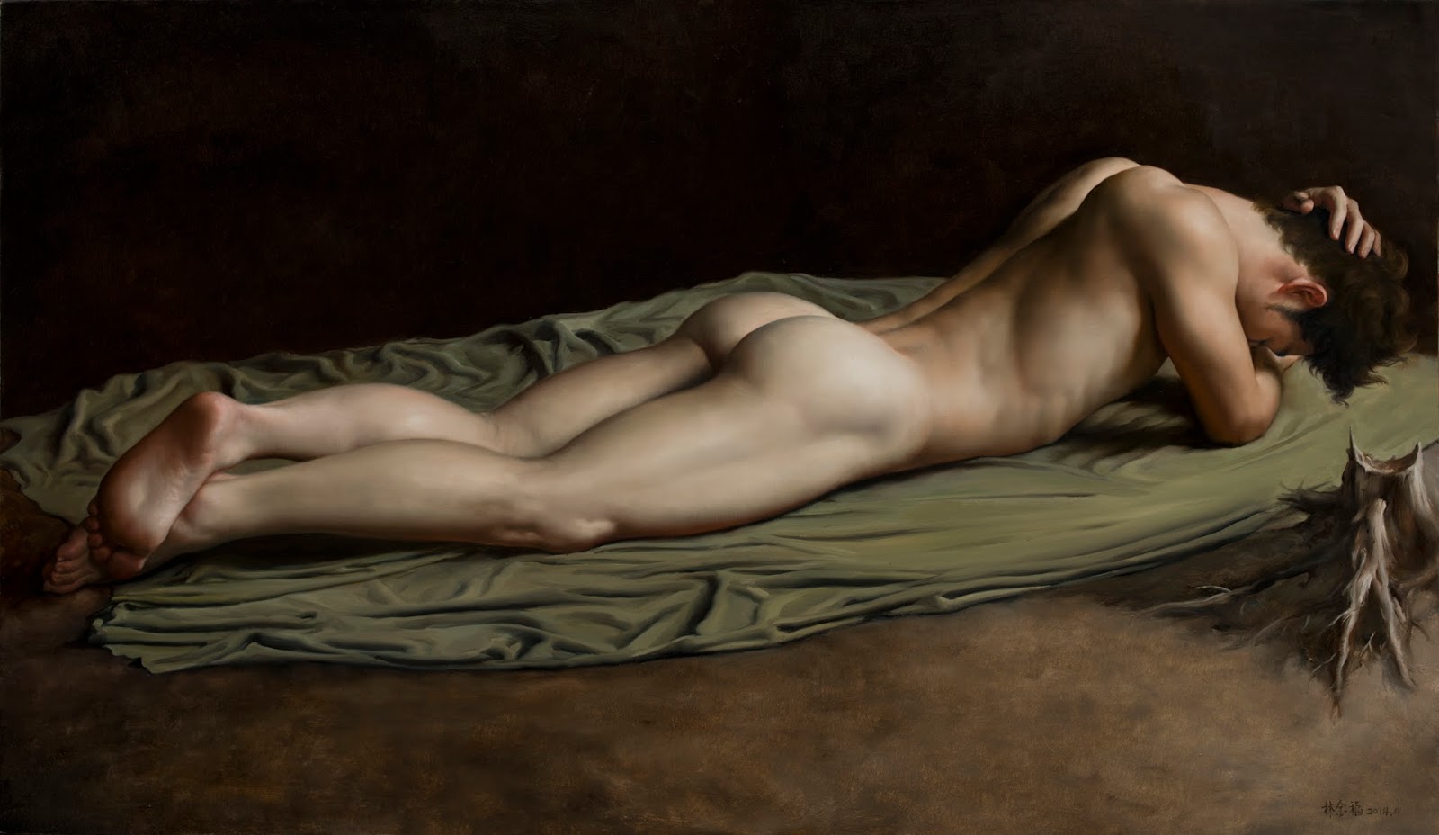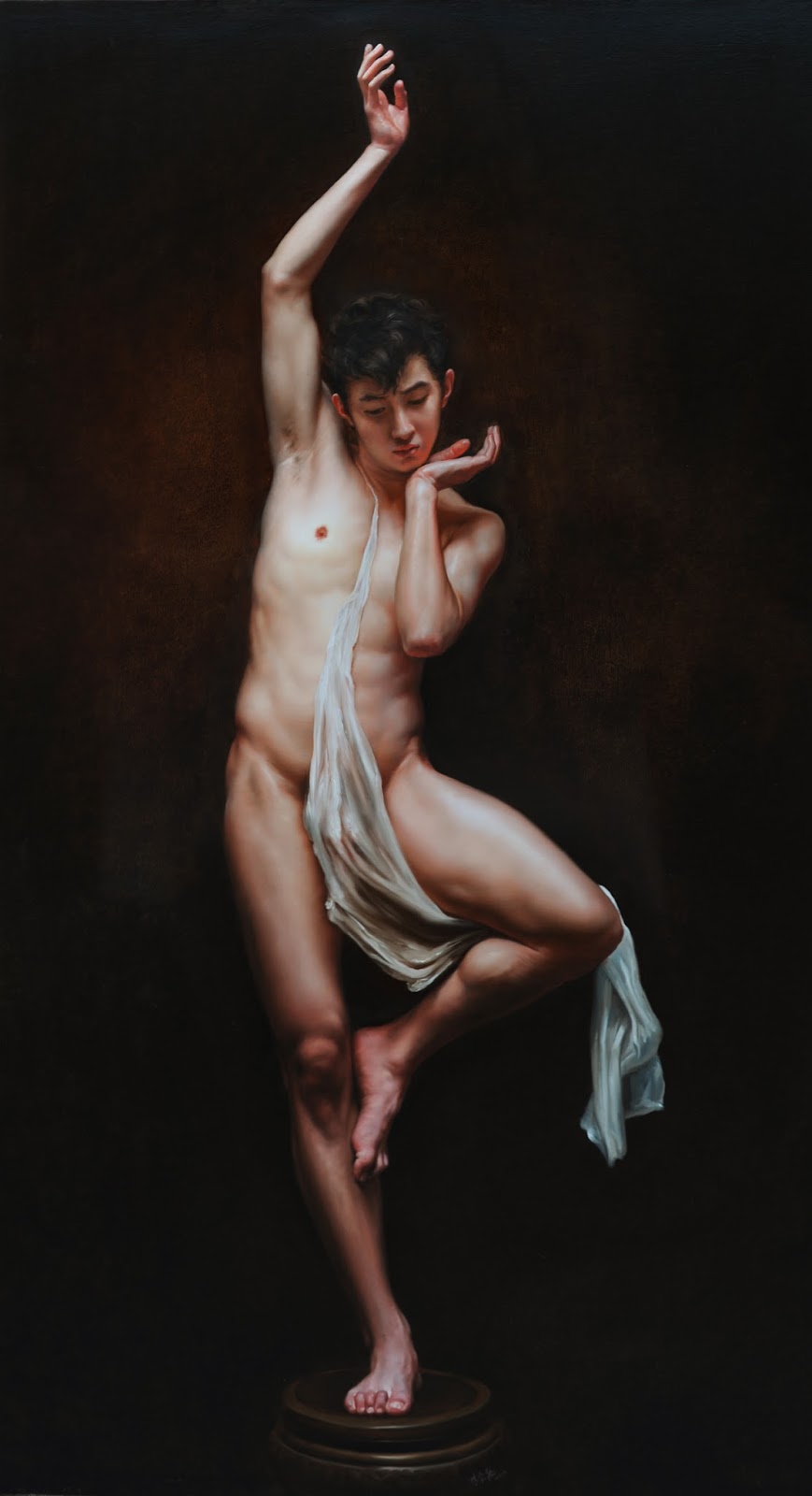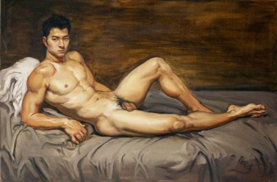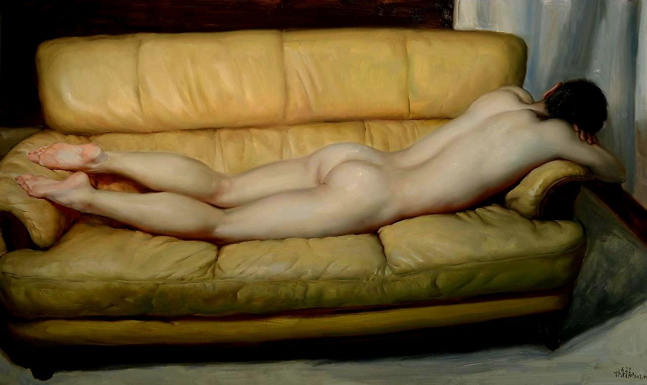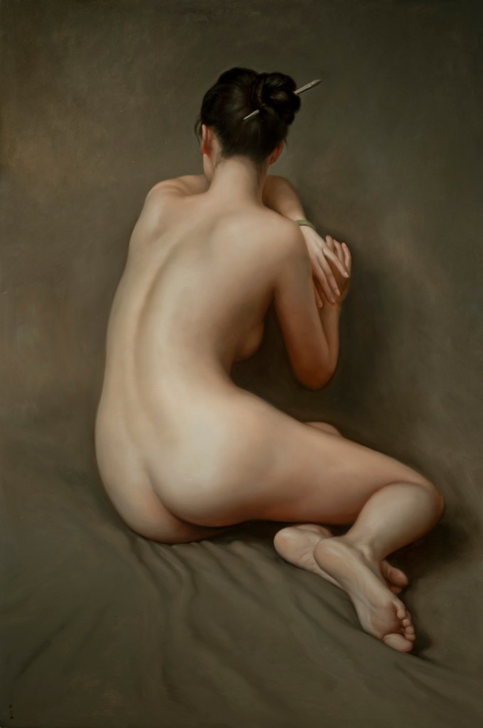 Lin Jinfu (Fujian, China, 1978) es un caso excepcional dentro del arte chino, al presentar una obra dominada por el desnudo masculino. Sus óleos, extraordinariamente realistas, parecen inspirarse en el barroco italiano y, al observarlos, nos viene a la cabeza la obra de Caravaggio. Las luces y colores de este artista y, en muchos casos, esos elementos de ambigüedad que confieren a las figuras un toque homoerótico, parecen traspasar la barrera del lugar y tiempo, para definir un nuevo hombre chino. Por mantener un poco esa idea neobarroca, les sugiero una comparativa con la obra – más dramática – de Roberto Ferri.