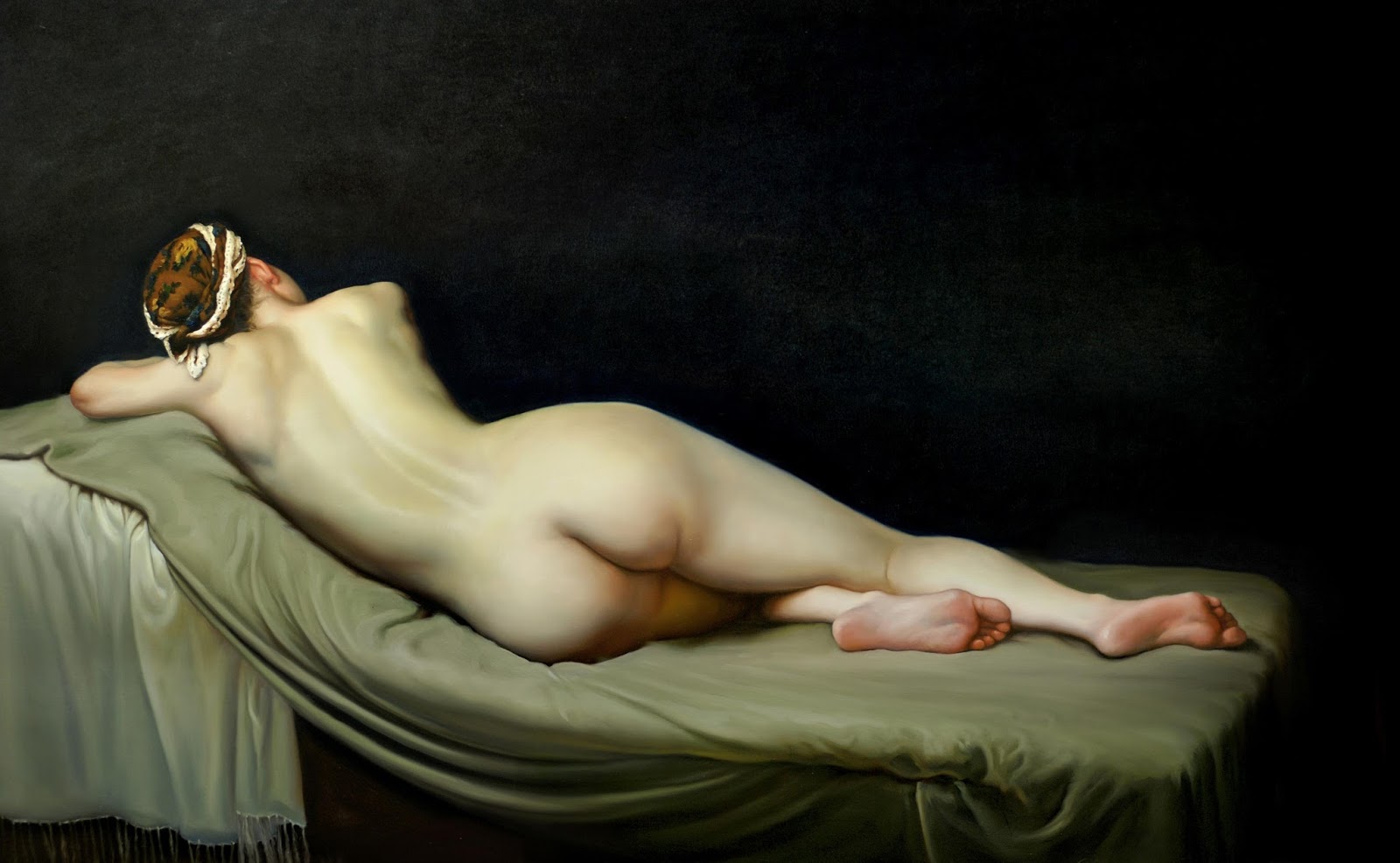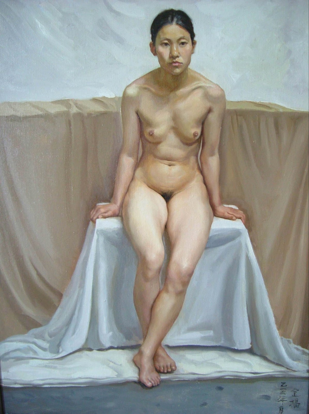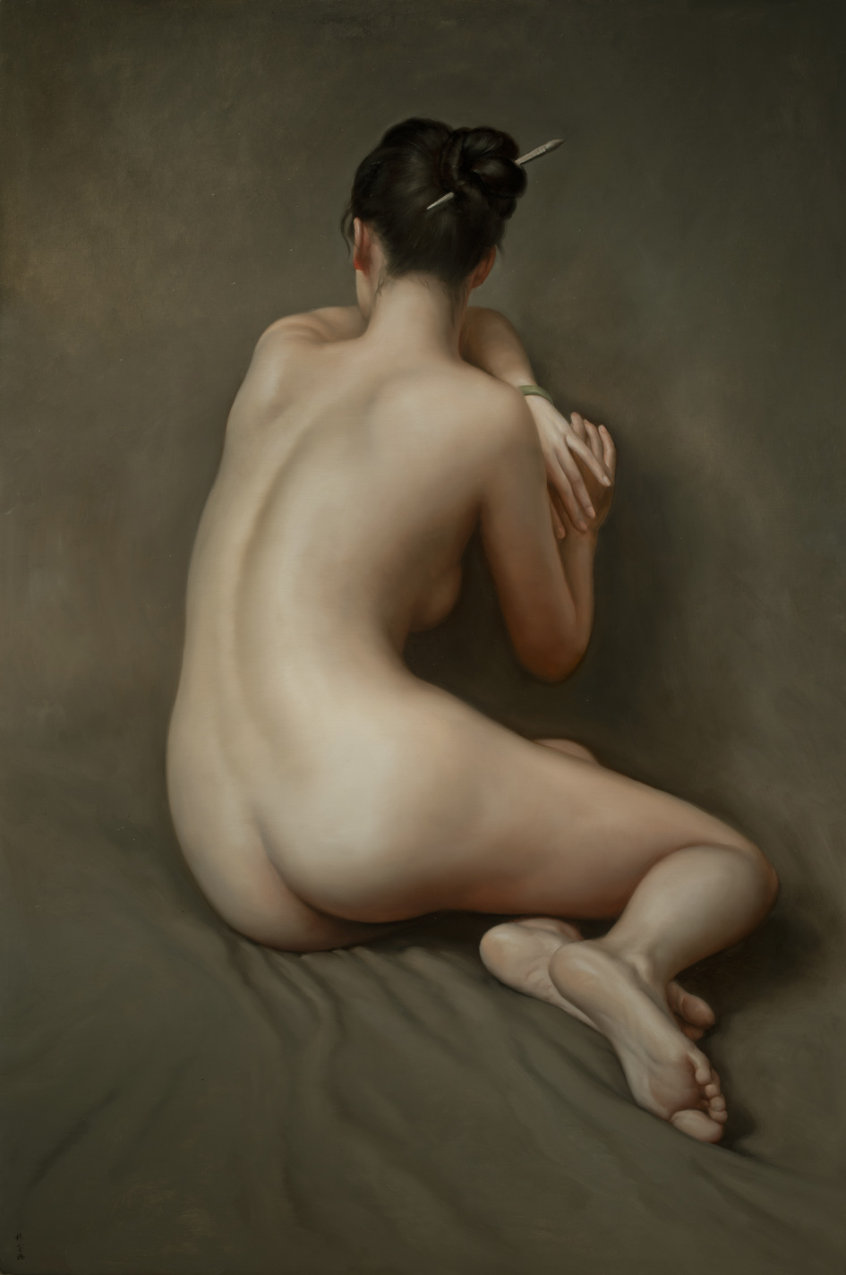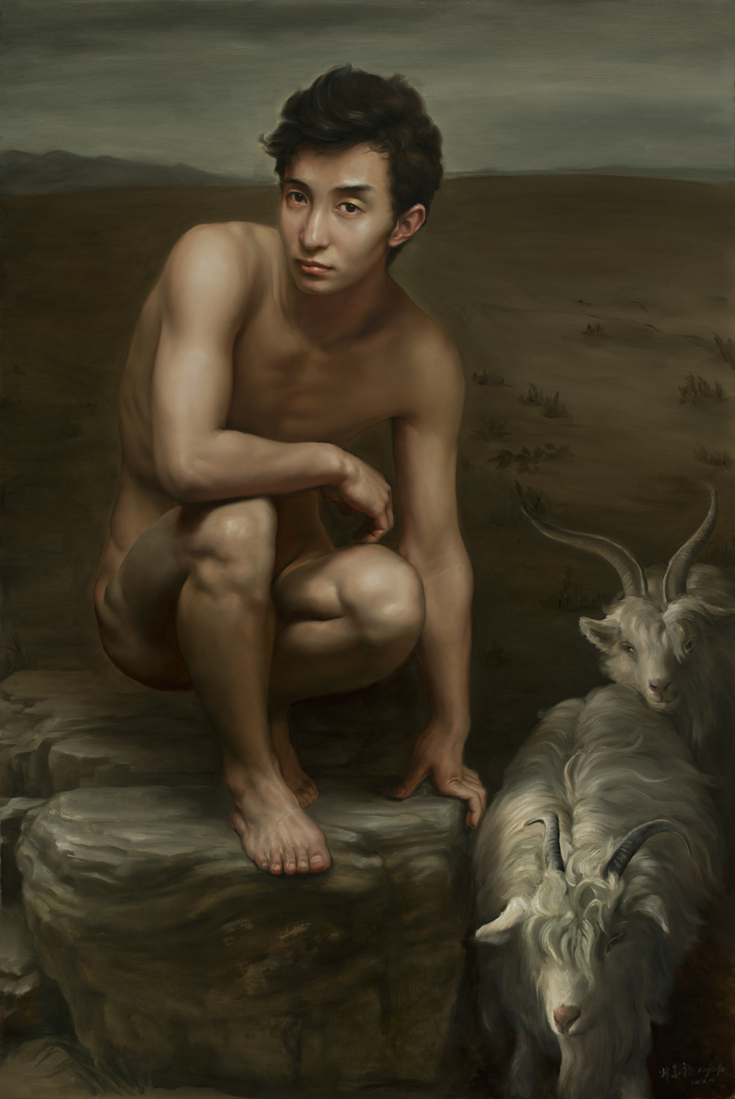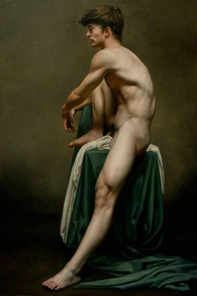 Lin Jinfu (Fujian, China, 1978) es un caso excepcional dentro del arte chino, al presentar una obra dominada por el desnudo masculino. Sus óleos, extraordinariamente realistas, parecen inspirarse en el barroco italiano y, al observarlos, nos viene a la cabeza la obra de Caravaggio. Las luces y colores de este artista y, en muchos casos, esos elementos de ambigüedad que confieren a las figuras un toque homoerótico, parecen traspasar la barrera del lugar y tiempo, para definir un nuevo hombre chino. Por mantener un poco esa idea neobarroca, les sugiero una comparativa con la obra – más dramática – de Roberto Ferri.