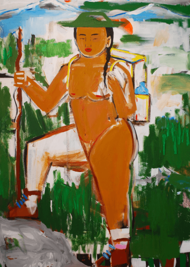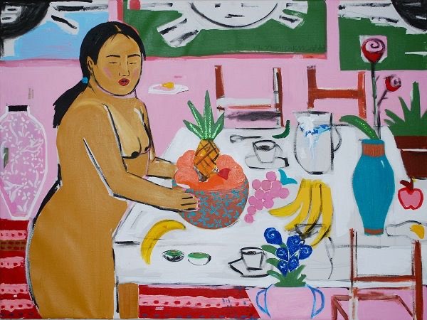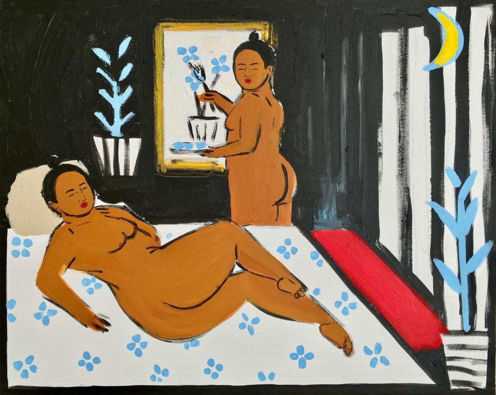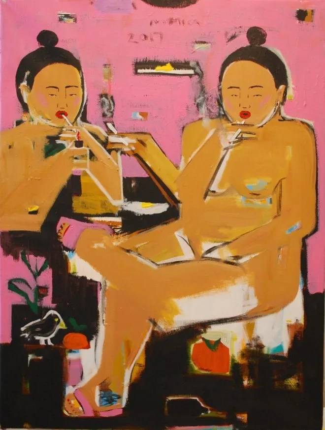 Mónica Kim Garza (Alamogordo, Nuevo México, USA, 1988), de padre coreano y madre mexicana, nos plantea una obra con una etnicidad ambigua. La mujer – empoderada – centra toda su atención, identificando miradas, deseos y sexualidad de un modo que se opone a la rígida heteronormalidad tradicional y acorde a los postulados del postfeminismo. Sus colores vivos y planos parecen referenciarnos a un arte post-pop, y las formas a Gauguin y Matisse.