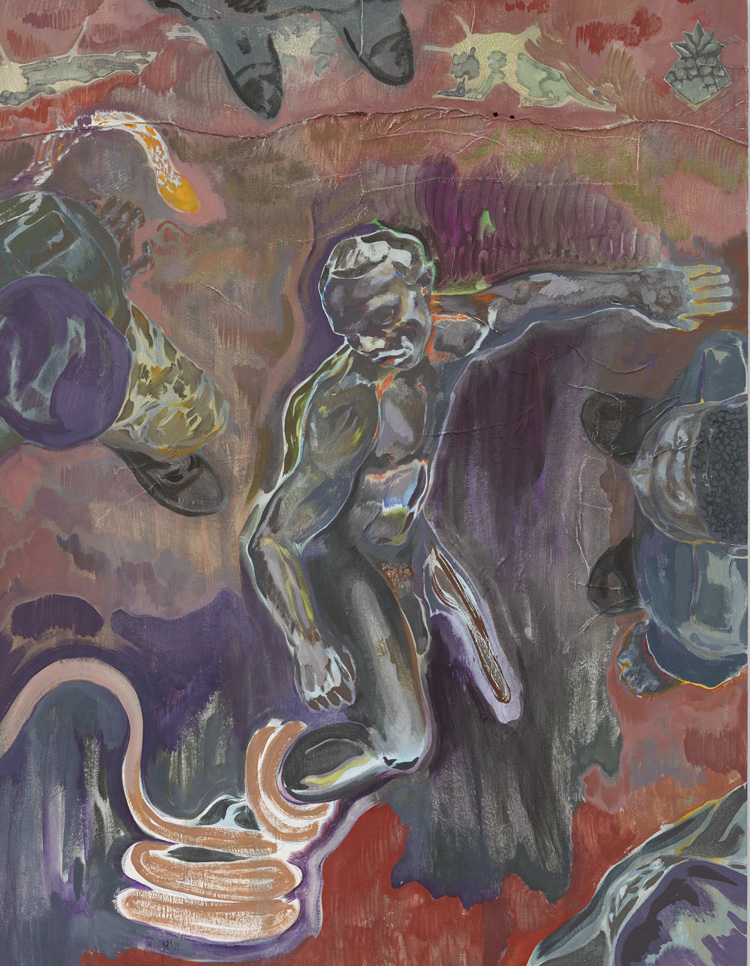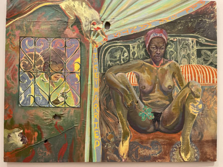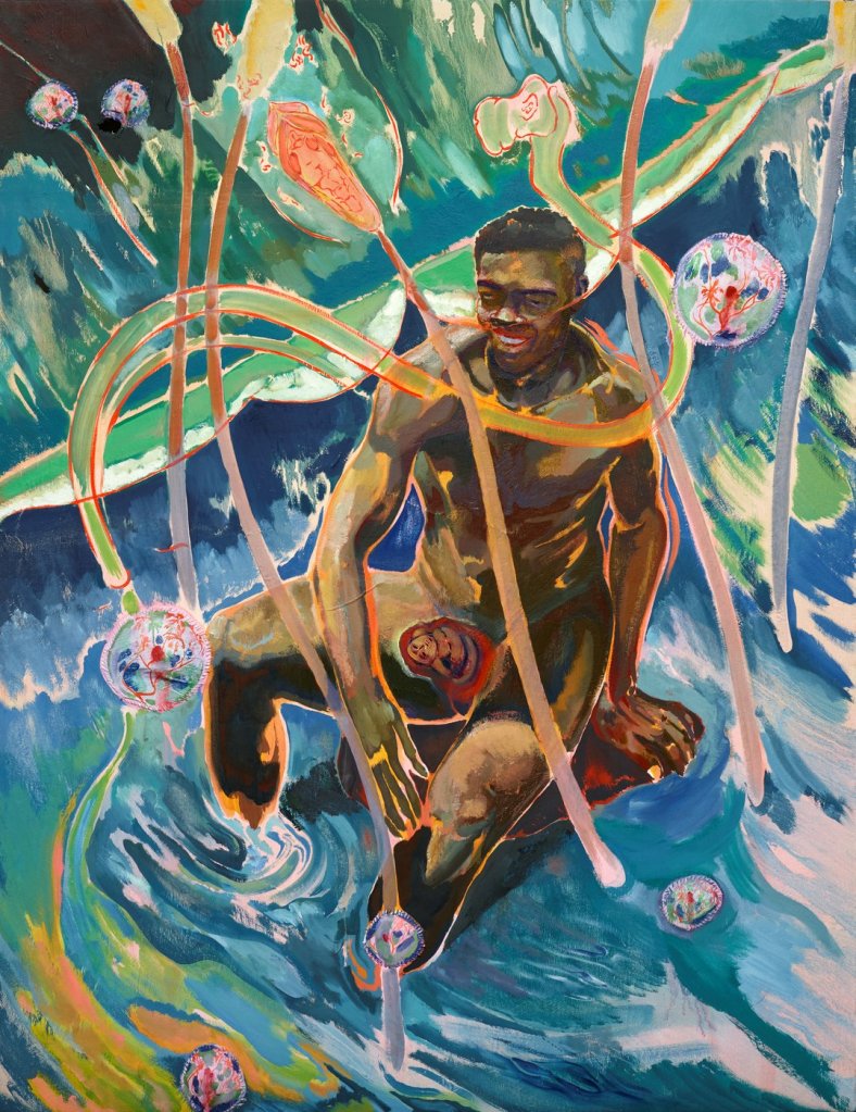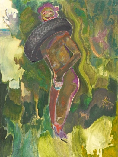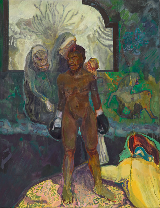 Michael Armitage (Nairobi, Kenia, 1984) es un artista que, pese a vivir en Londres, tiene como referencia permanente su país natal. Su obra es enérgica, muestra las marcas del pincel, la superposición de capas que dejan entrever ocasionalmente las capas inferiores, y gotas de pintura que le dan un aspecto abstracto. Su lirismo es crítico con una sociedad que ve – según comenta – como un británico keniano que creció al mismo tiempo dentro de la cultura kikuyu y la cultura británica. En el artículo citado, una amplia entrevista con Toby Kamps que me parece de lectura imprescindible para analizar debidamente su obra, se comenta: