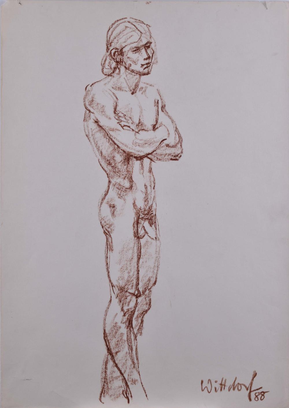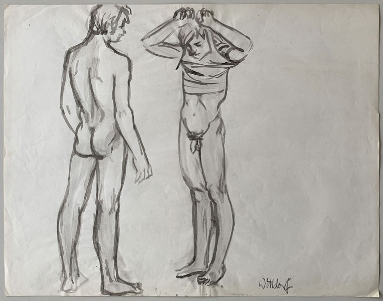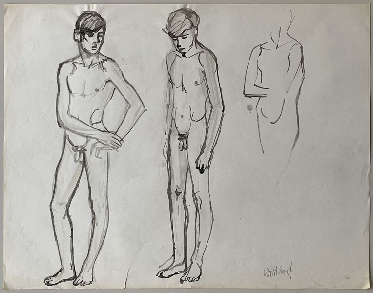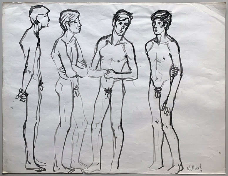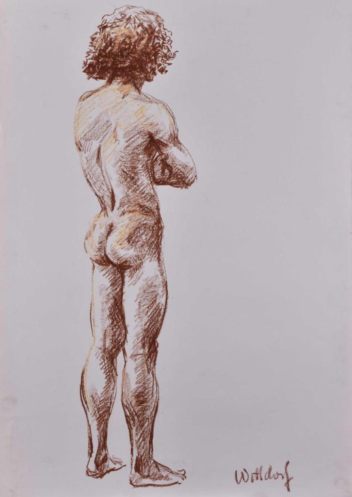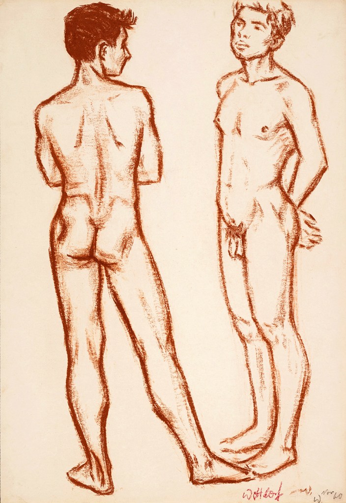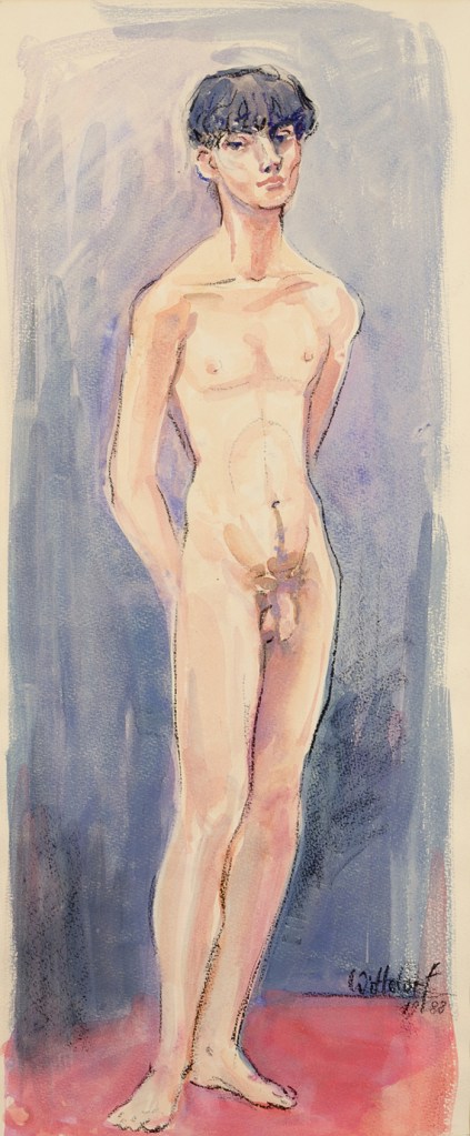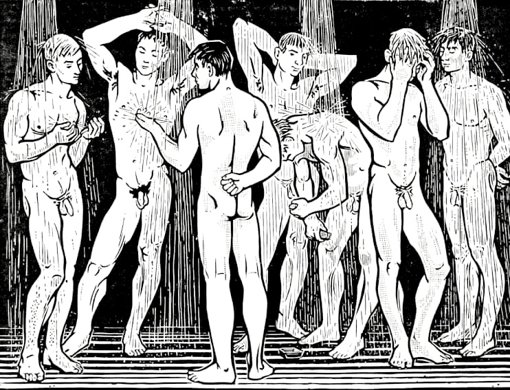 Intentaré aclarar un poco este título. Ostland es la denominación del Comisariado Imperial de las Tierras del Este, zona ocupada por los nazis en el periodo 1941-1945 y que comprendía los Paises Bálticos, Bielorrusia y algunas regiones de Polonia y Rusia. La etiqueta «Tom de Ostland» pretende establecer una analogía con «Tom de Finlandia«, aunque me parece un poco exagerada. Podemos establecer un cierto paralelismo entre los grabados de Jürgen Wittdorf (Karlsruhe, Alemania, 1932-2018) – realizados en una Alemania comunista fuertemente homófoba – y la obra del icono gay. Pese a ello Wittdorf es sexualmente mucho menos explícito, y grabados como «la ducha» nunca intentaron escandalizar. El conjunto de su producción artística circuló con bastante facilidad y sus jovenes deportistas no parecen tener mucha relación con lo que nos mostró el beefcake americano.
