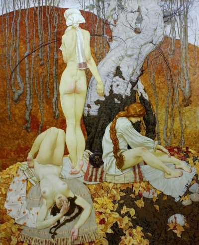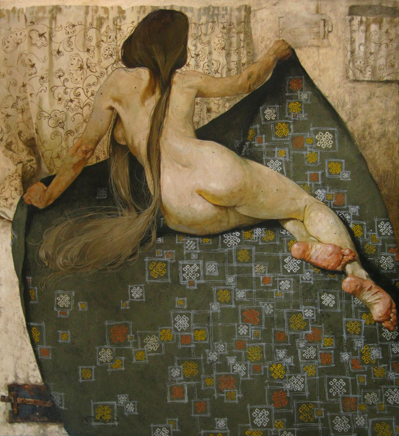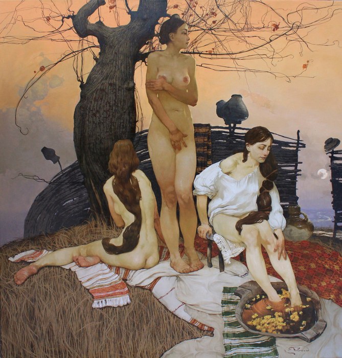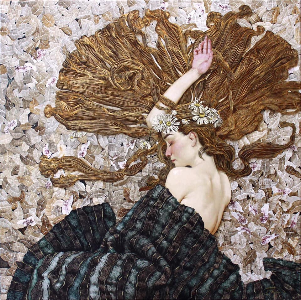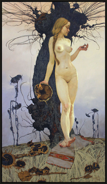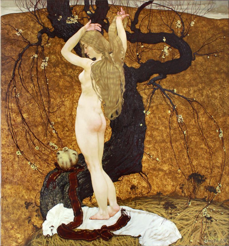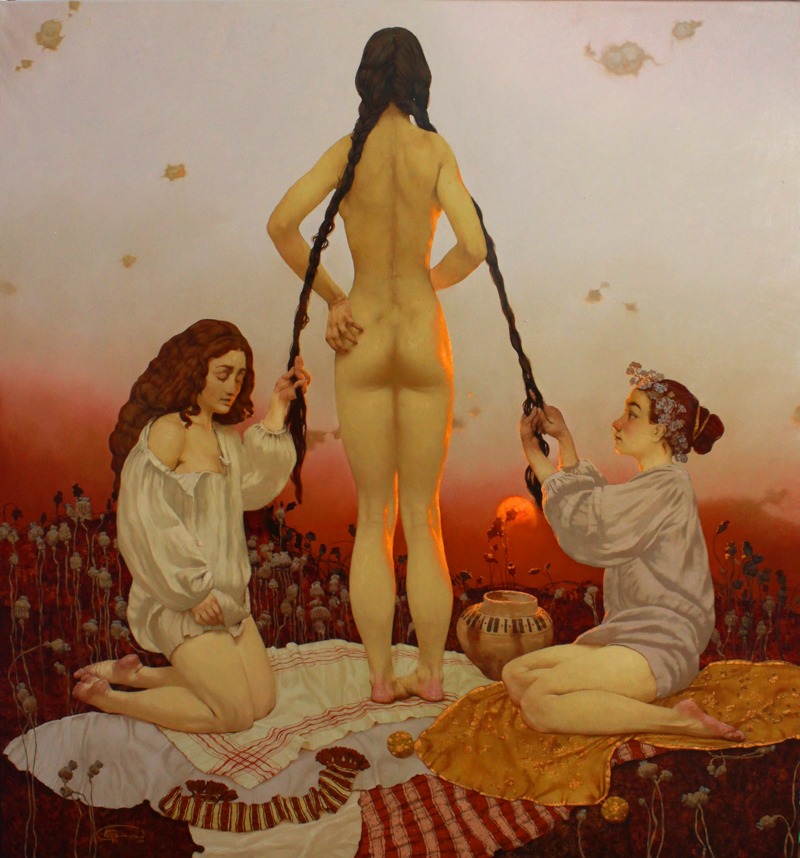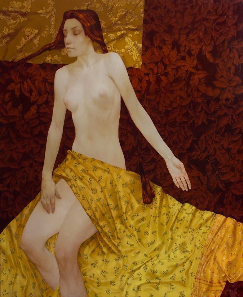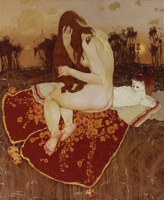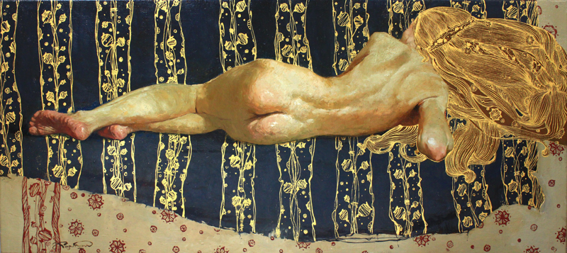 Conozco, desde hace algún tiempo, la obra de Artem Rogowoi (Jarkov, Ucrania, 1988). No la he traído aquí antes por un intento infructuoso de catalogarla y establecer relaciones e influencias de/sobre otros artistas. Artem declara buscar la belleza y centra sus trabajos en la figura de la mujer. Sus pinturas me recuerdan la estética simbolista y art-decó por su estilización de la figura de la mujer y la ornamentación de los fondos.