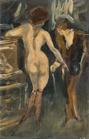 Interior con mujer desnuda de pié y hombre con bastón – Alphons Walde