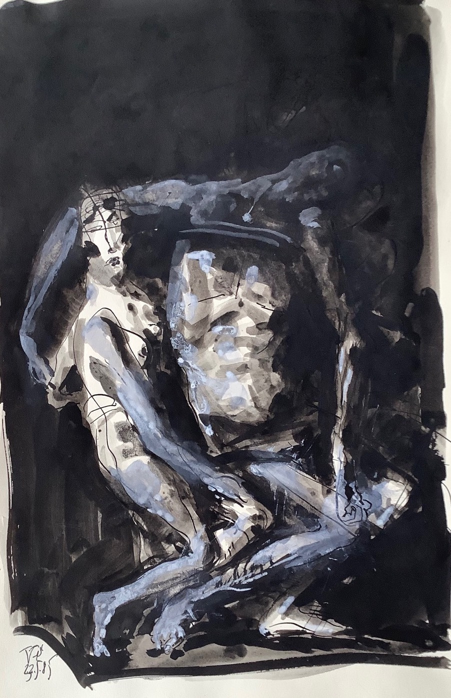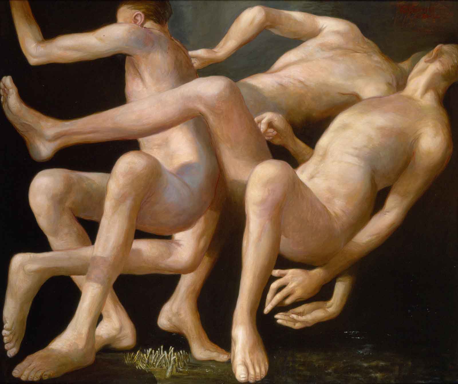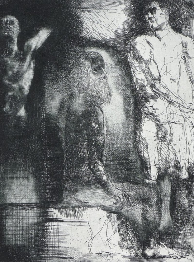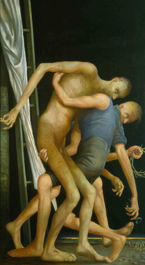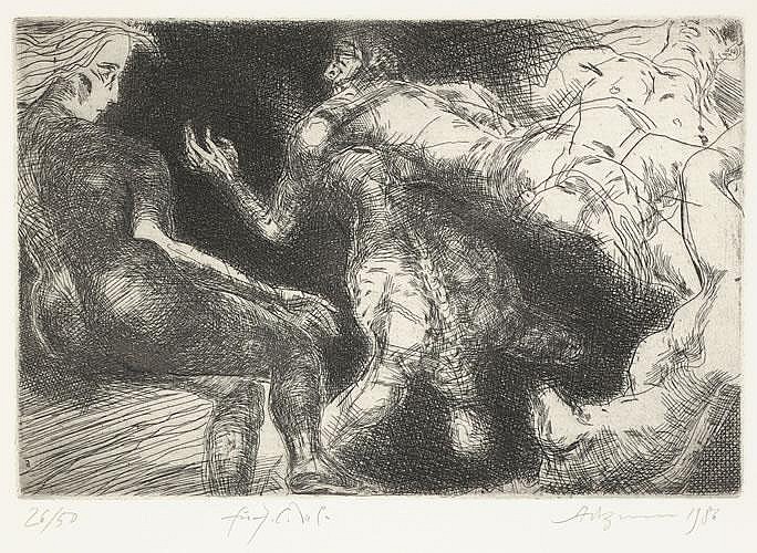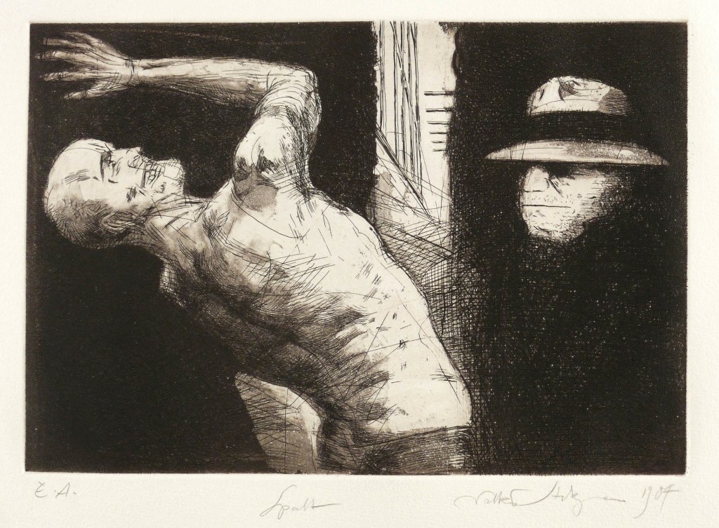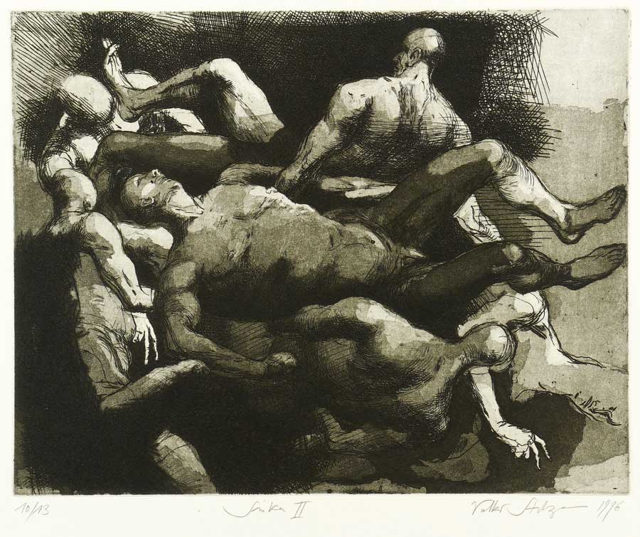 Volker Stelzmann (Dresde, Alemania, 1940) fue un pintor y artista gráfico que vivió directamente el conflicto de la división de las dos Alemanias, el bombardeo de su ciudad natal en 1945 del que sobrevivió, los conflictos sociales de la República Democrática Alemana con una juventud desencantada y ocasionalmente violenta, su huída a «Occidente». Se palpa siempre un fuerte drama en este artista que nos recuerda el expresionismo de Otto Dix y que, como éste, no juzga los hechos, sólo los muestra.