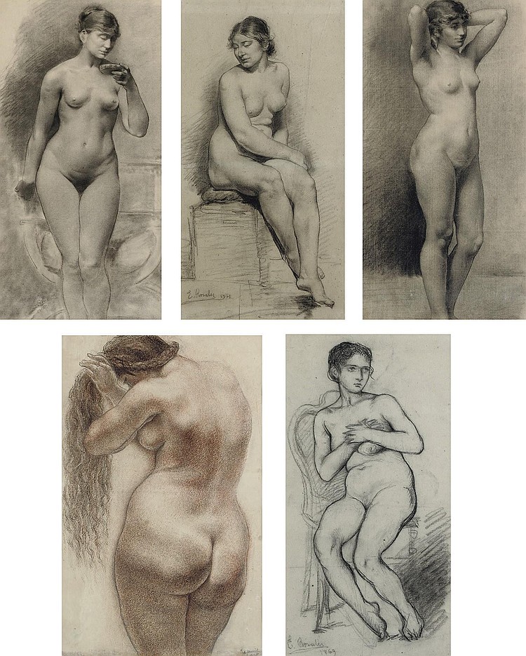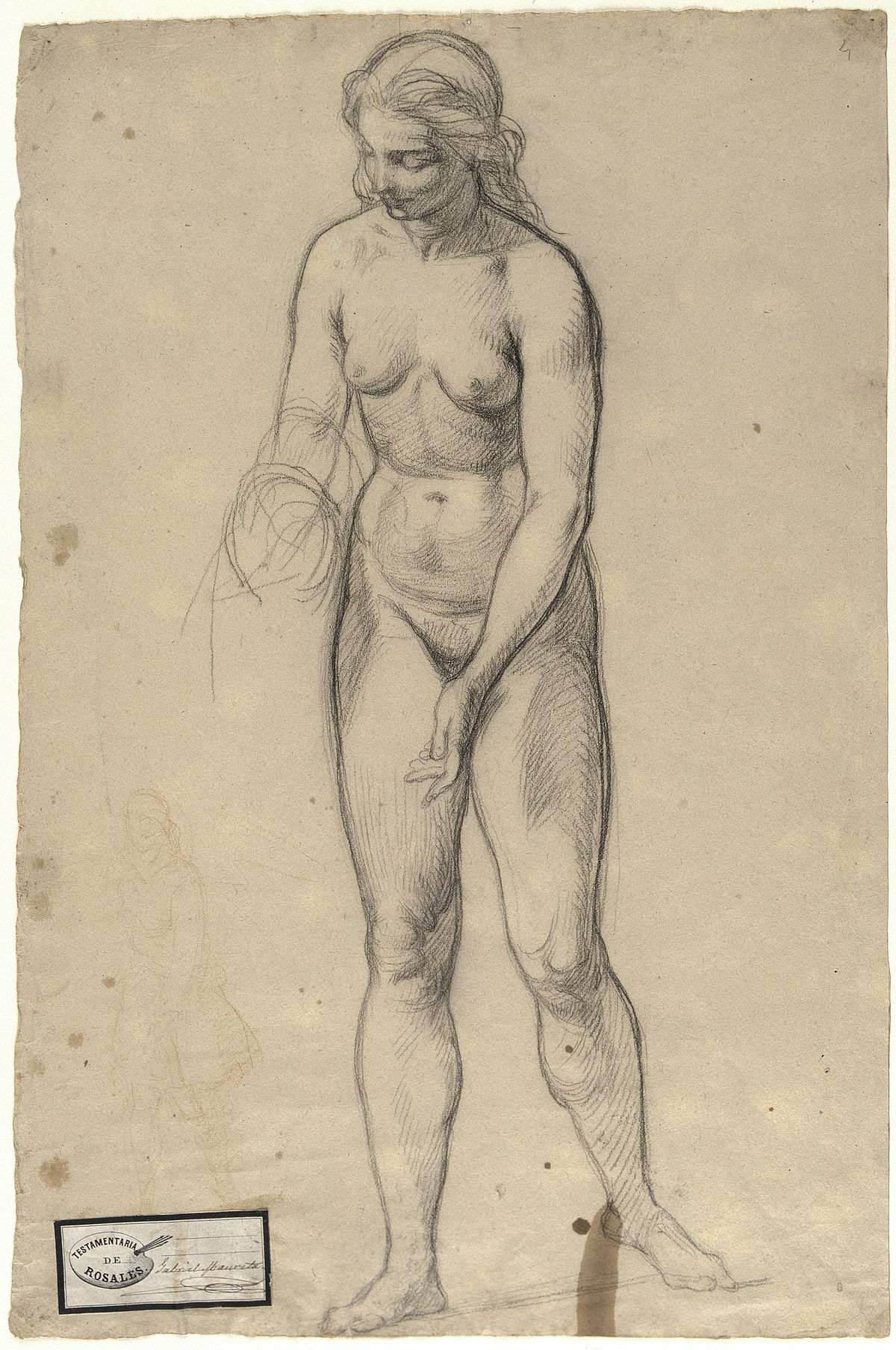 Eduardo Rosales Gallinas (Madrid, España, 1836-1873) tuvo una corta y difícil vida. Como artista viajó a París – donde admiró la obra histórica de Léon Coignet y Paul Delarroche – y a Roma en la que estudió la pintura del Renacimiento Italiano. Se unió al movimiento artístico conocido como «Purismo», que hacía uso de formas básicas, sin elementos superfluos, y quería huir del decorativismo al que, pretendidamente, había llegado el cubismo. No resulta fácil apreciar estos hechos en los desnudos que les voy a mostrar. En cualquier caso, su fama la obtuvo como pintor histórico.