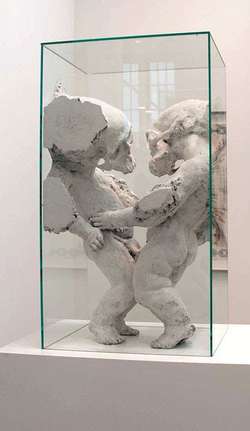 En «Hablando en Lenguas», las formas armónicas de un escultura clásica se ve perforadas por botellas de vidrio. En My Modern Met podeos leer: