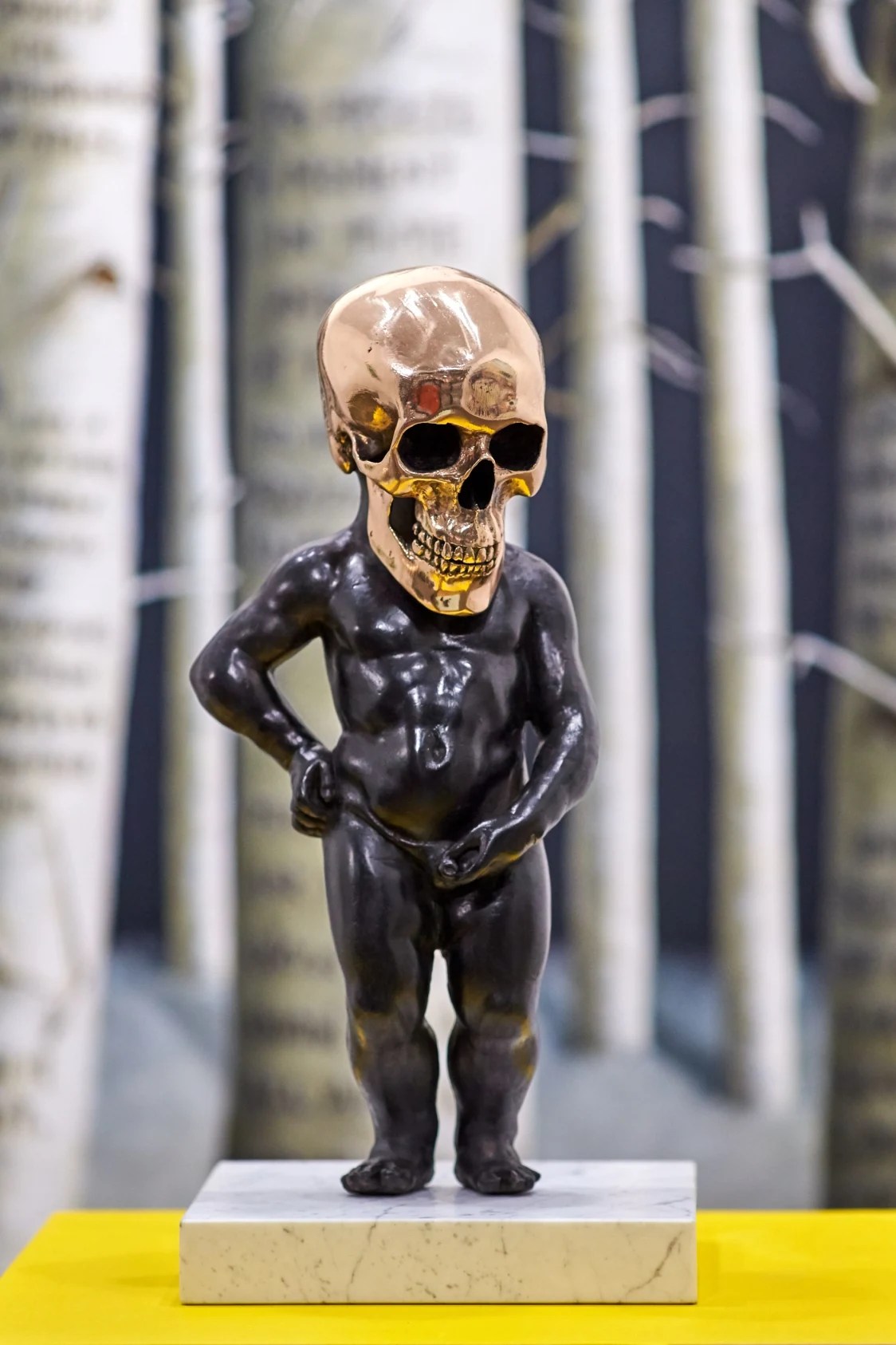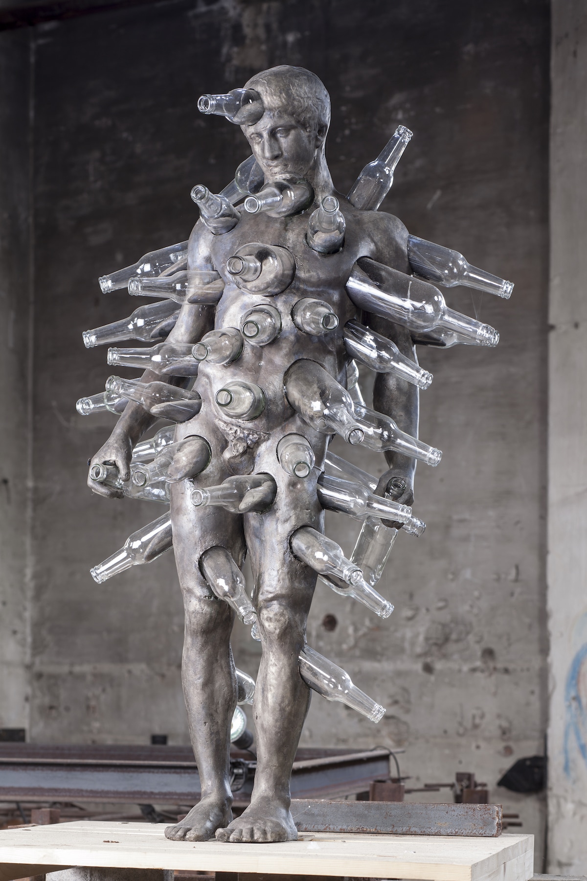 “Quería crear una estatua de inspiración clásica que casi se cayera, como si estuviera borracha”, explica Lerooy. “Me gusta la idea de una escultura dentro de otra escultura con algo saliendo. Así que hago agujeros en el cuerpo y coloco botellas allí, haciendo que parezca que el cuerpo tiene alguna fuga”.