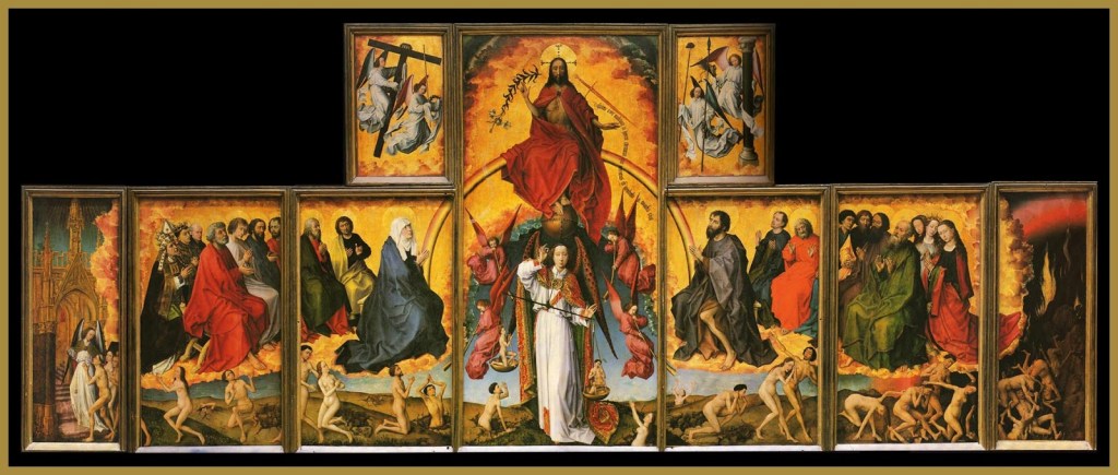 Así pues, voy a mostrar con detalle otra de sus extraordinarias creaciones: El Juicio Final, creada para el Hospicio de Beaune, localidad francesa en la que sigue conservándose. Nuevamente, el color es una de las características dominantes y se despliega ampliamente en los ropajes de todas las figuras del Reino de los Cielos. Los seres humanos, sujeto al juicio divino, están desnudos y ocupan la zona inferior del políptico. No existe ninguna diferenciación en el tratamiento del desnudo para aquellos que van al Cielo y para los que se condenarán al Infierno. La desnudez aquí es una muestra de igualdad, de imposibilidad de ocultación de sus personalidades, de transparencia ante Dios. Curiosamente, el Cristo que preside la obra va cubierto con un manto púrpura (mucho más sencillo que el del ángel que se encuentra a sus pies) y parece mostrar un cuerpo, por lo demás, desnudo.