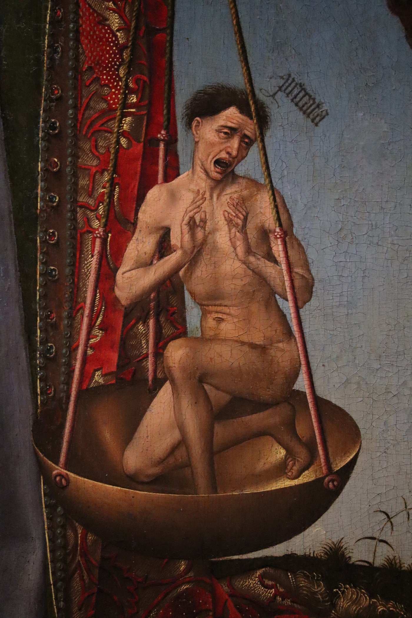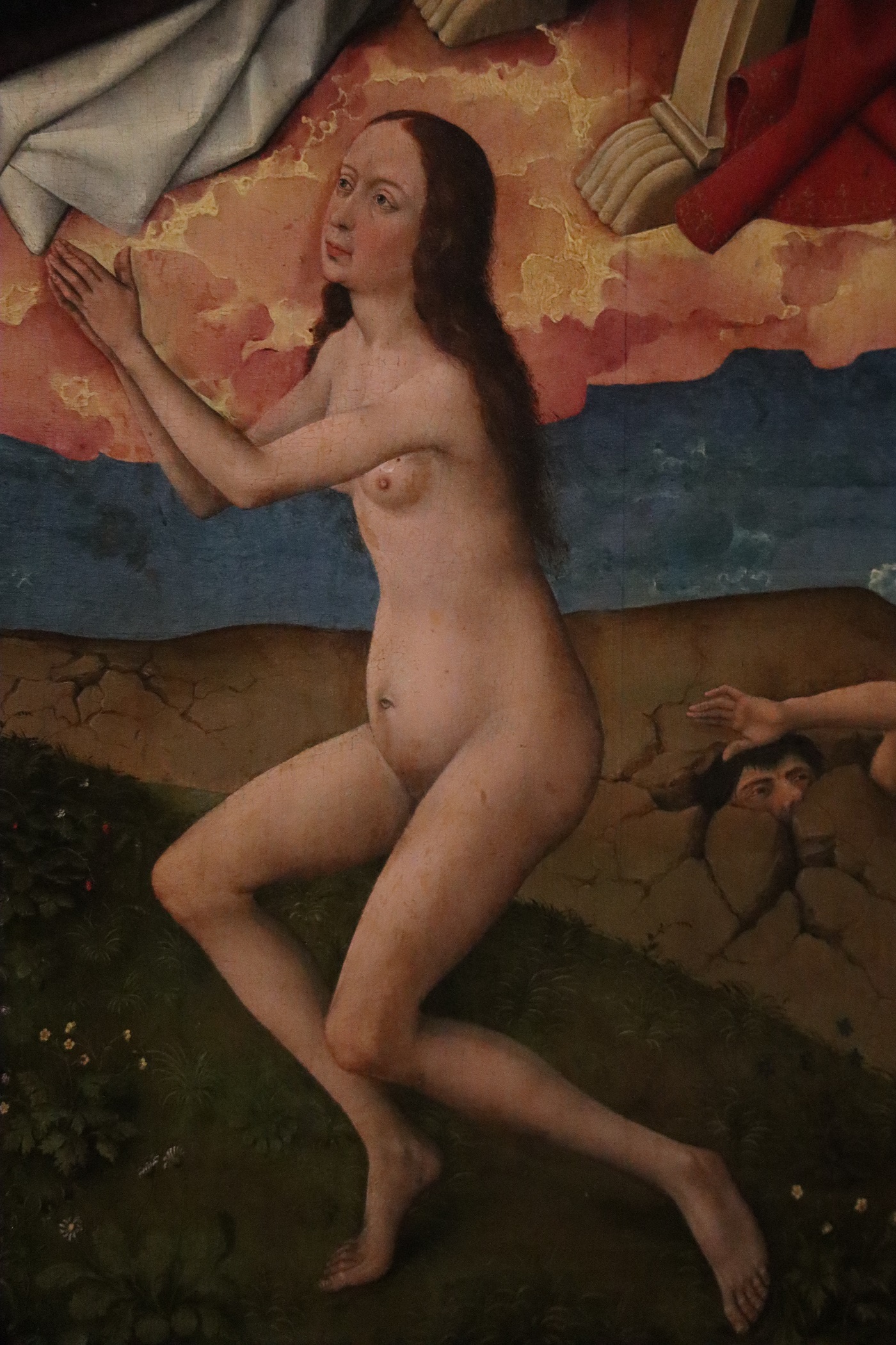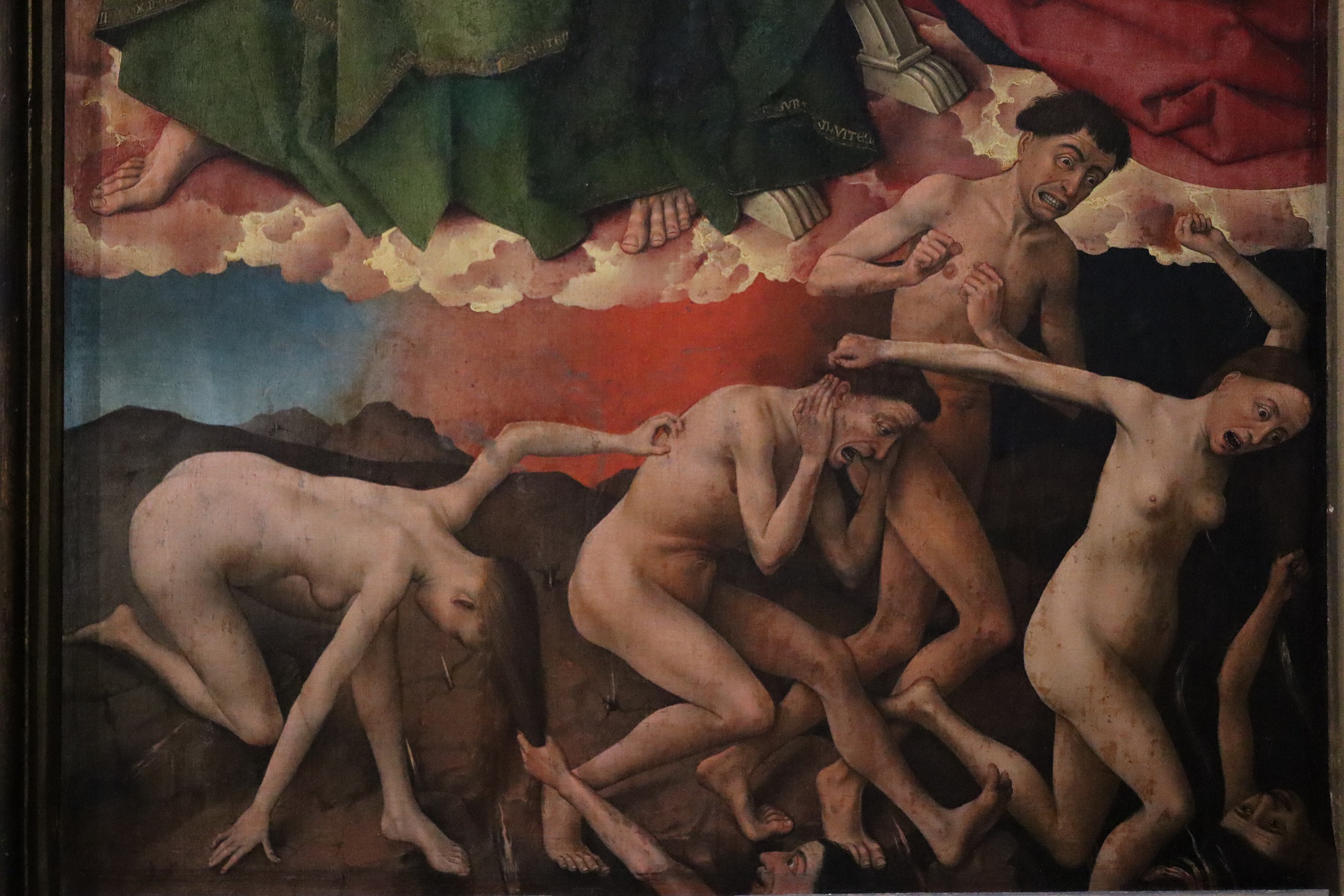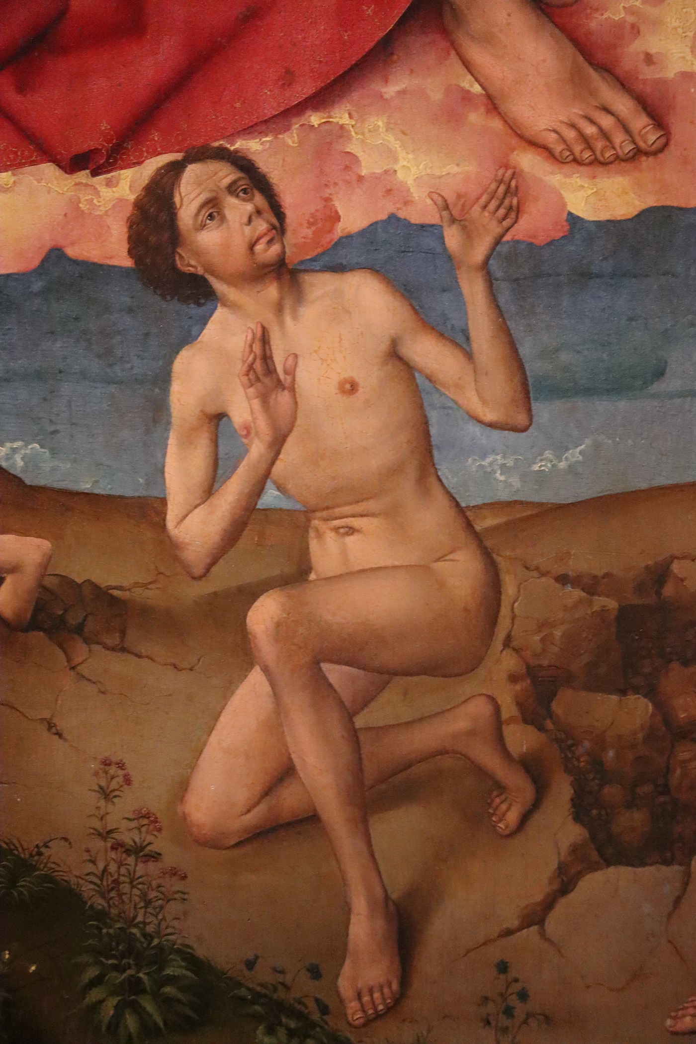 Se conocen pocas obras de Rogier van der Weyden (Tournai, Bélgica, 1399 o 1400-1464) y, a la hora de comentar sus desnudos, me veo limitado a una única composición: «El Juicio Final». ¿Por qué entonces tratarlo aquí? Se trata solamente de una fijación personal. Su obra «El descendimiento», que se nos muestra en el Museo del Prado, resulta para mí verdaderamente fascinante. Color, composición, … todo me parece perfecto, y si tuviese que escoger una única obra de la ingente colección de esta pinacoteca, escogería ésta. El desnudo es prácticamente nulo, pues se destacan los extraordinarios ropajes de los distintos personajes. Sólo Cristo está casi desnudo, con el característico «paño de pureza».