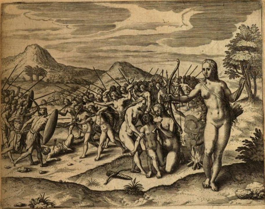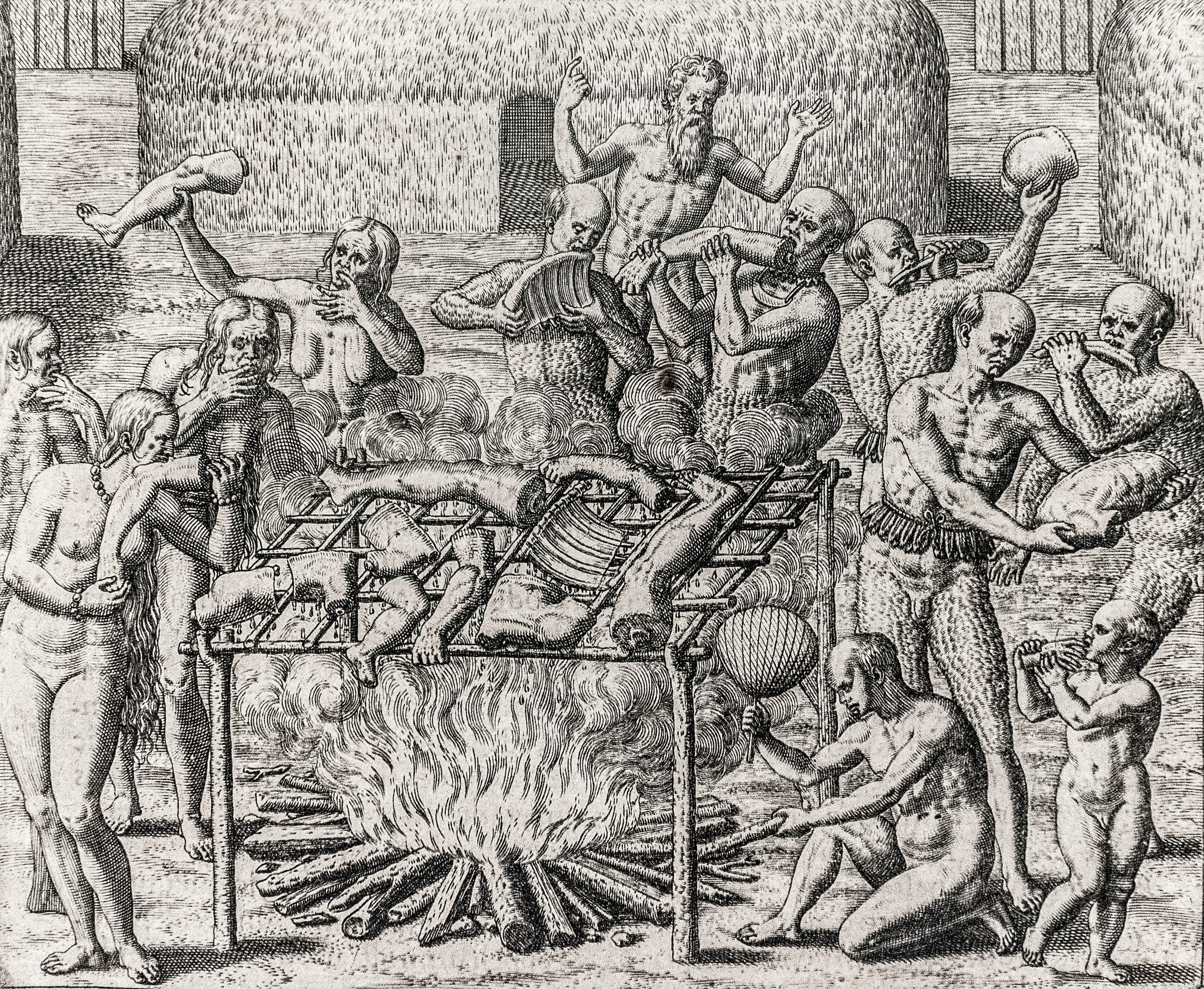 Johann Theodorus de Bry (Lieja, Bélgica, 1528-1598), orfebre, grabador, editor y cartógrafo, se caracterizó por una amplia obra grabada en la que mostró las tropelías – reales y ficticias – cometidas por los españoles y por la iglesia católica en América, contribuyendo en gran medida a la «leyenda negra» de España. La representación del cuerpo de los indígenas obedecía a una concepción ideológica, ya que según se nos comenta en Wikipedia: