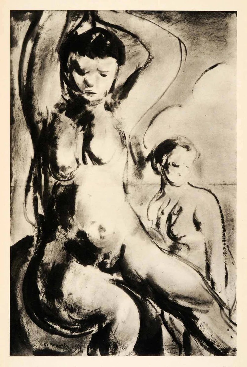 Ya he comentado a algunos artistas pertenecientes al fauvisto, movimiento que se considera fundado por Matisse, y del que he citado a André Derain y a Henri Manguin. Georges Rouault (París, Francia, 1871-1958) perteneció también a este movimiento pero en sus obras une la característica expresión del color fauvista a elementos estructurales expresionistas. Rouault fue un hombre profundamente católico que consideraba que la espiritualidad debía impregnar todas las obras artísticas aunque no fuesen estrictamente religiosas. Una espiritualidad que impregna su numerosas pinturas de tipo social e incluso sus desnudos. En algunos de estos se representa el mundo de la prostitución.