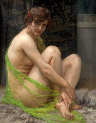 Guillaume Seignac (Rennes, Francia, 1870-1924) fue un pintor academicista y neoclásico formado en l’Academie Julian de París. Uno de sus maestros destacados fue William Bouguereau cuya influencia podemos apreciar en el carácter destacado de la mujer, con un erotismo más o menos contenido (mayor en Seignac) y, quizás de un modo particular, en las composiciones que tienen como temática «la ola». Inicio la muestra con tres pinturas que llevan este título: