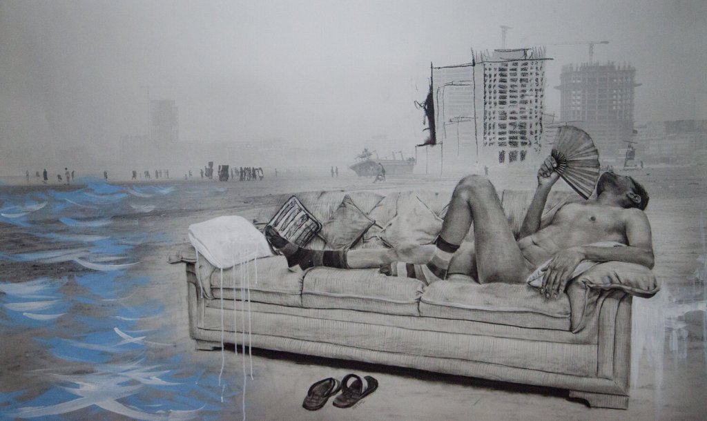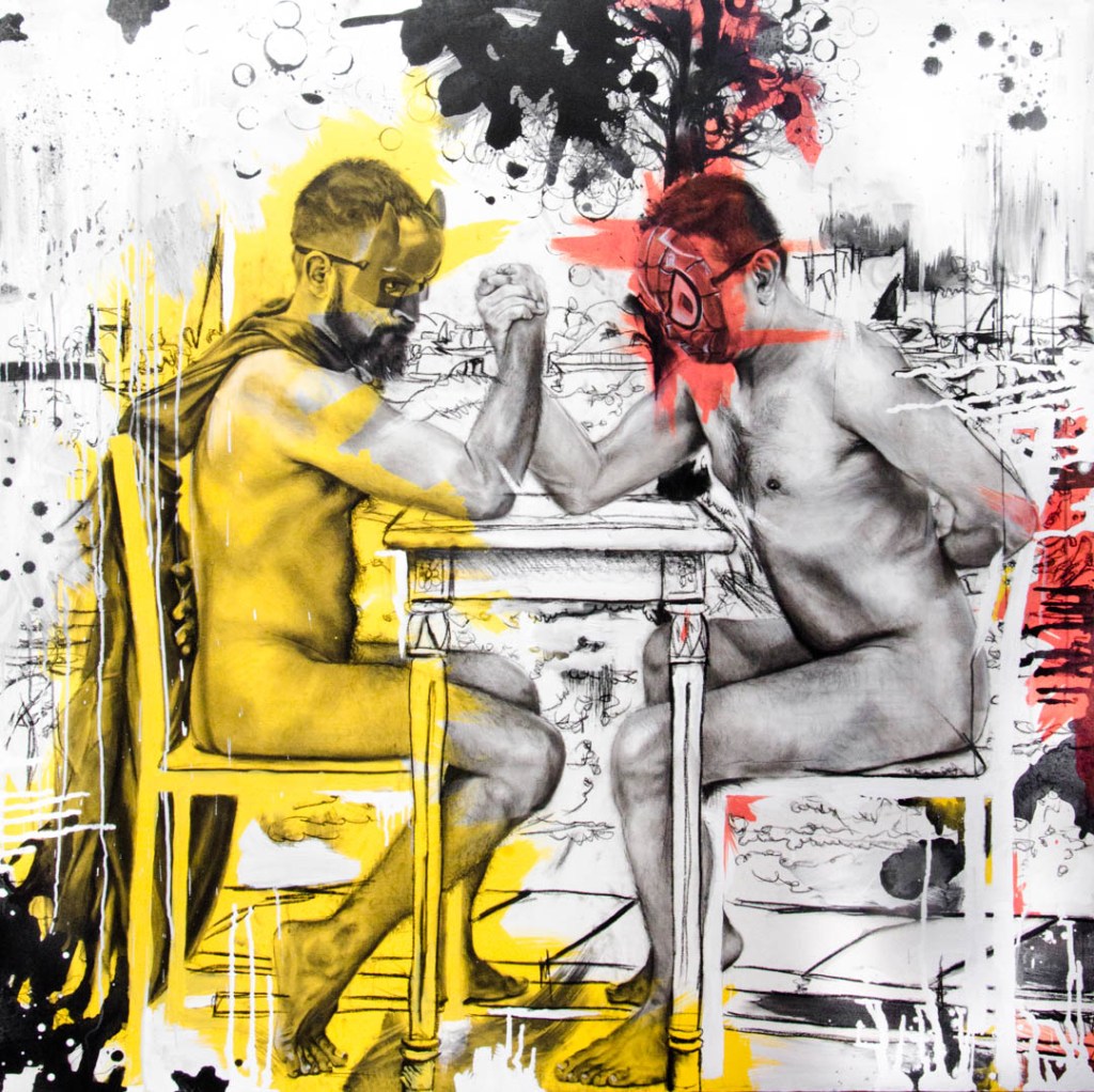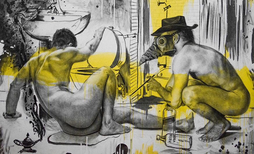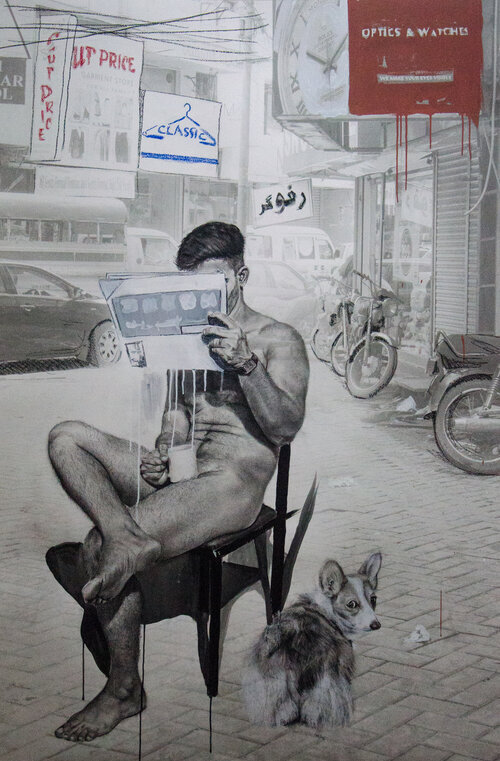 «La práctica de Shah Numair Ahmed Abbasi se basa en la cultura popular, anécdotas y coloquialismos para escenificar narrativas personales y sociales. Su trabajo intenta desafiar la política detrás de cómo se construye y representa socialmente el género. La figura del desnudo masculino es un tema recurrente, a menudo presentado de maneras que socavan o cuestionan las virtudes masculinas idealizadas».