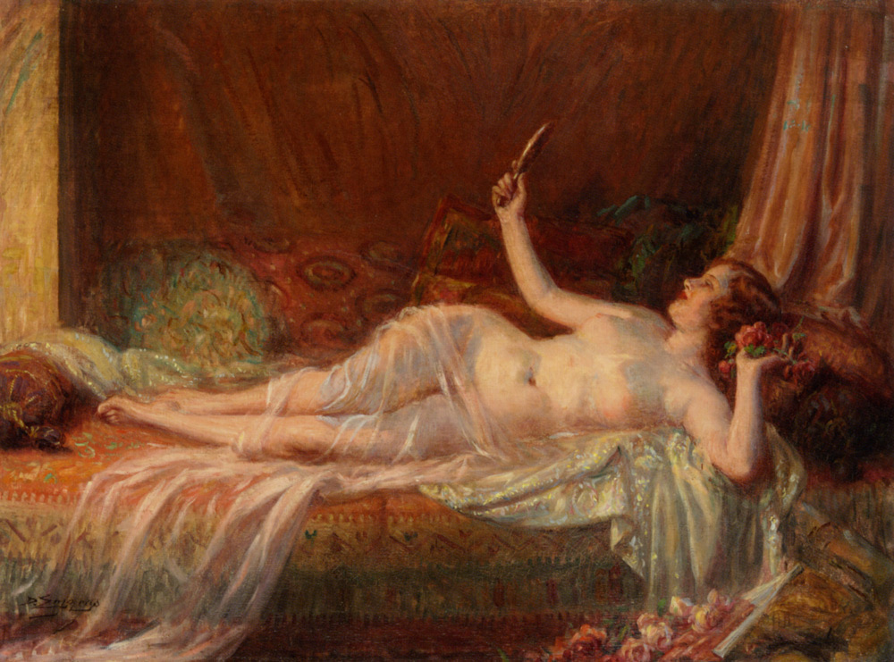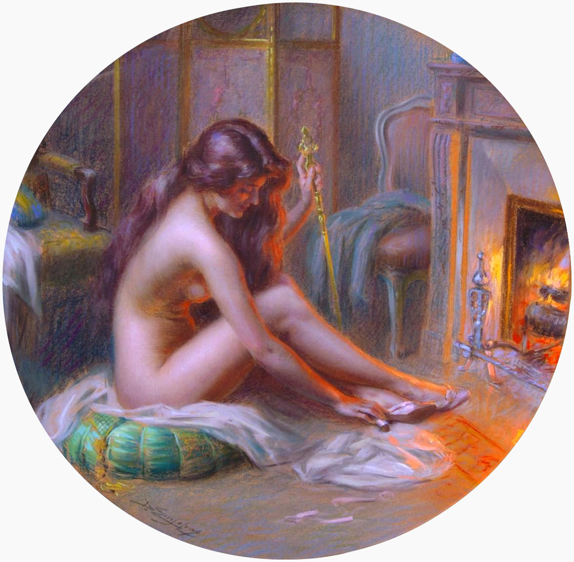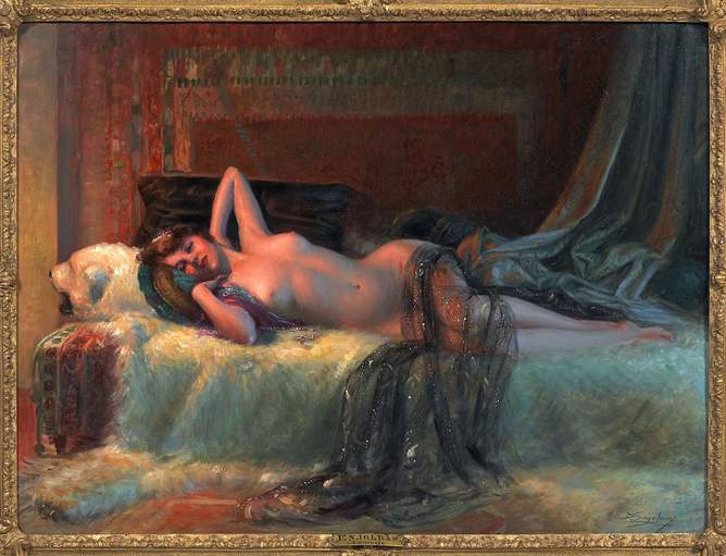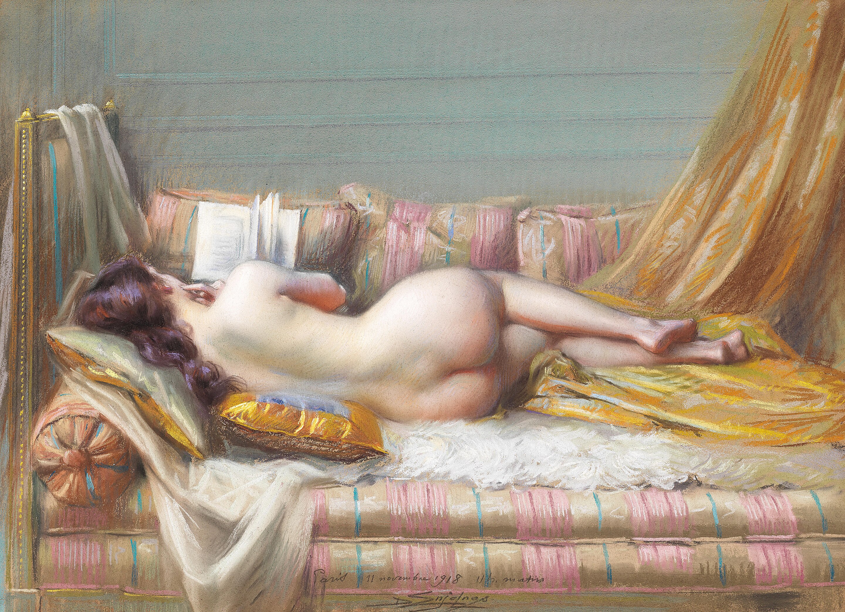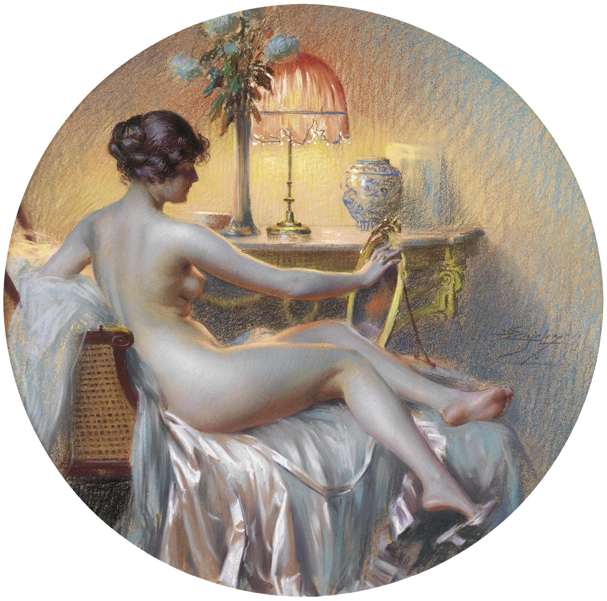 Delphin Enjolras (Coucouron, Ardèche, Francia, 1857-1945) fue un pintor que se formó bajo la tutela de Jean-Léon Gérôme y su huella academicista y orientalista se aprecia claramente en su obra. La mujer fue el tema principal de su pintura, que realizó fundamentalmente en pastel, aunque también en óleos y acuarelas. Una mujer que se nos muestra en la intimidad, leyendo con luz artificial, o recostada con un toque erótico.