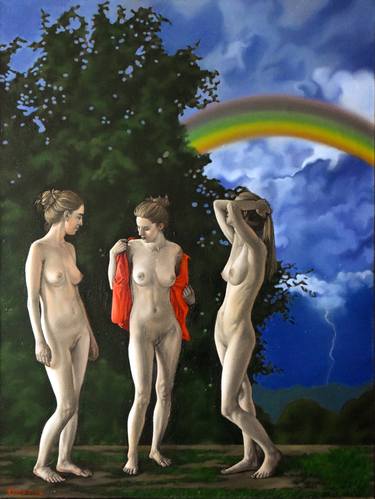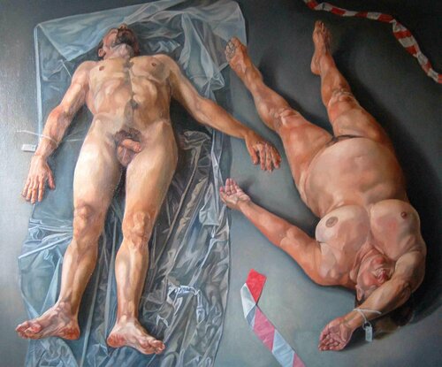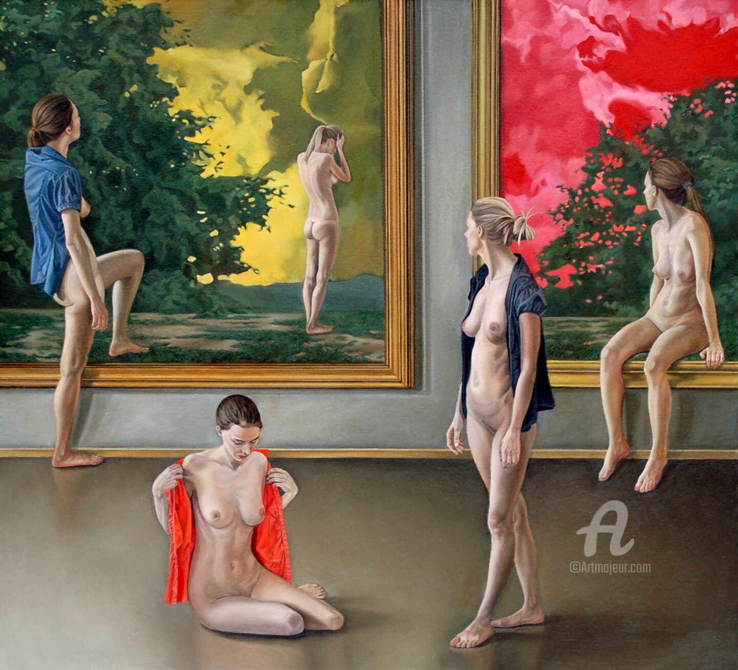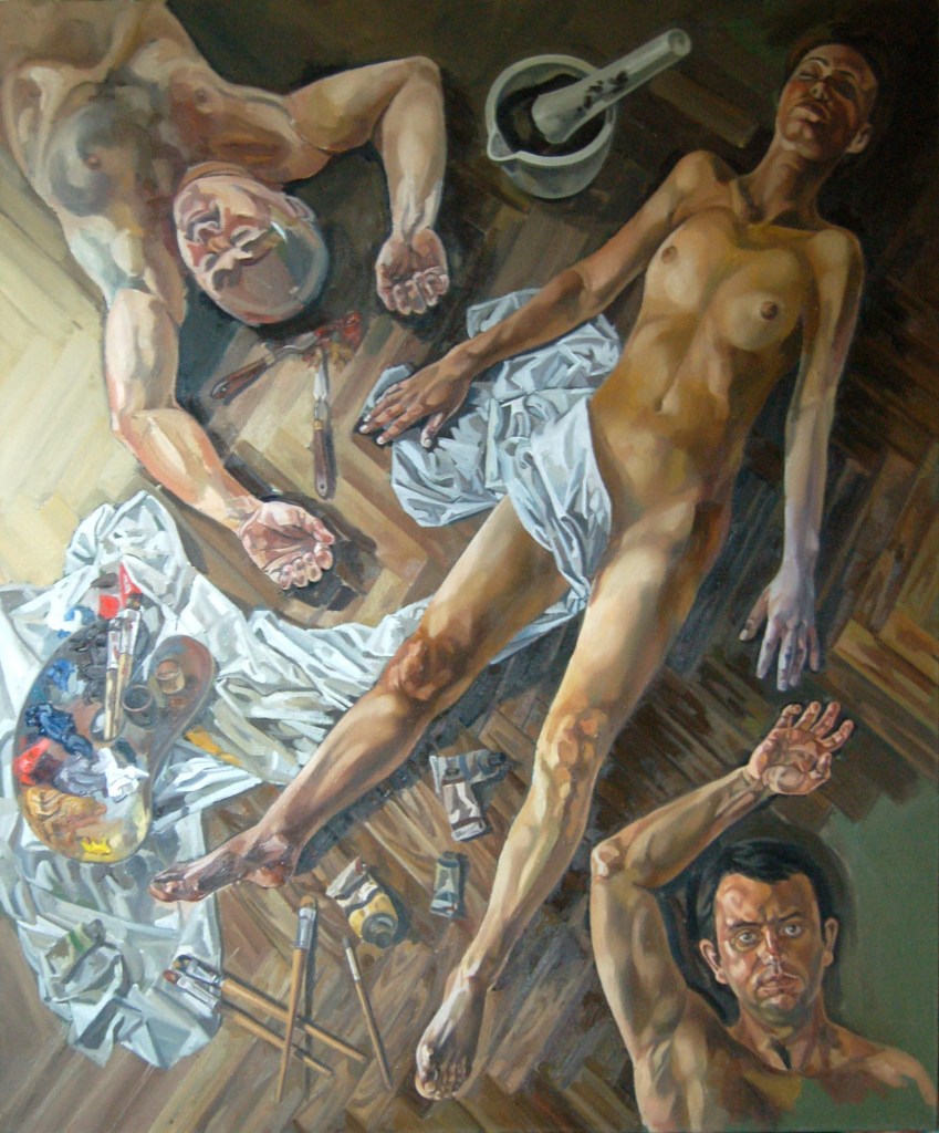 … «sus lienzos son giros narrativos inesperados, sinceros y, en ocasiones, incluso aterradores, de la existencia humana. El autor representa a las figuras desnudas en diversas circunstancias filosófico-existenciales, haciéndolas vulnerables y emocionales. Cambia las emociones humanas y vierte impresiones y sensaciones en el lienzo a partir de lo que ve y experimenta a través del prisma de su propia visión. Todo en sus obras está minuciosamente planificado hasta el último detalle. El artista emplea la metáfora, la alegoría y lo grotesco para comunicar el poder de las composiciones decorativas».