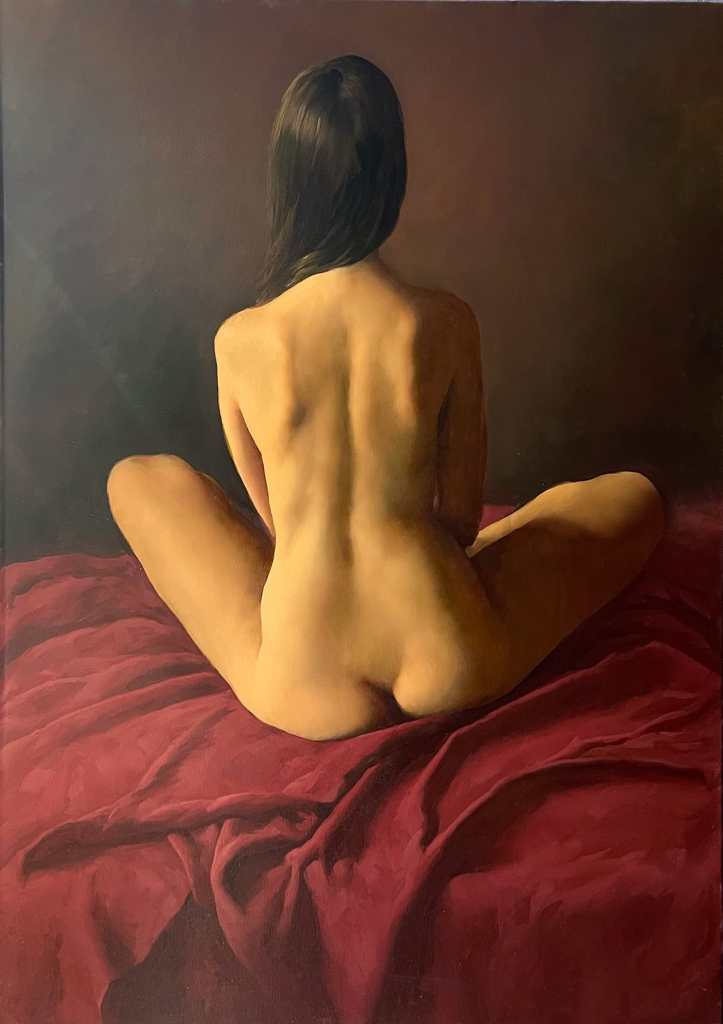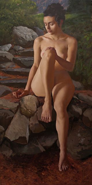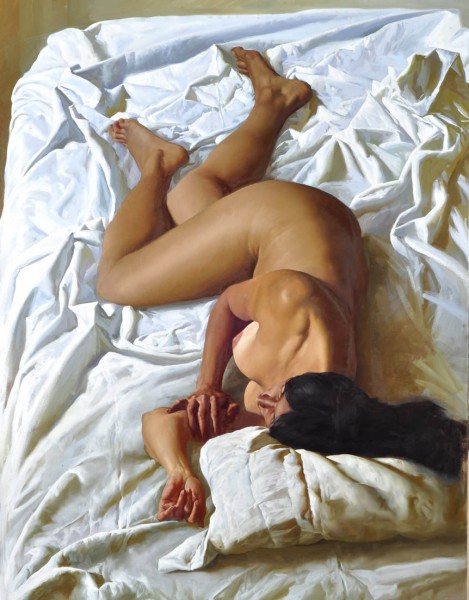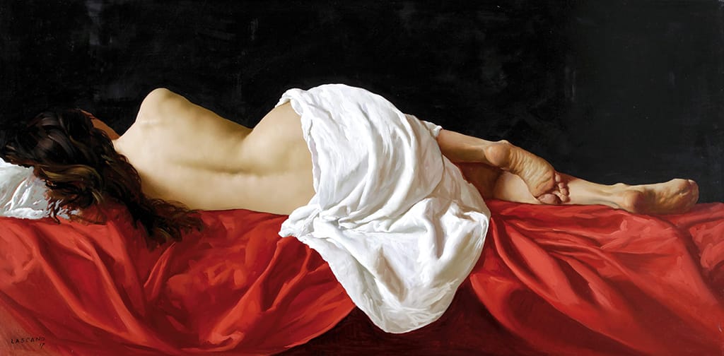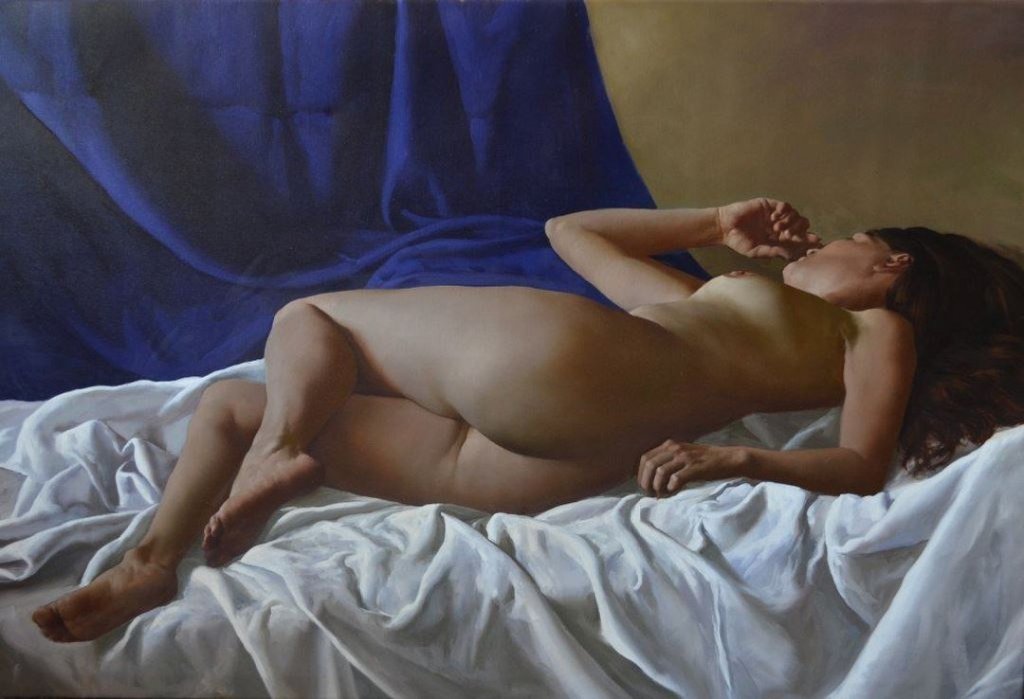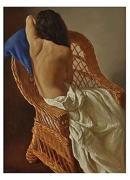 Juan Lazcano (Ciudad de la Plata, Argentina, 1947) es un destacado pintor realista argentino con formación autodidacta y admirador del tratamiento lumínico de las obras de Murillo, Zurbarán y Velázquez. Aunque su tema emblemático son los bodegones, disponemos de un buen grupo de desnudos femeninos, como los que les presento a continuación: