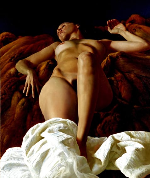 Juan Lazcano (Ciudad de la Plata, Argentina, 1947) es un destacado pintor realista argentino con formación autodidacta y admirador del tratamiento lumínico de las obras de Murillo, Zurbarán y Velázquez. Aunque su tema emblemático son los bodegones, disponemos de un buen grupo de desnudos femeninos, como los que les presento a continuación: