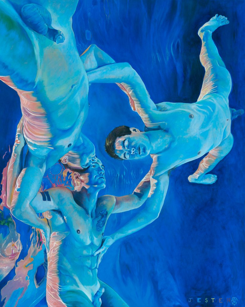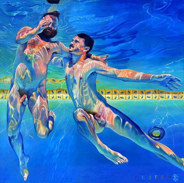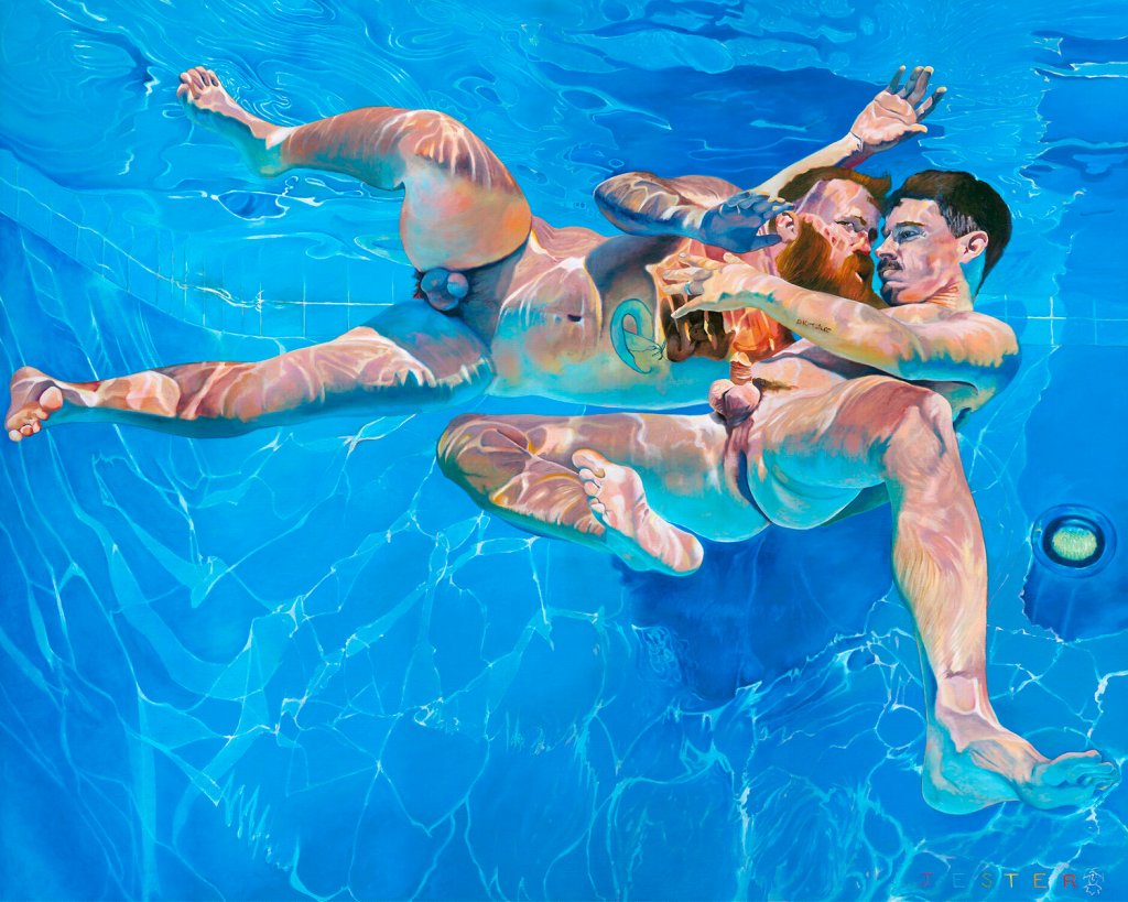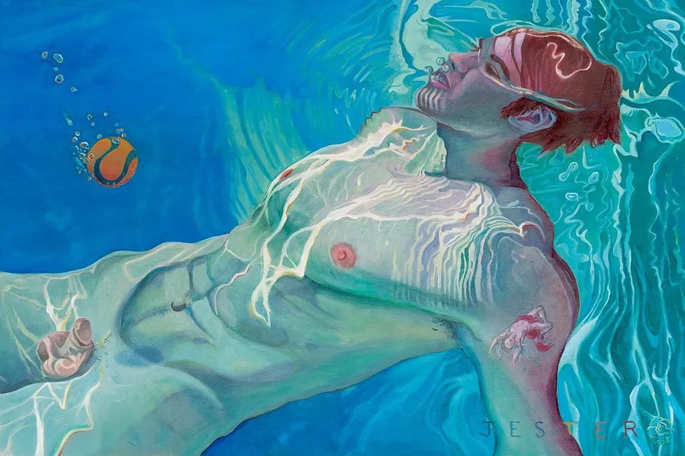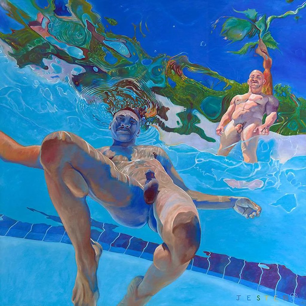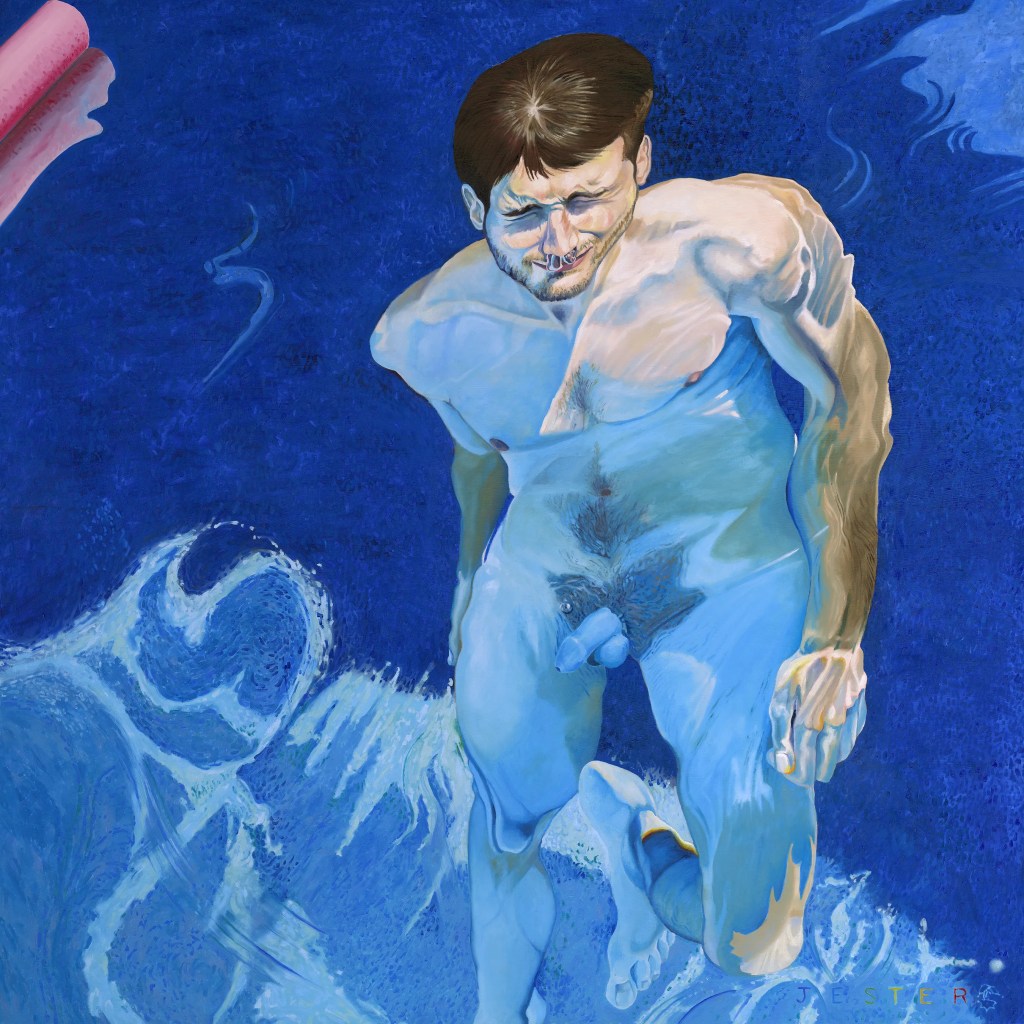 La pintura de David Jester (USA, 1960) presenta un desnudo masculino bajo los efectos de las luces, reflexiones y reflejos del agua de una piscina. Sus obras quieren reflejar la identidad queer, y en The Queer Museum podemos leer: