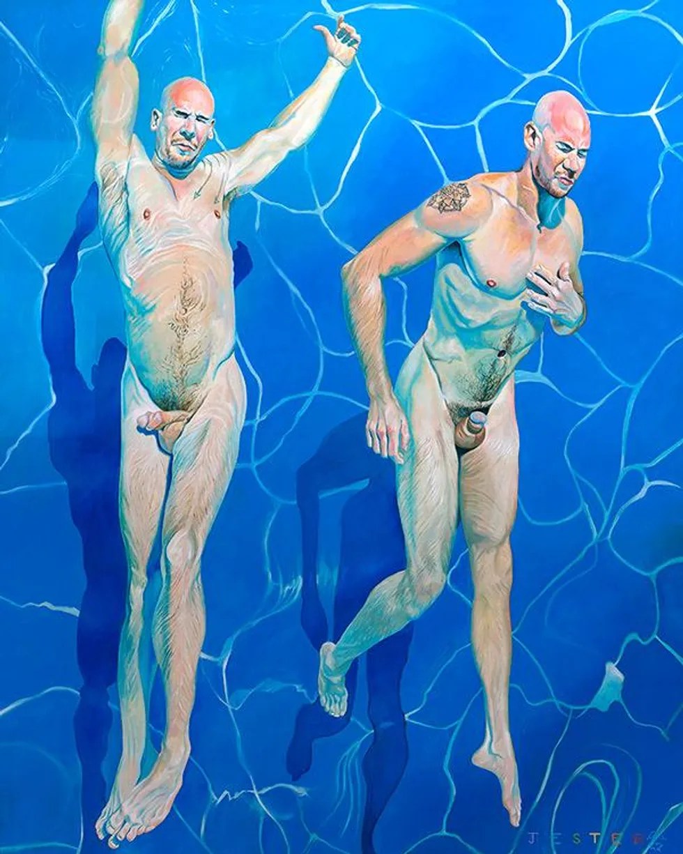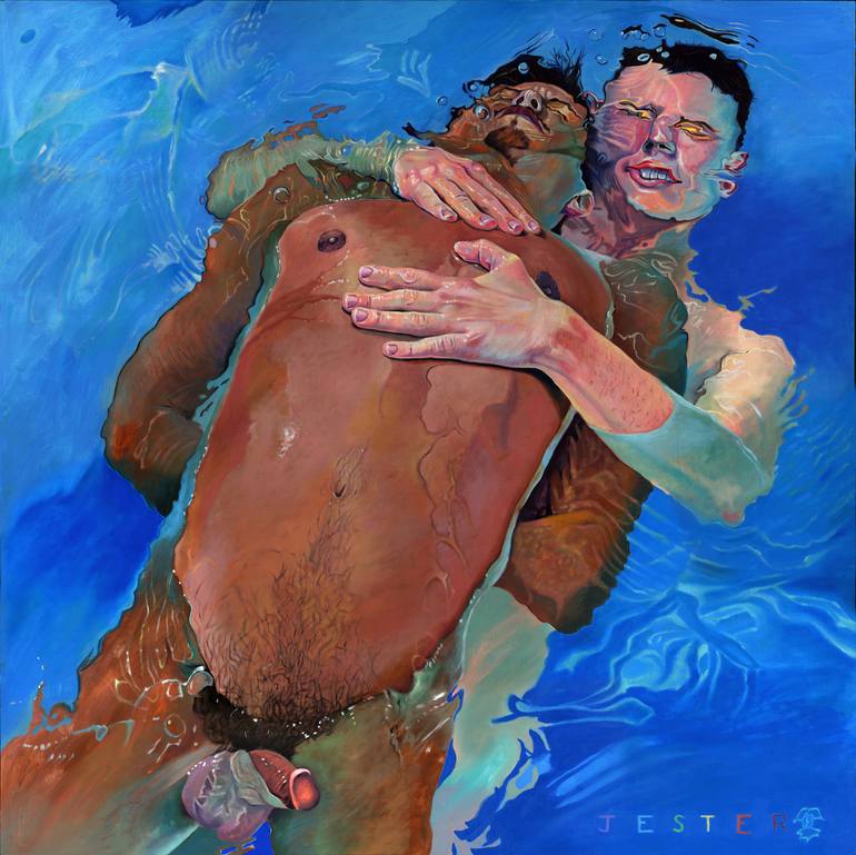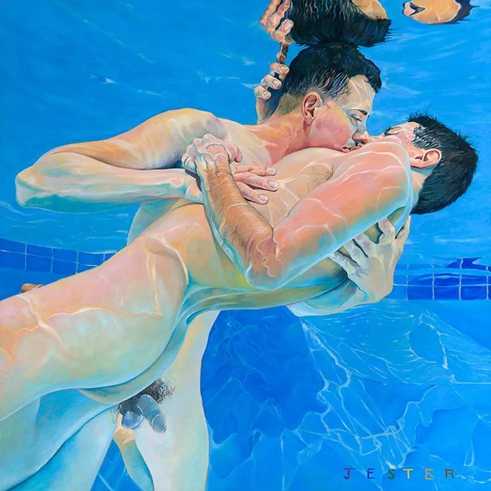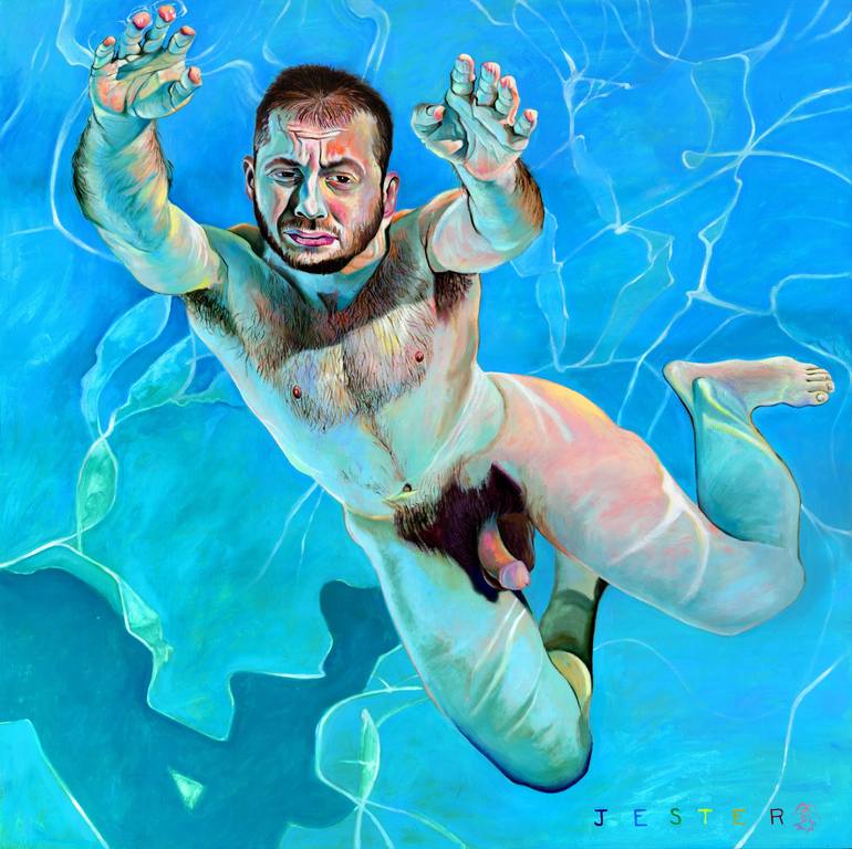 La pintura de David Jester (USA, 1960) presenta un desnudo masculino bajo los efectos de las luces, reflexiones y reflejos del agua de una piscina. Sus obras quieren reflejar la identidad queer, y en The Queer Museum podemos leer: