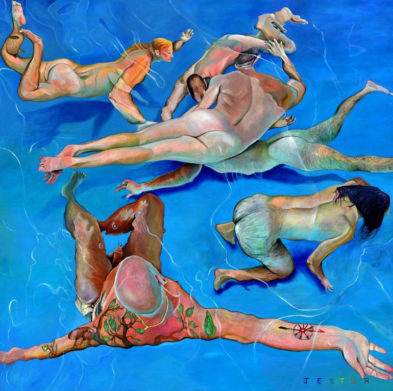 «Según recuerda, le gustaba nadar de adolescente, pero lo que lo atrajo de las piscinas fue la forma en que aíslan los cuerpos del sonido, el movimiento e incluso la gravedad, creando un grupo de personas que se convierten en su propia comunidad, aunque sea por un momento, en otro «mundo» con sus propias reglas de tiempo, espacio y color. Así ve Jester a la comunidad gay: separada, pero al mismo tiempo parte de un mundo más grande».