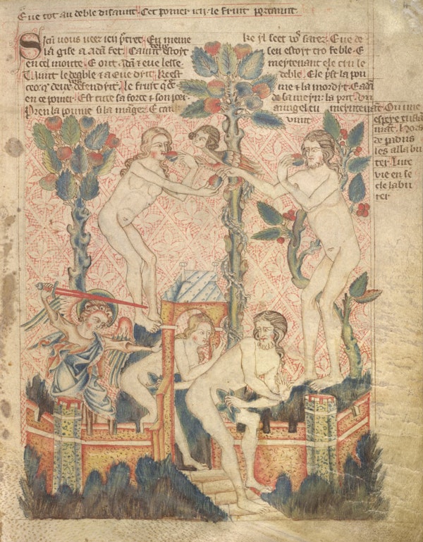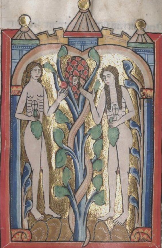 Continuo aquí con una pretendida serie en la que se analiza la figura de Adán y Eva a lo largo de la Historia del Arte. En una primera entrada, en este blog, puse de manifiesto el tratamiento que el arte románico les otorgó durante la Alta Edad Media. Durante los siglos XII, XIII y XIV (Baja Edad Media) la situación social de la gente cambió. La población y la economía sufrieron una expansión, se empezaron a desarrollar las universidades y el arte parece intentar desligarse ligeramente de ese centro religioso centrado en abadías y monasterios. Desaparecerán los grandes frescos narrativos de la época románica y ahora los temas preferidos van a ser historias novelescas o de la vida cortesana. En su representación, la pintura no juega un papel relevante.