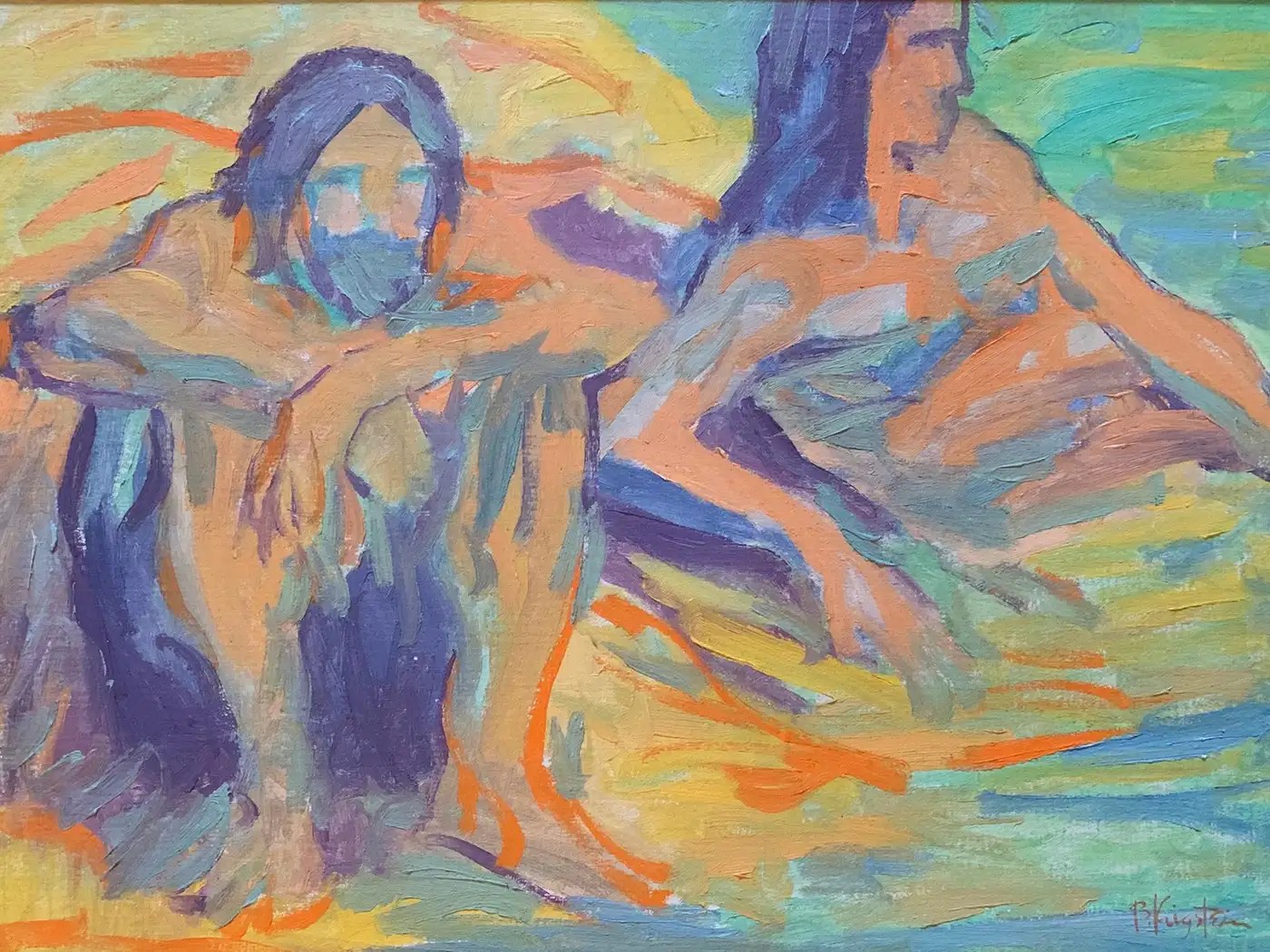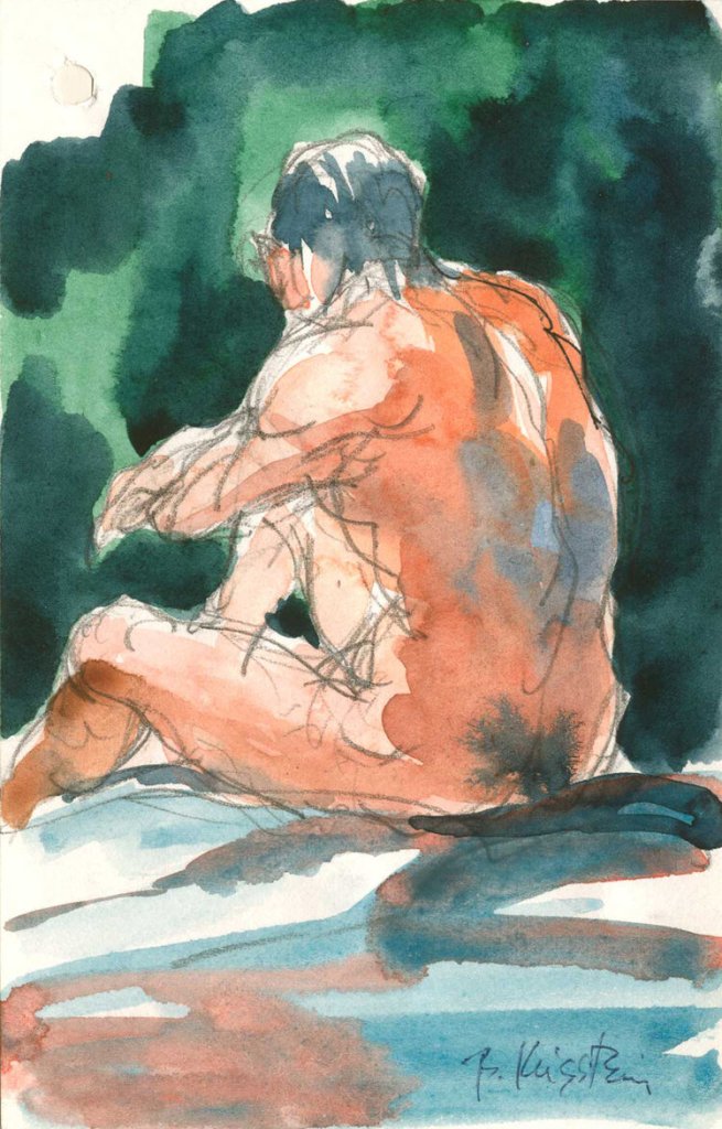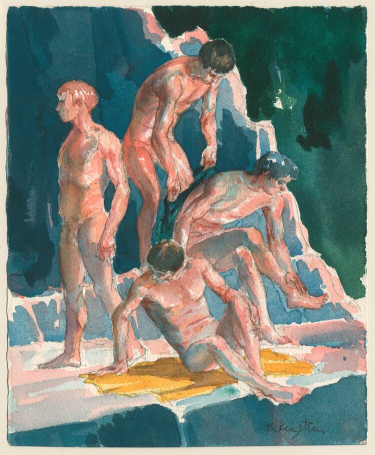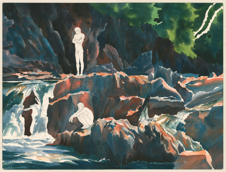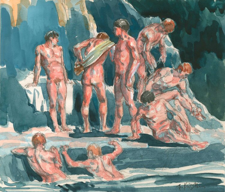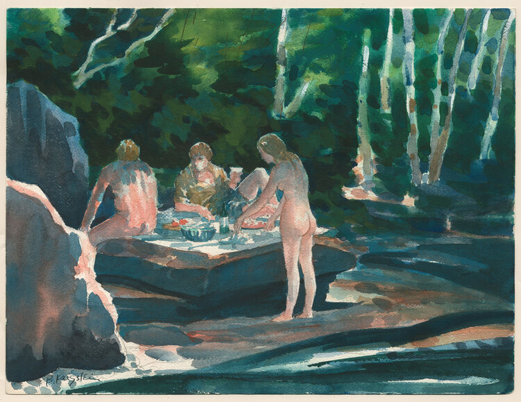 La obra en papel de este artista me resulta particularmente interesante. En sus acuarelas se muestras, como en algunos de las pinturas anteriores, enclaves naturales de Aridondack y Berkshire ocupados por bañistas. Estos se muestran de un modo naturista, en plena armonía con esos paisajes o simplemente como retratos desnudos naturales.
