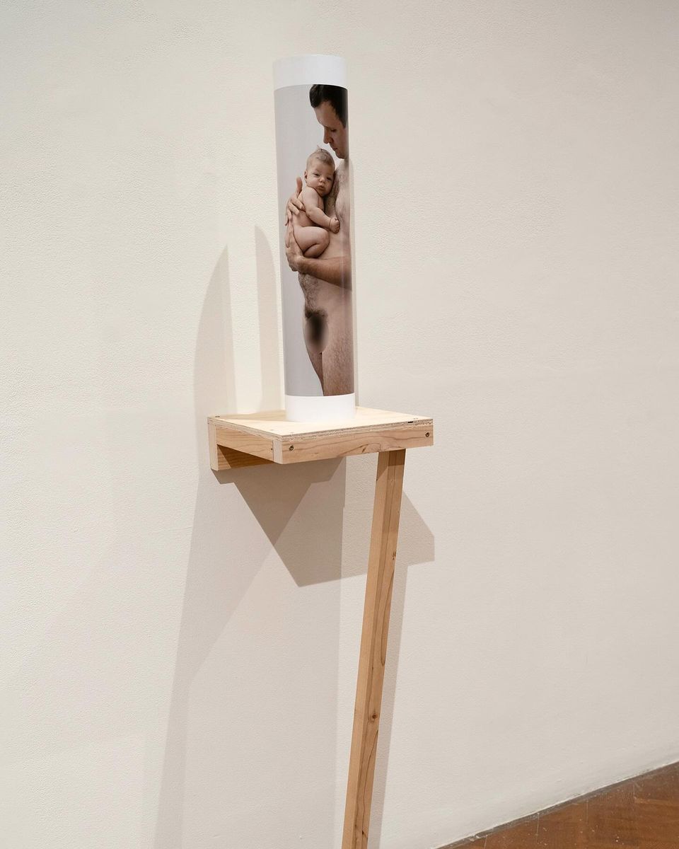 «Una de mis piezas favoritas de mi nueva exposición, Staring at the Son, es esta fotografía de un padre y su hijo. El papel fotográfico está enrollado en un tubo que le permite mantenerse en pie libremente, al mismo tiempo que crea una experiencia de observación activa. Hay que moverse alrededor de la pieza para ver la imagen completa, algo similar a la forma en que vemos una escultura. El estante en el que se encuentra tiene un soporte vertical que no es realmente necesario, pero que le da a la composición una sensación de precariedad y al mismo tiempo le da a la pieza una presencia comparable a la del cuerpo».