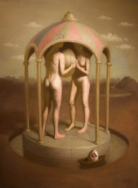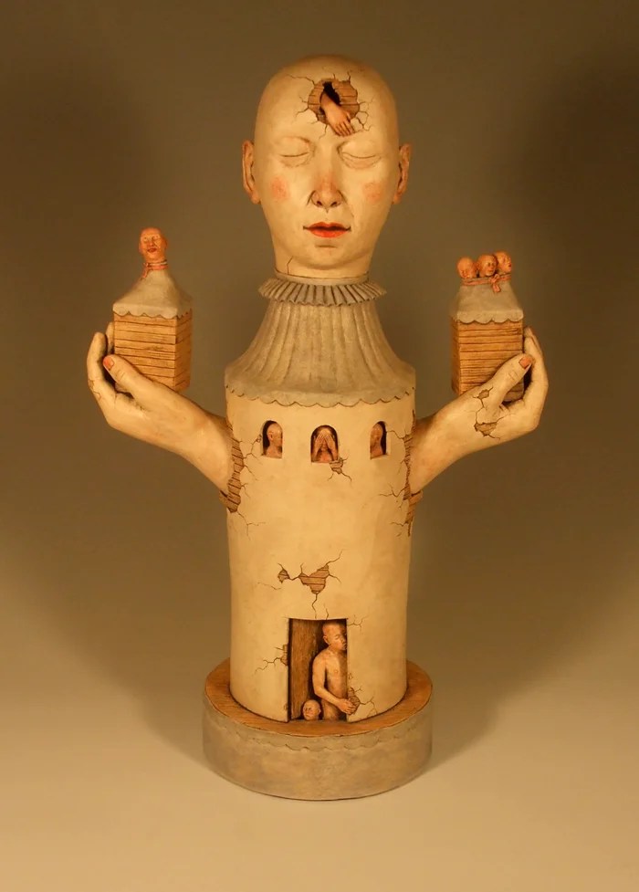 La multiplicidad de posibles lecturas de simbolismos en mi trabajo está en el corazón de mi concepto. Sin embargo, hay algunos de los elementos que veo como símbolos o metáforas de aspectos específicos de la experiencia humana. En mi trabajo de escultura, se hace especial hincapié en la interacción entre el interior y el exterior. Pequeñas figuras que miran tímidamente a través de ventanas y puertas desde formas híbridas arquitectónicas / corporales simbolizan un deseo humano de una sensación de seguridad inalcanzable. Los espacios interiores misteriosos y ocultos de mis esculturas hablan de la disparidad entre nuestras apariencias exteriores y aspectos de nuestro yo interior que otros no pueden conocer…