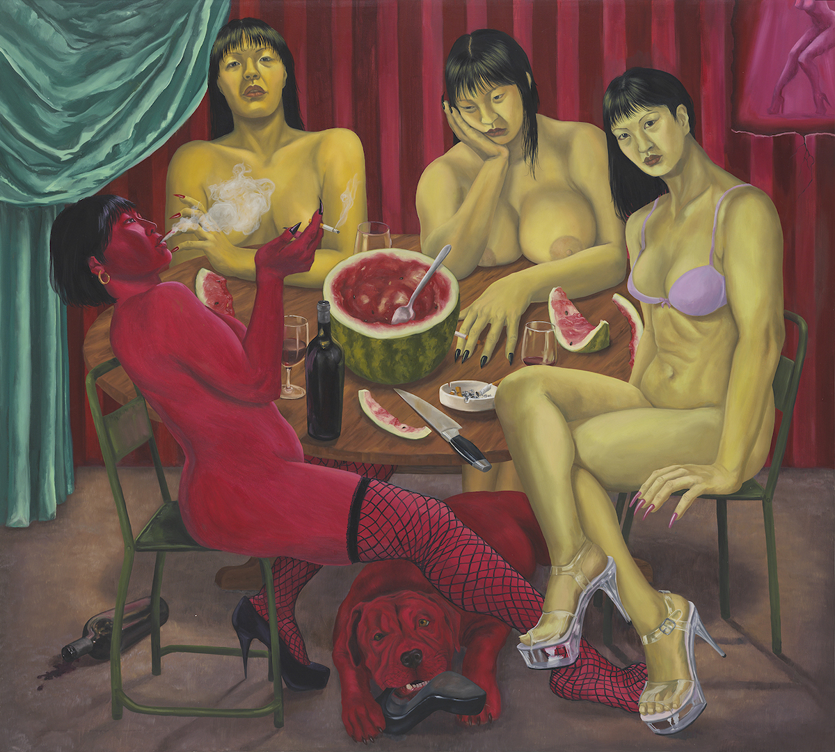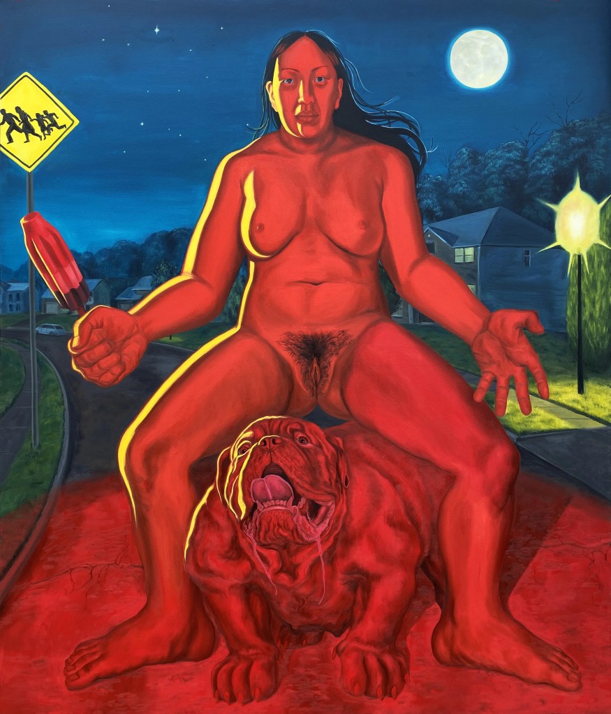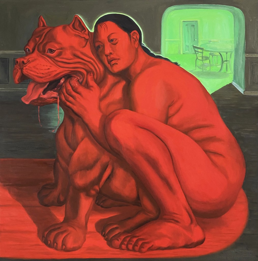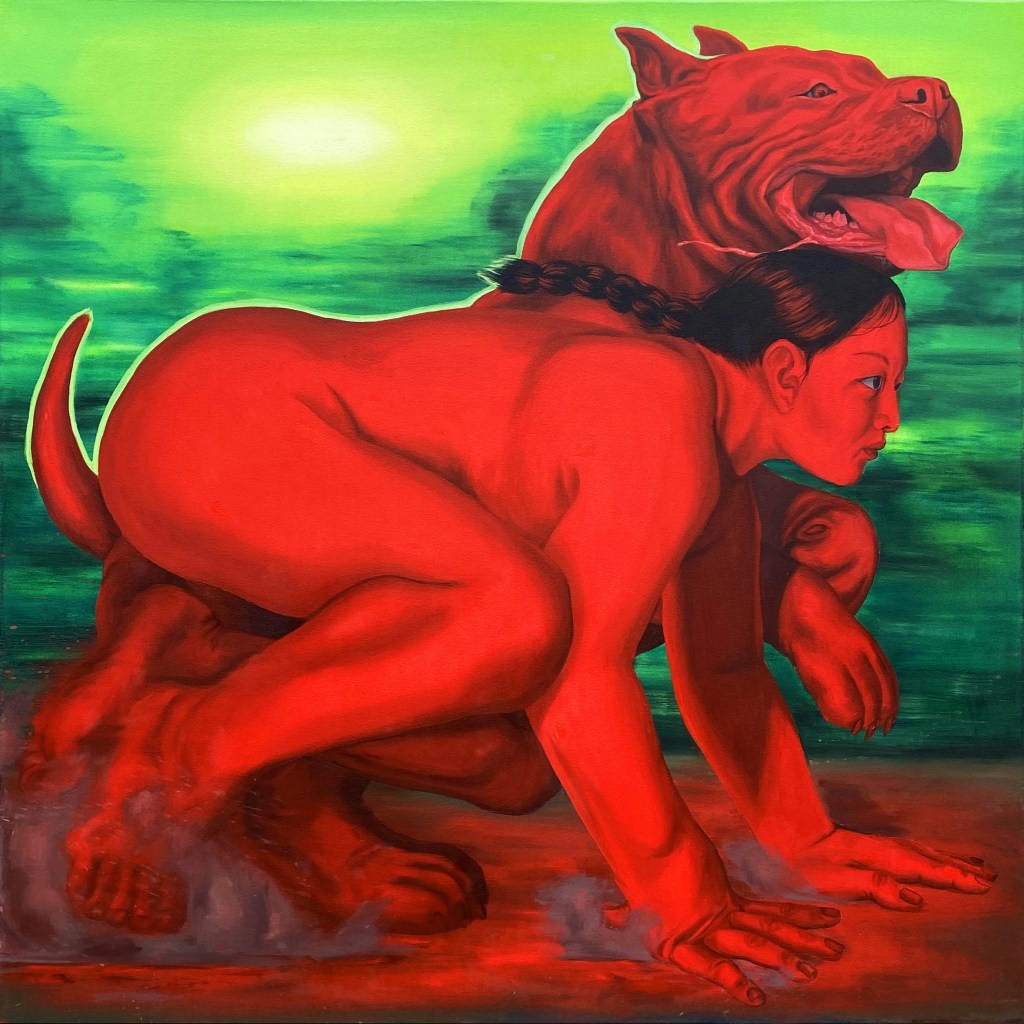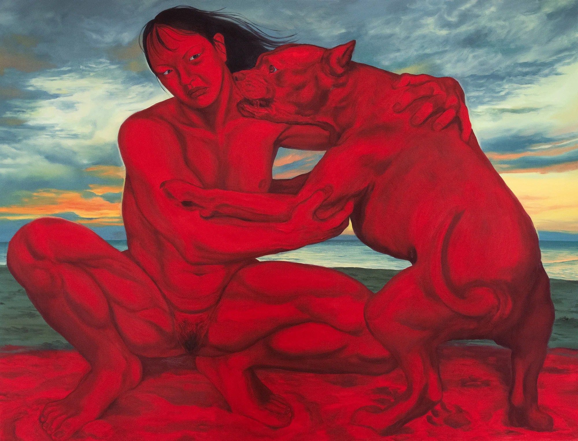 Del mismo modo, Olivia Hingley nos comenta su particular visión de la interacción mujer-perro y el uso primordial del color rojo en sus pinturas: