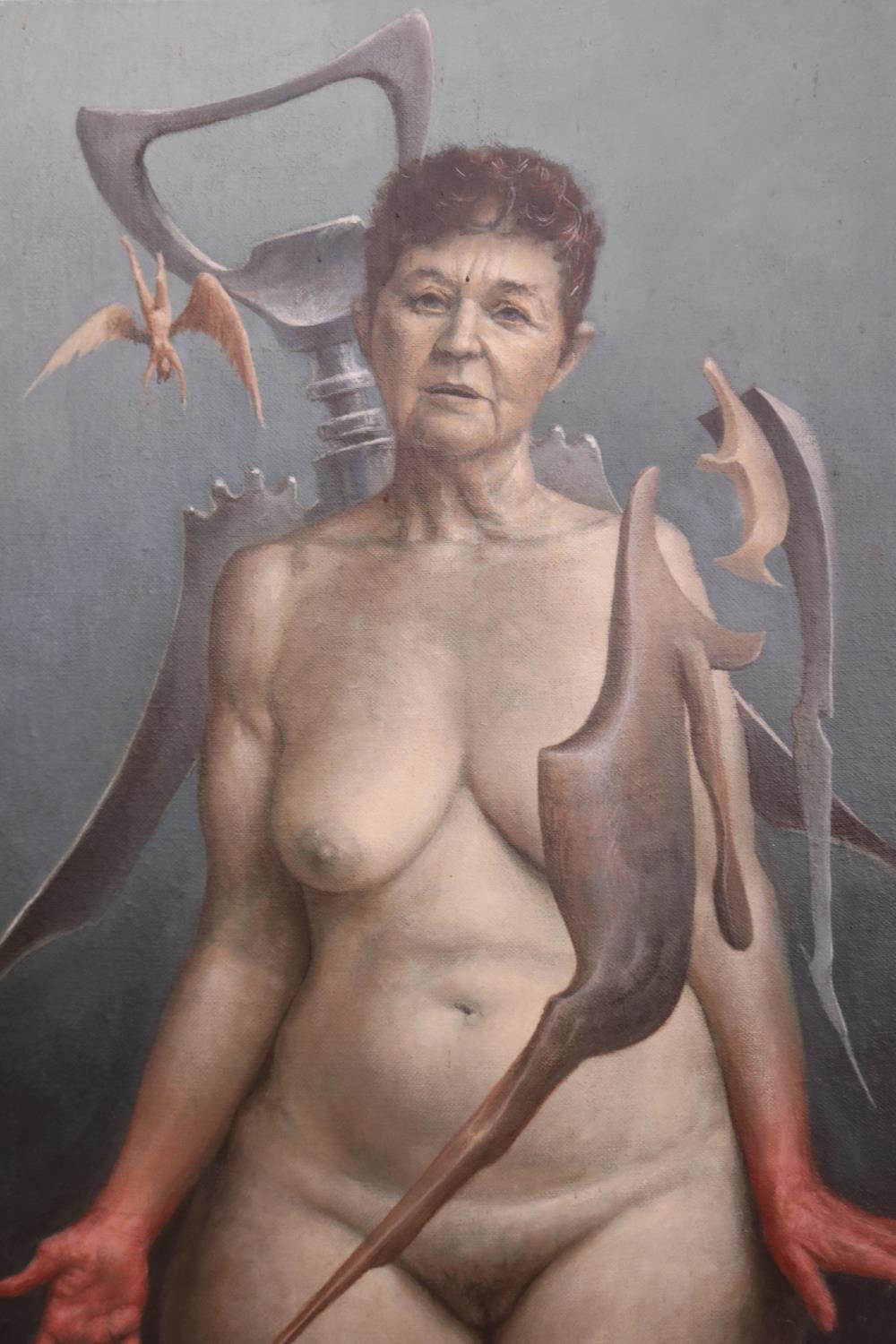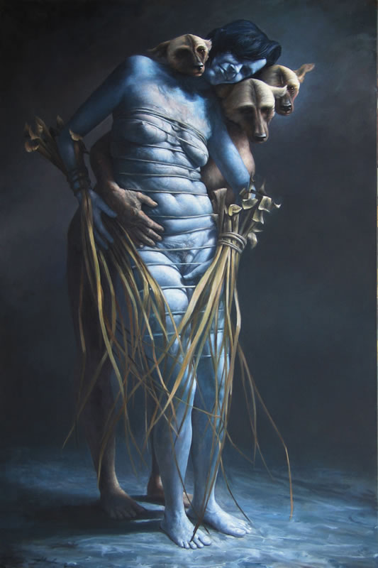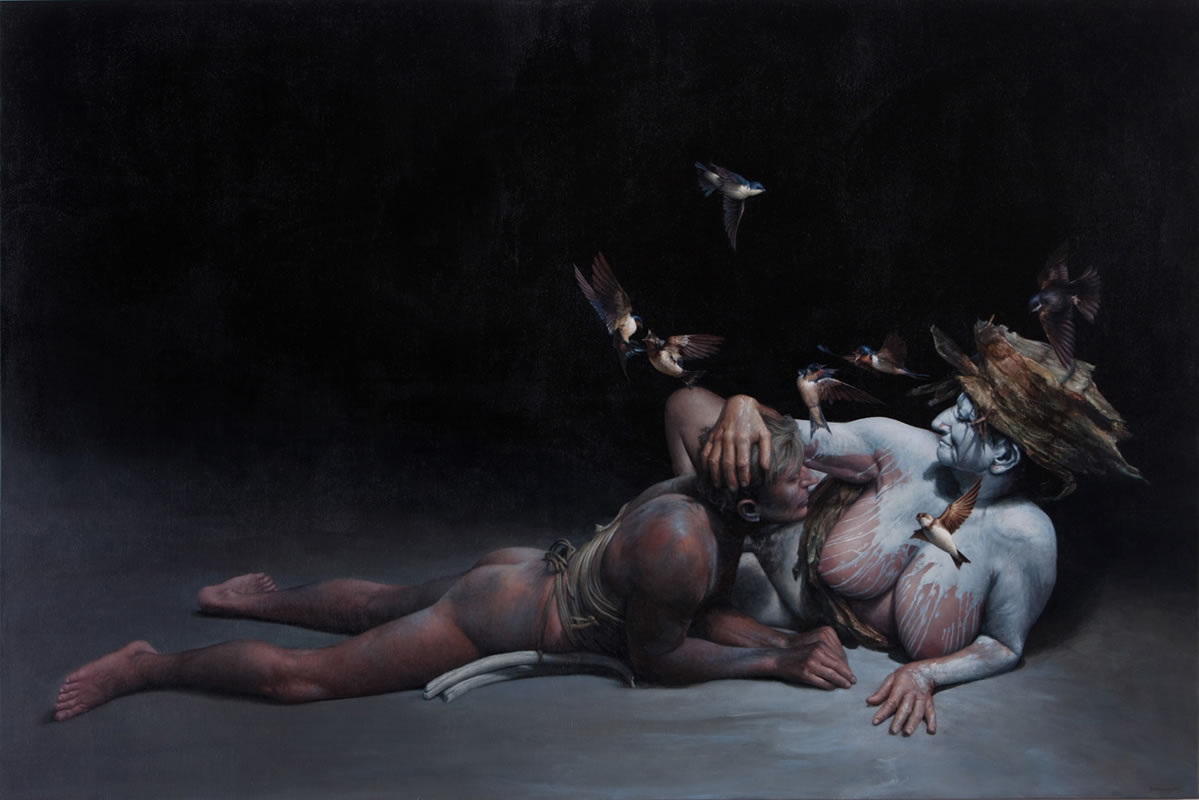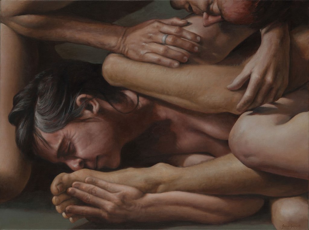 El autorretrato Chagrin de James Guppy es una reacción a varios autorretratos de artistas que lo han puesto un poco nervioso. «He visto algunos autorretratos de artistas donde el autoexhibicionismo es descarado, son tan directos», dice riendo. «Y algunos han sido hechos por artistas internacionales de renombre. Es como, ‘¡¿Qué es esto?!’ Es tan tonto.