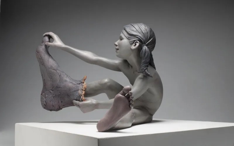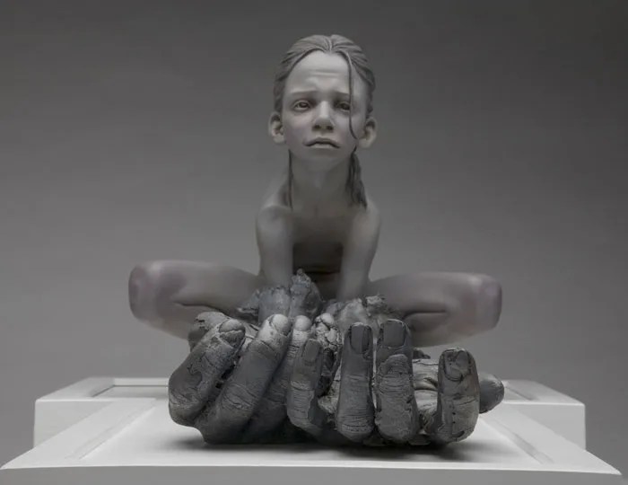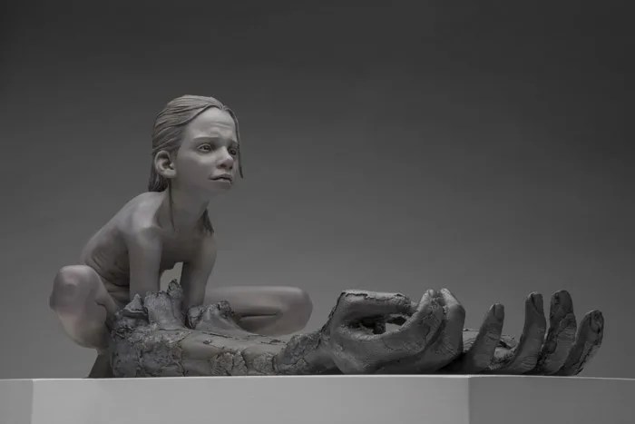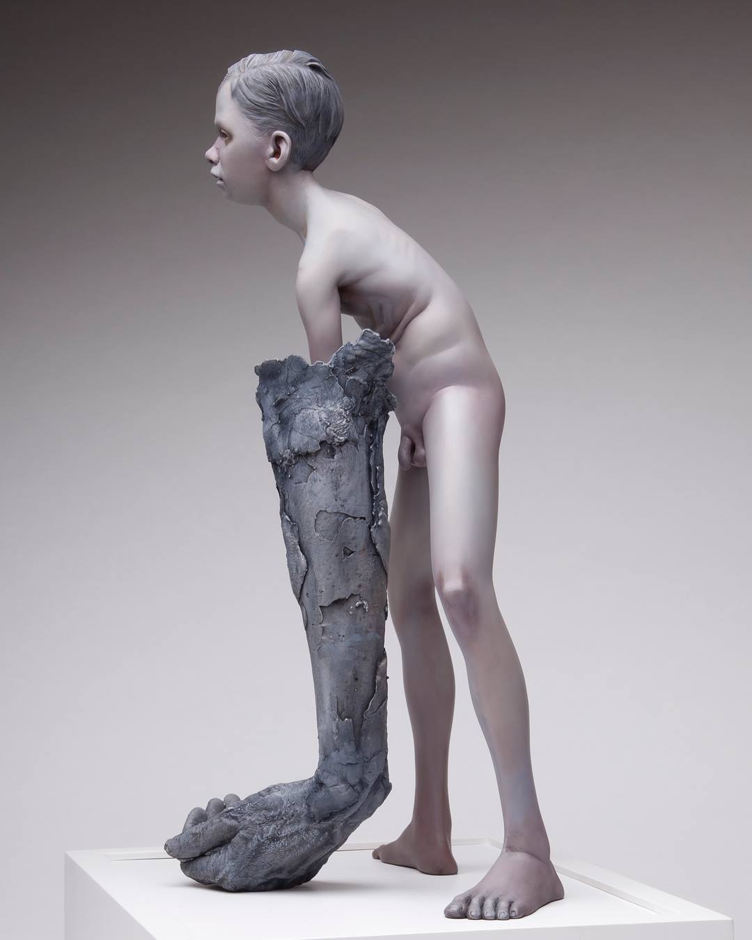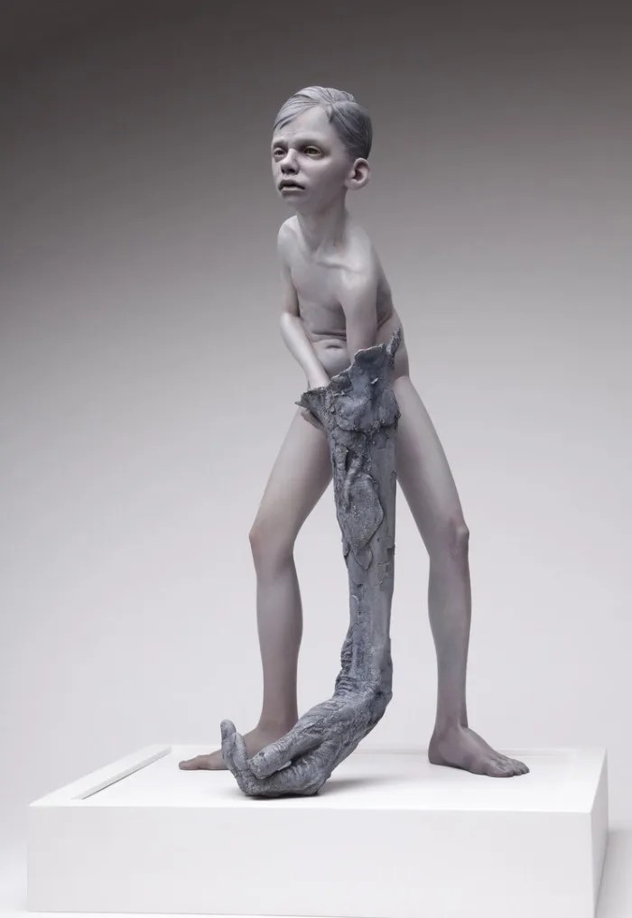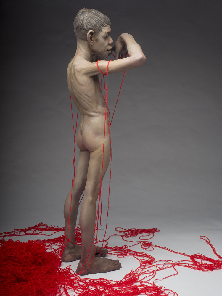«En el caso de la serie de esculturas «Vestirse», la creación de cada pieza implica dos procesos distintos: uno de control y orden, y el otro, opuesto, de descontrol e incitación al caos. El elemento figurativo se crea modelando a los niños en arcilla. Este proceso consiste en imponer o «dar forma» a partir de la arcilla. En cambio, los apéndices con los que se «disfrazan» los niños se moldean en vivo, un proceso que captura la forma directamente del sujeto mediante el moldeado y la fundición. Esto requiere menos interpretación y habilidad artística que la escultura tradicional».
