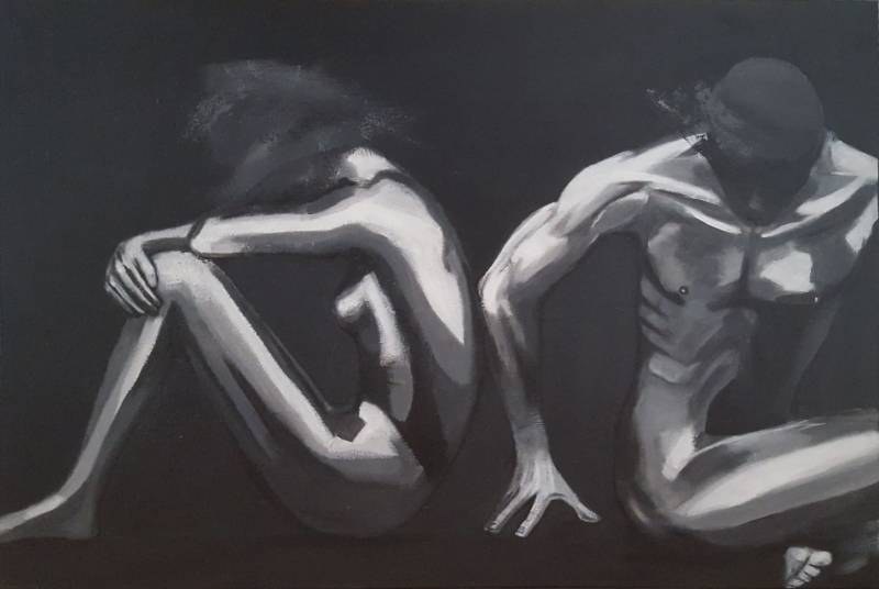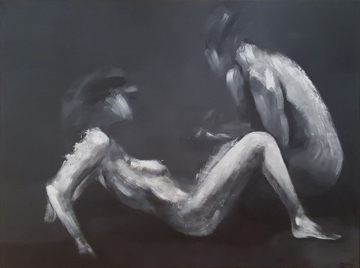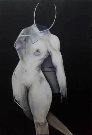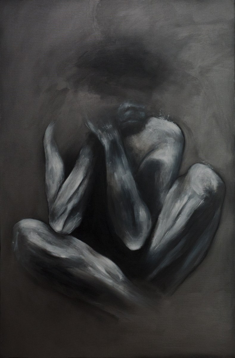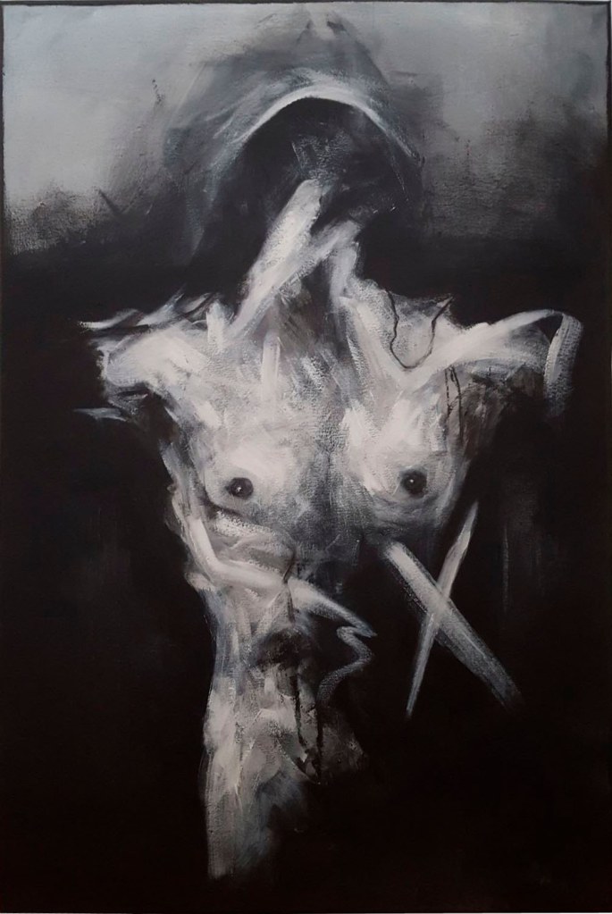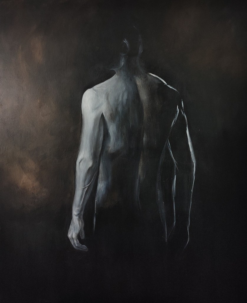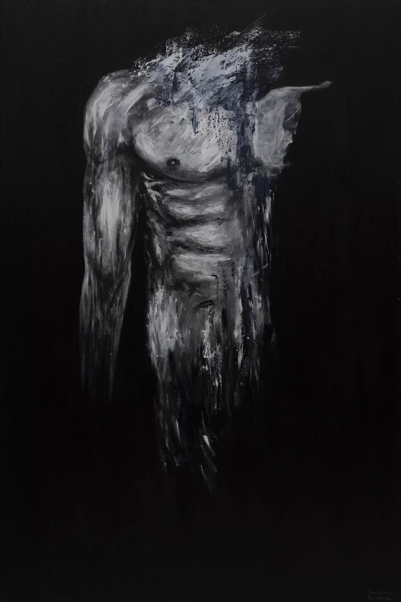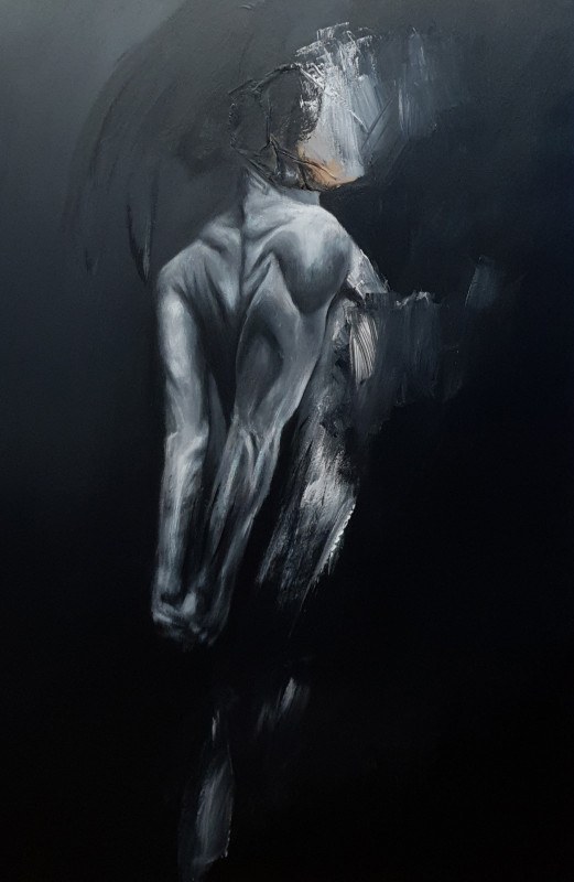 «Blanco y negro, dos mundos tan opuestos, pero tan apropiados. Extremos que crean armonía. Poder y misterio, sombra y luz. El hombre y el abismo. Un cuerpo experimentado con múltiples emociones, cargado de vergüenza, violencia, cercanía y dolor, a veces evoca miedo, a veces conmueve. […] Para mí, el cuerpo no es solo una maraña de partes anatómicas que constituyen los bloques de construcción de una silueta, sino sobre todo, una forma artística ideal. No me refiero a un estudio académico de la figura; pienso en el ser humano como un individuo que desafía las convenciones. Contrario a las normas aceptadas. Esto también se aplica a la pintura. La posibilidad de representar lo incompleto como una forma completamente completa. Una silueta sin cabeza, sin brazos, revelando solo el cuerpo, hundiéndose en la oscuridad o emergiendo del abismo. Movimiento, gesto, desenfoque, expresión, paz. Silencio y grito. Contraste».