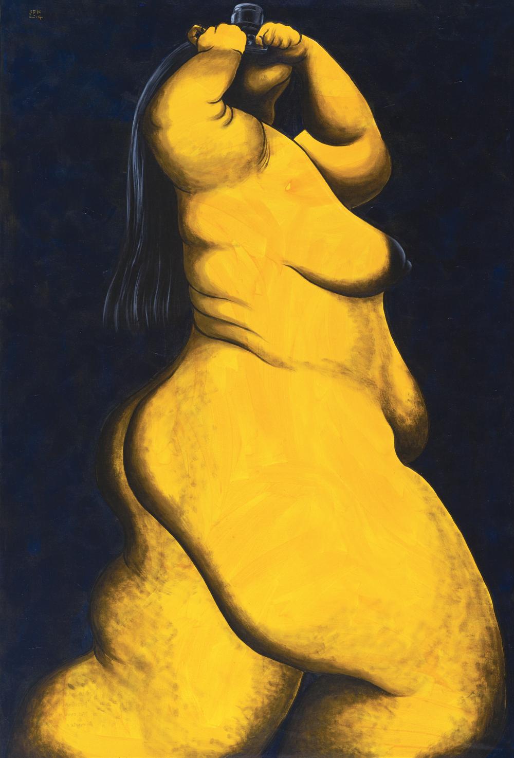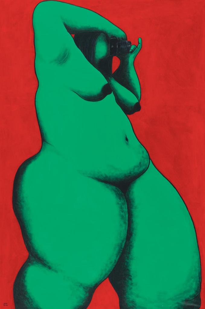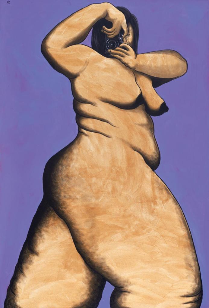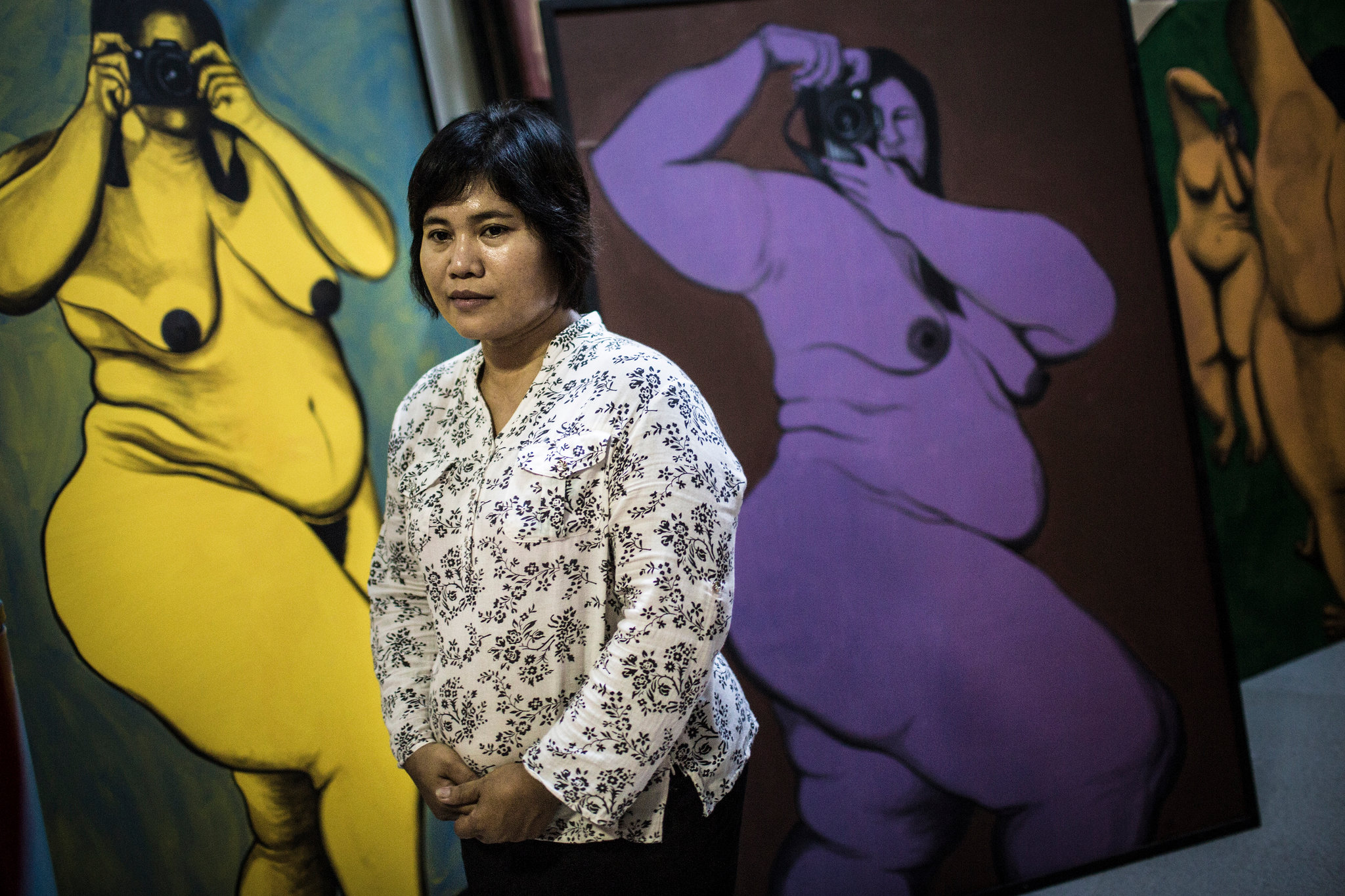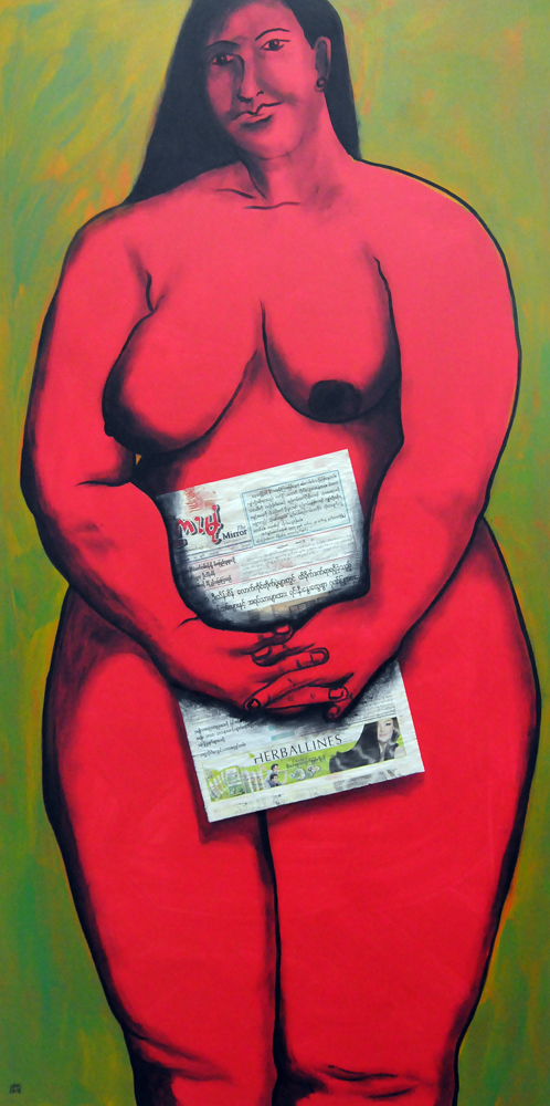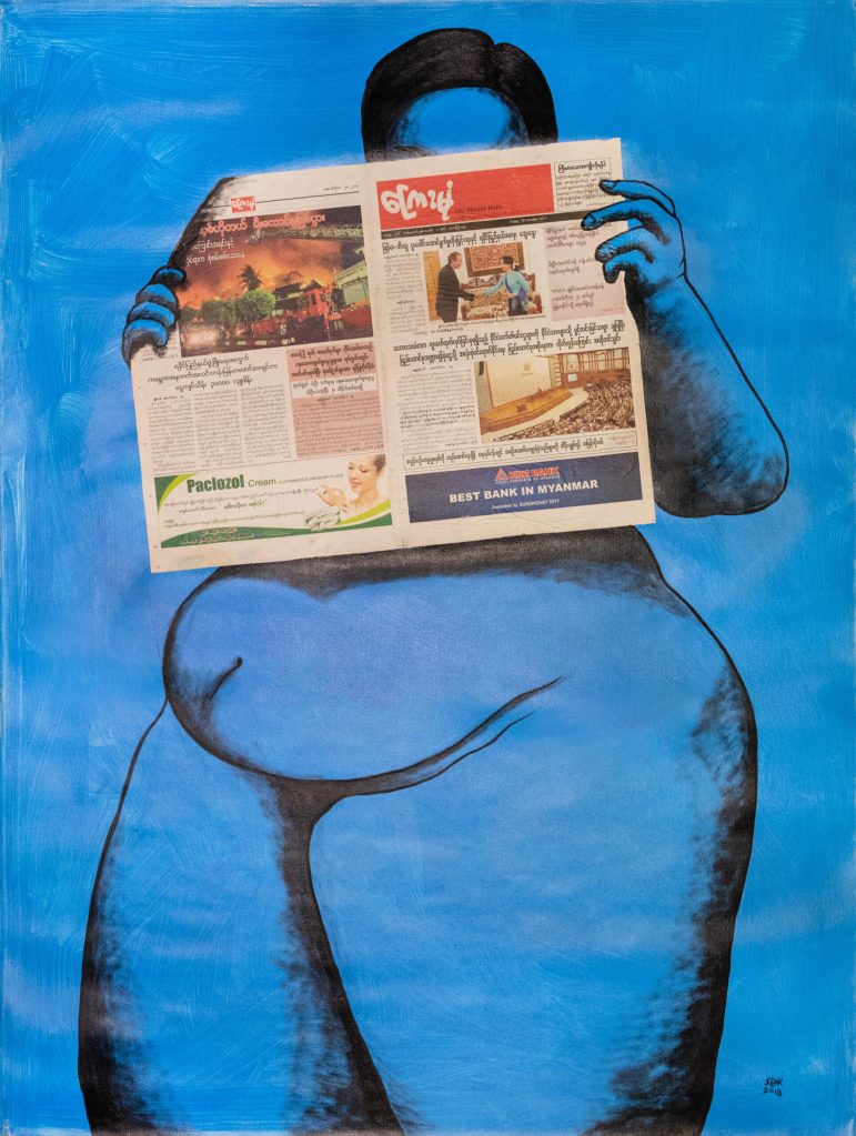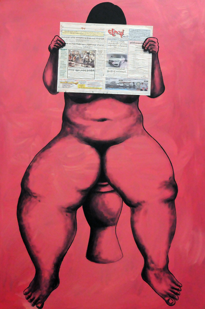 Sandar Khaing (Myanmar, 1971) es una artista conocida por sus coloristas pinturas que representan, generalmente a mujeres obesas tomando fotografías o leyendo el periódico The Mirror (?). Sus trabajos muestran el patriarcado y la censura imperante en su país, por lo que, pese a vivir en éste, raramente expone en él. Por el contrarios sus pinturas gozan de gran éxito en el sur de Asia, Japón, Australia y los Estados Unidos.
