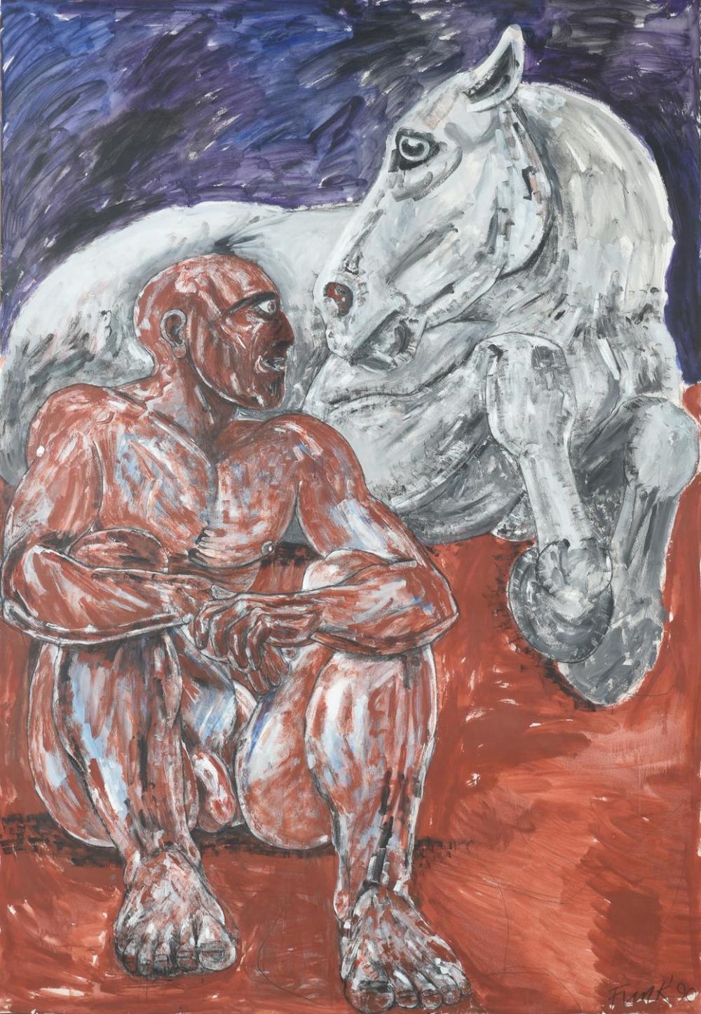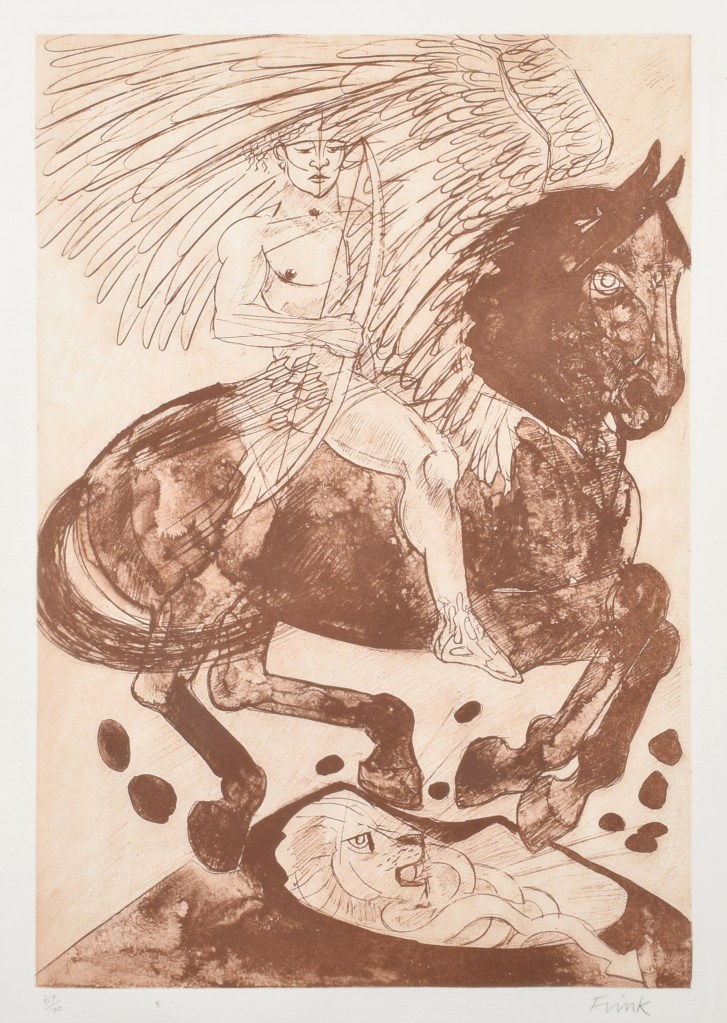 Elizabeth Frink (Suffolk, Reino Unido, 1930-1992) fue una pintora y escultora inglesa que se destacó por la representación de figuras masculinas, alguna figura religiosa, y en menor proporción animales. Casi nunca aparecen en sus obras representaciones femeninas. Miembro del grupo de escultores británicos conocido como «Geometry of Fear School» sus producciones se ven marcadas por su particular textura.