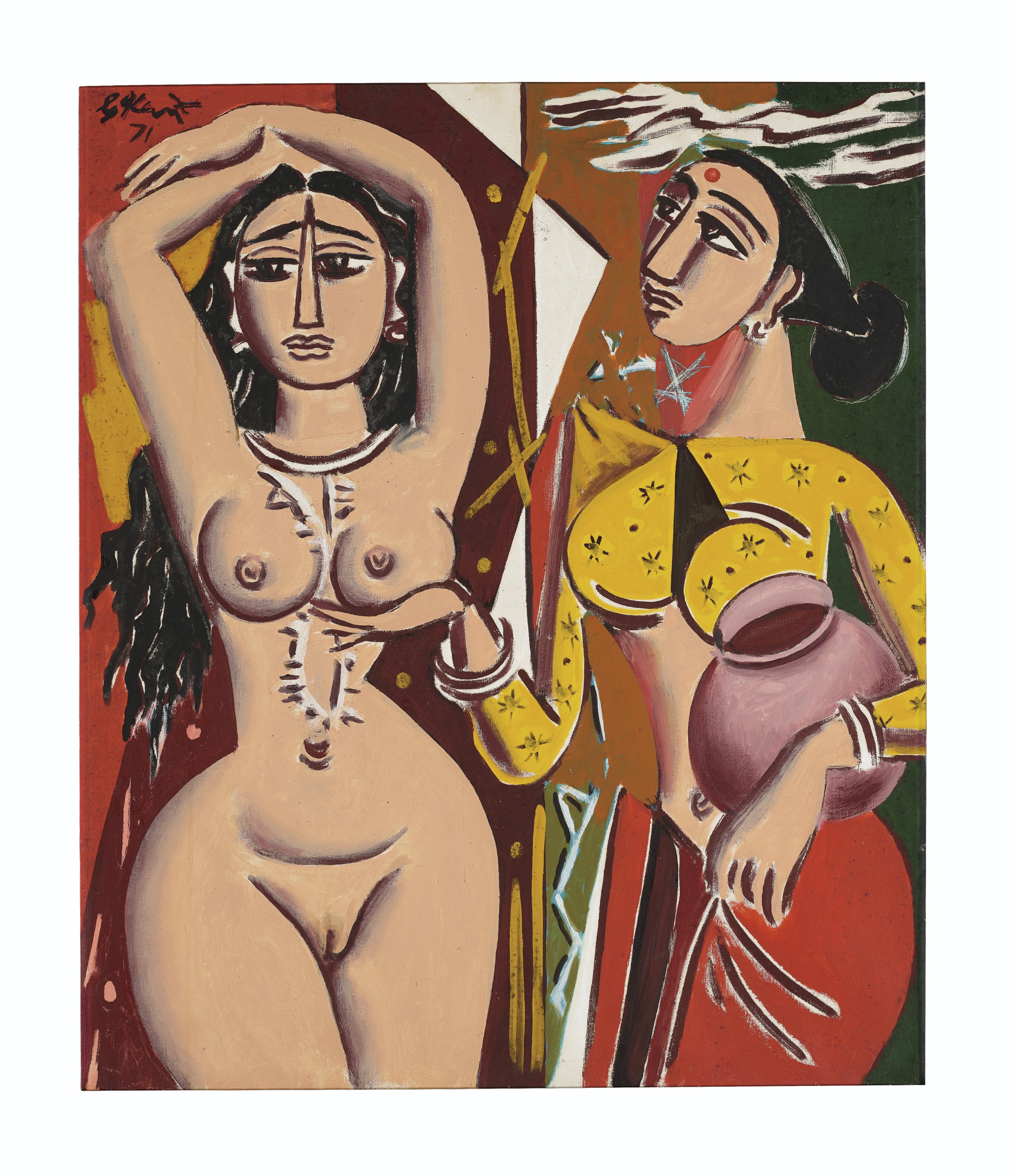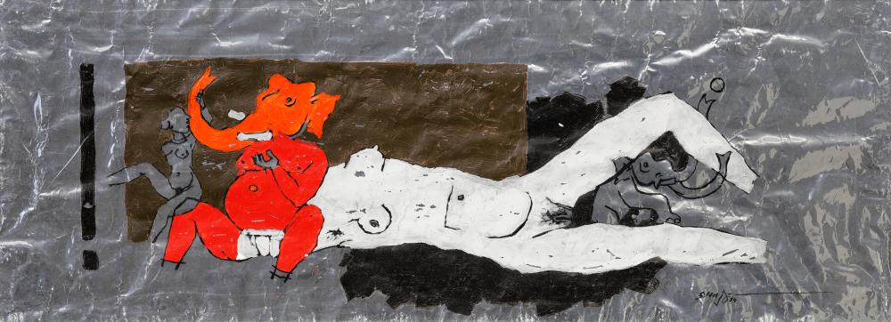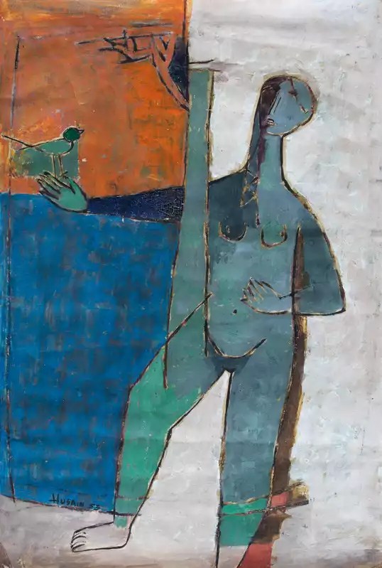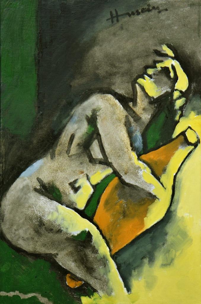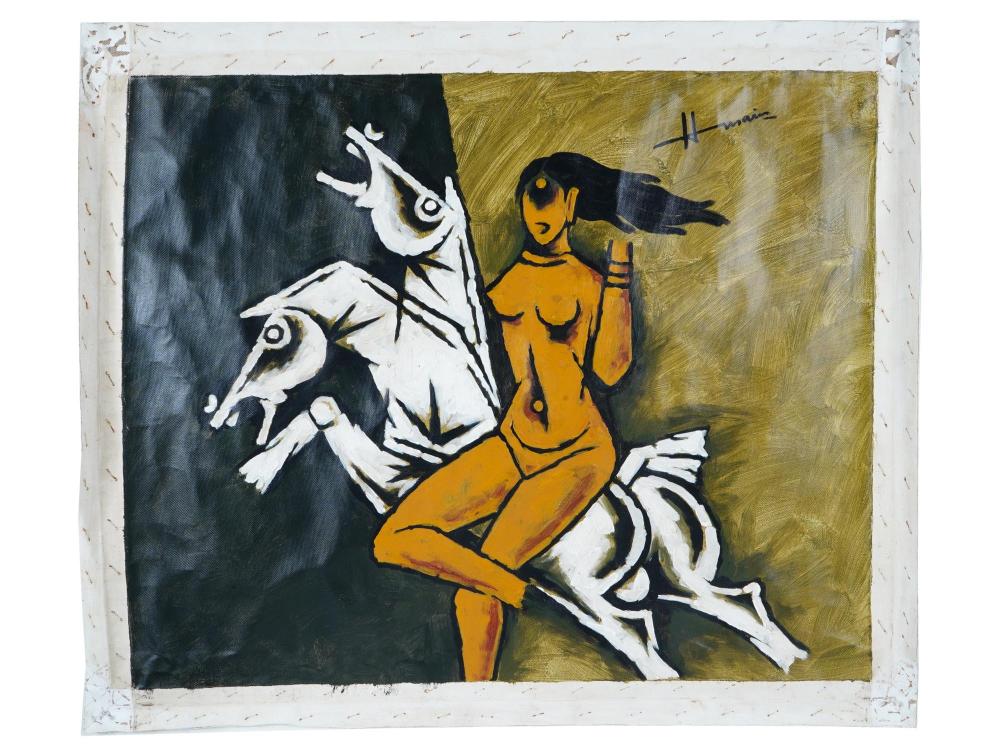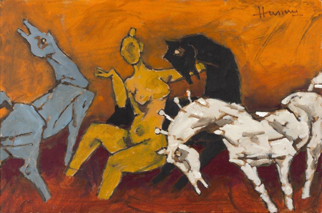 Maqbool Fida Husain (Pandharpur, India, 1915-2011) fue un pintor, fotógrafo y cineasta hindú creador de una obra fuertemente colorista, influenciada formalmente por Cézanne y Matisse, y temáticamente por el panteón de dioses y diosas de la tradición hindú. Perteneció al «Progressive Artists’ Group», en el que se reunió la vanguardia artística de su país. Obtuvo numerosos premios y su obra, a partir de 1971, se dió a conocer en todo el mundo.
