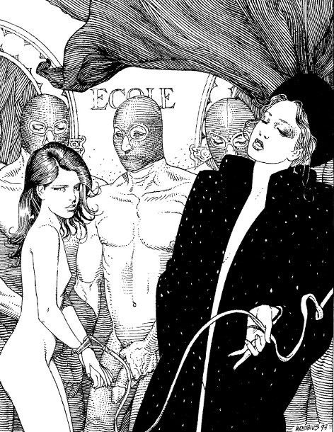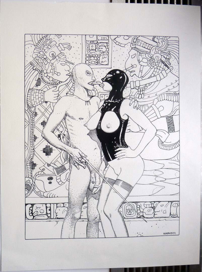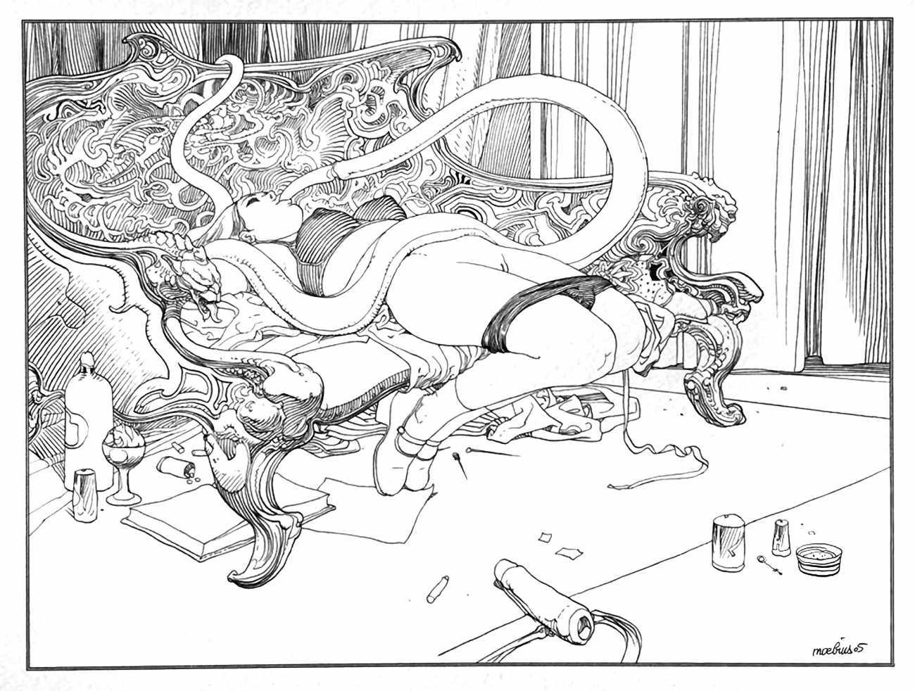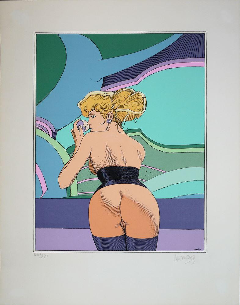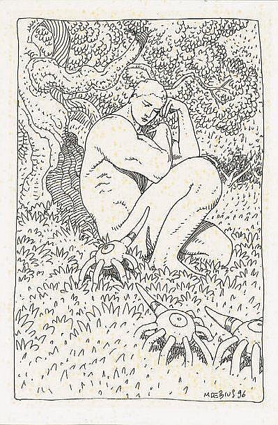 Jean Giraud, más conocido por su pseudónimo Moebius (Nogent-sur-Marne, Sena, Francia, 1938-2012), ilustrador, se le considera el artista de cómics más influyente de Francia después de Hergé. Su colaboración con Alejandro Jodorowsky, el artista y cineasta chileno de vanguardia, dio lugar a importantes series como la del Incal. Su obra, de carácter fantástico, es bastante variada. No es, propiamente un dibujante de desnudos, pues no intenta imponer los mismos dentro del desarrollo de las obras ilustradas, pero sí nos encontramos algunos ejemplos de ilustraciones que muestran desnudos eróticos. Giraud comentó en Artfutura: