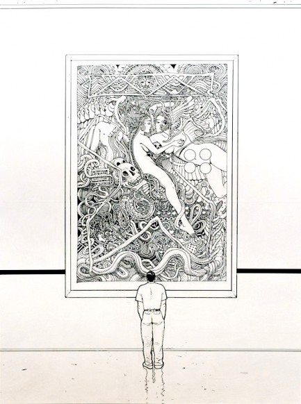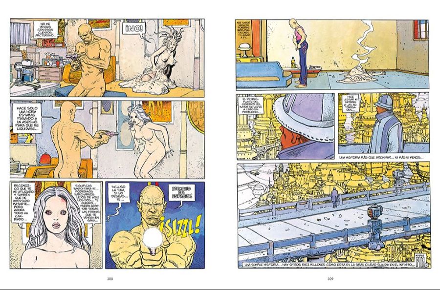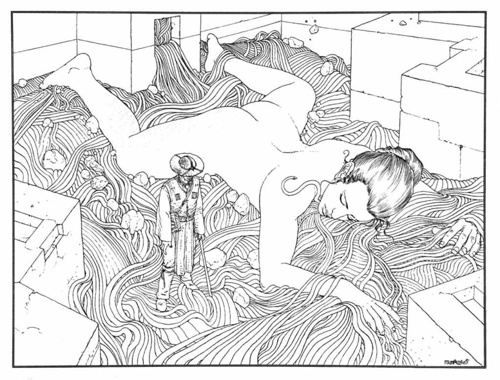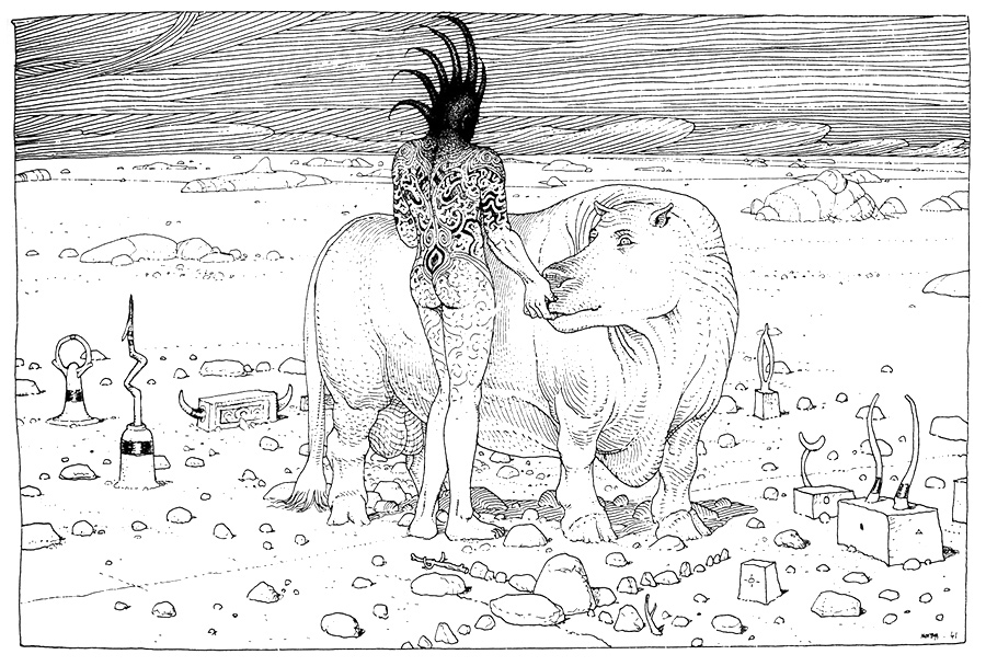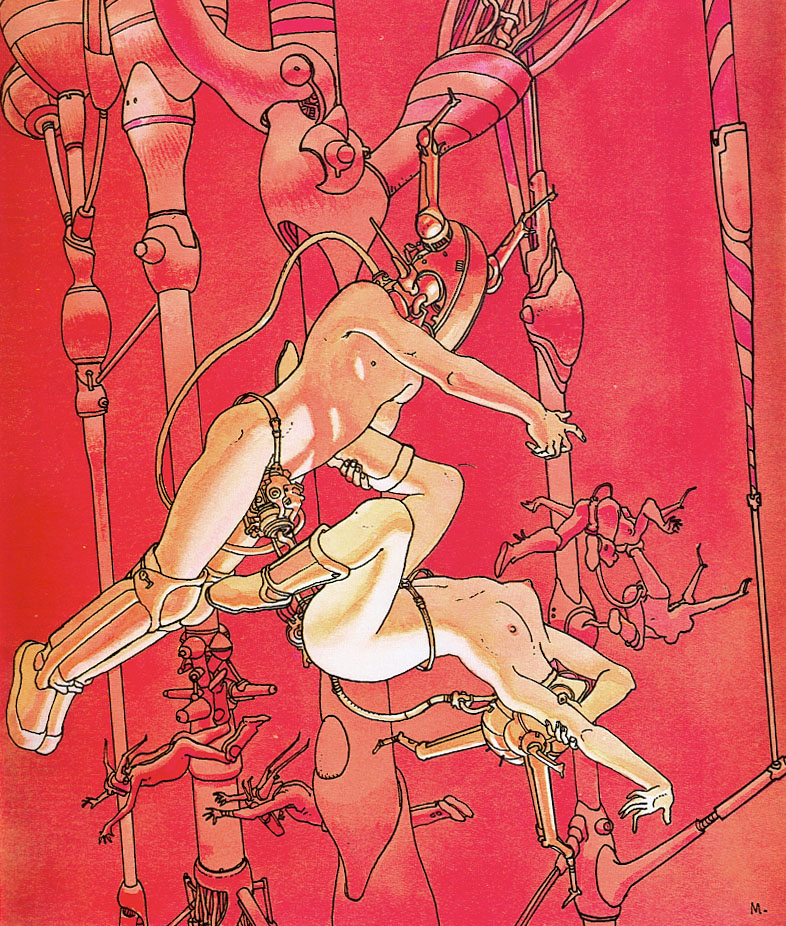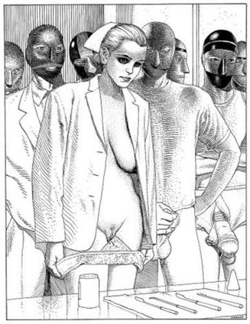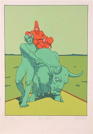 Jean Giraud, más conocido por su pseudónimo Moebius (Nogent-sur-Marne, Sena, Francia, 1938-2012), ilustrador, se le considera el artista de cómics más influyente de Francia después de Hergé. Su colaboración con Alejandro Jodorowsky, el artista y cineasta chileno de vanguardia, dio lugar a importantes series como la del Incal. Su obra, de carácter fantástico, es bastante variada. No es, propiamente un dibujante de desnudos, pues no intenta imponer los mismos dentro del desarrollo de las obras ilustradas, pero sí nos encontramos algunos ejemplos de ilustraciones que muestran desnudos eróticos. Giraud comentó en Artfutura: