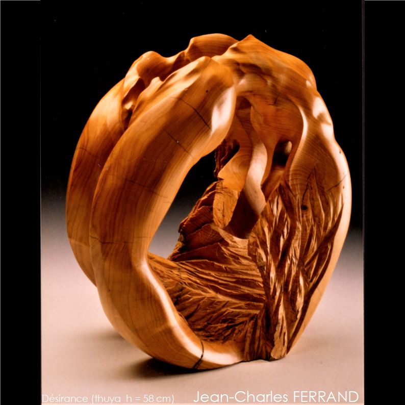 Jean-Charles Ferrand (Mouchamps en Vendée, Francia, 1955) es un escultor. que trabaja el bronce y, fundamentalmente, la madera. Sus obras en las que dominan las curvas sobre las rectas y en las que se equilibran los espacios llenos y vacíos, muestran, para mí, una especial poesía. No hay muchos comentarios ni críticas sobre las mismas en Internet. El artista parece haber dejado la comercialización de las mismas en varias plataformas de la Red.