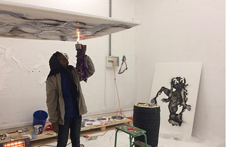 «Finalizó sus estudios de pintura en el Instituto de Bellas Artes de Kinshasa en 2012. Insatisfecha con sus pinturas, quemó sus lienzos. Entonces comenzó a pintar con el humo de una lámpara de aceite, vinculando su arte con los traumas de su infancia: la noche, el fuego y los espíritus. Concibiendo el arte como una forma de apaciguar el alma, Géraldine Tobe ha creado una estructura cultural (Losa) en Kinshasa que organiza talleres de arteterapia para pacientes psiquiátricos.