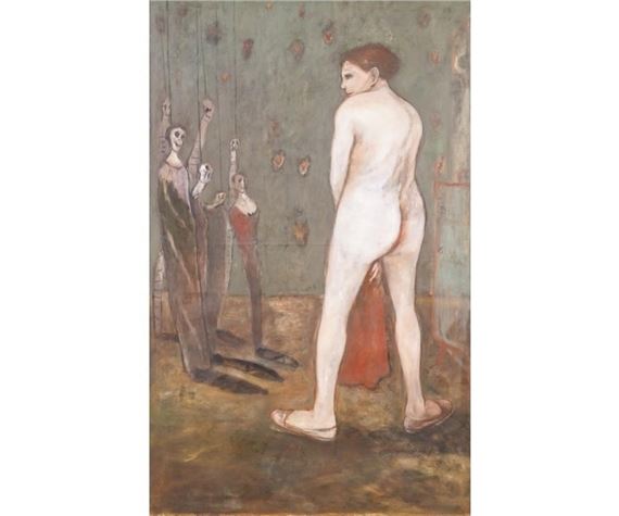 «Katsura Funakoshi fue considerado una figura destacada en el campo de las artes visuales en Japón. Talladas meticulosamente en madera de alcanfor, sus torsos híbridos tienen una piel sutilmente modelada y ojos de mármol luminiscentes que interactúan tanto con la fantasía como con la realidad. Humanas y surrealistas, sus figuras son tótems para la conexión entre la mente y el cuerpo y tienen una gran presencia poética y etérea; una profunda quietud y quietud en los ojos y expresiones faciales, extraordinariamente directas pero serenas y sublimes. En sus obras posteriores, guirnaldas hechas de libros, frutas, cuerpos voladores y manos flotantes se extienden desde los hombros y las cabezas de las figuras encarnando sus sueños y pensamientos. De estas obras, el artista dijo: «Cuando algo sucede, puedo ver muchas cosas que se elevan desde el hombro de una persona, como una aurora y un arcoíris, orbitando sobre la cabeza».