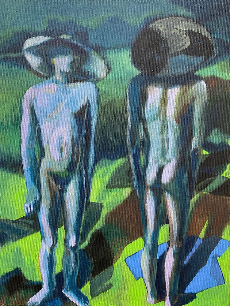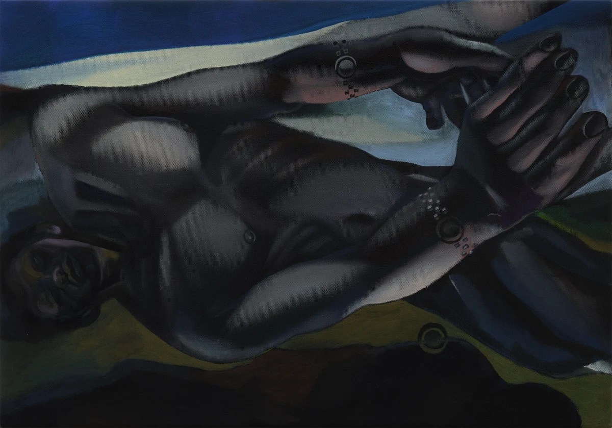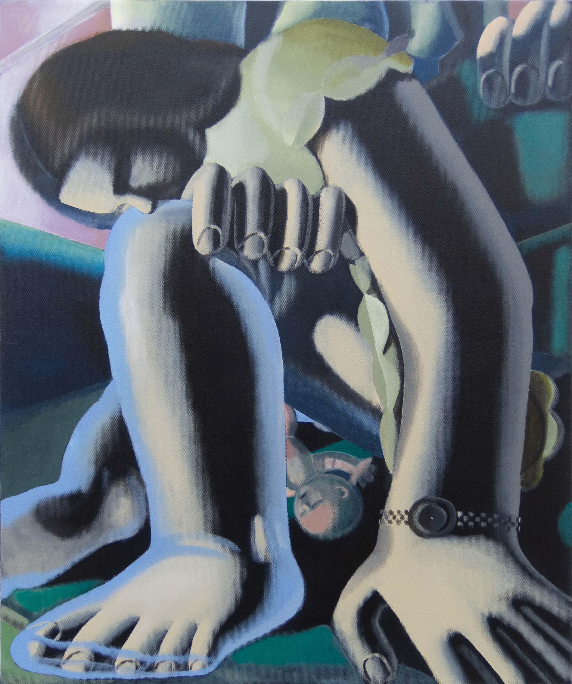 «La búsqueda de Misyuta por expresar esta forma de intimidad se ve reforzada por la presencia de algunos objetos recurrentes y llenos de significado simbólico, como relojes, flores o espejos. Los relojes sin marcadores horarios, por ejemplo, representan una especie de manifiesto feminista contra las expectativas patriarcales centradas en la racionalización del tiempo, a saber: la productividad… y la maternidad. «El tiempo avanza», nos recuerda Misyuta, es la frase más común dirigida a las mujeres de su país natal y de otros lugares, cuando llegan a la edad en que se espera que formen una familia. En sus pinturas, las figuras que llevan relojes son, por lo tanto, rebeldes silenciosas que celebran el llamado acto de «perder el tiempo». El título de su primera exposición en París (hasta el 6 de mayo de 2023), «Lazy Self Embrace», ilustra una vez más este pensamiento recurrente en la obra de la artista: robustas y frágiles a la vez, las figuras parecen reivindicar su derecho incondicional a holgazanear. El proceso creativo es otro rasgo distintivo de su obra: Aks Misyuta pinta mucho y con rapidez. La artista trabaja de forma espontánea, desde su propia intuición, y nunca realiza trabajos preliminares para sus pinturas».