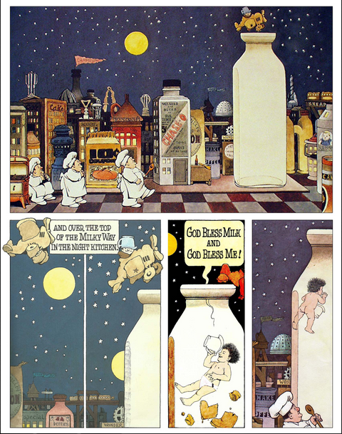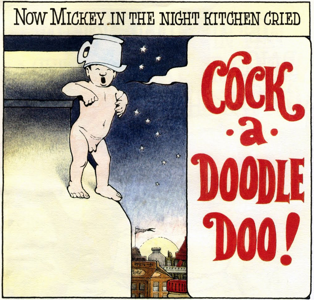 «La prohibición y censura de In The Night Kitchen se produjo en última instancia porque algunos adultos que leyeron el libro creen que la desnudez del personaje principal, Mickey, carece de propósito en la historia («Estudio de caso»). No sorprende, entonces, que la razón principal por la que se cuestiona el libro sea por la desnudez de Mickey. Otros lectores de la historia ven la botella de leche como «fálica», lo que los ofende debido al estilo de vida abiertamente homosexual del autor (Vélez).»
